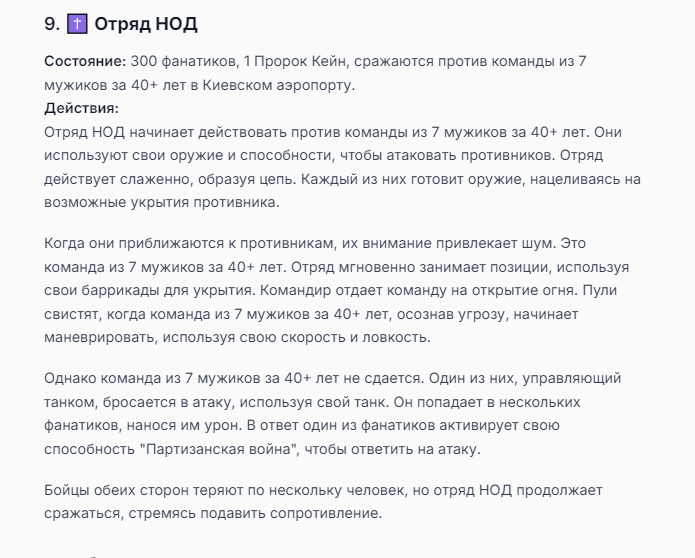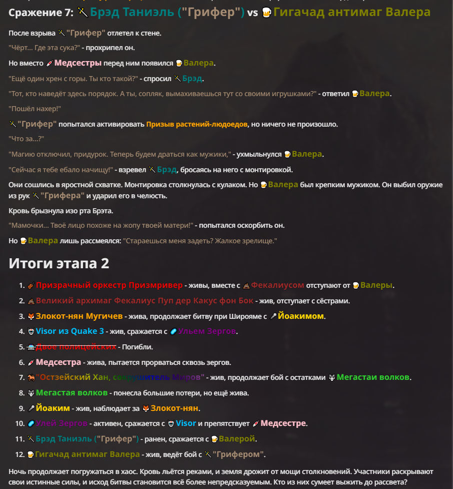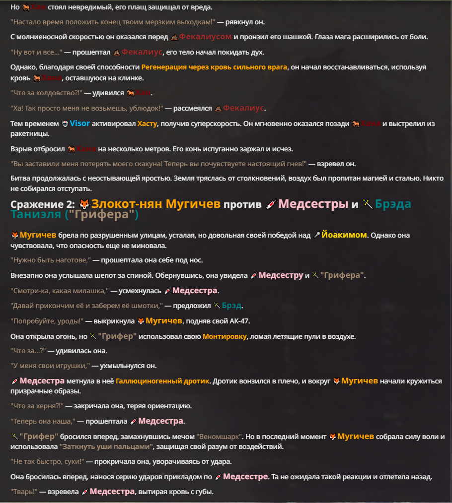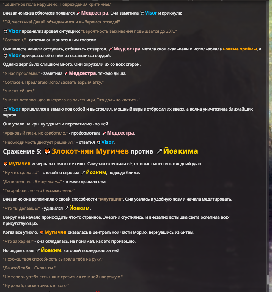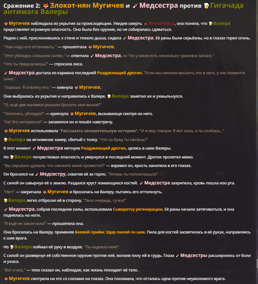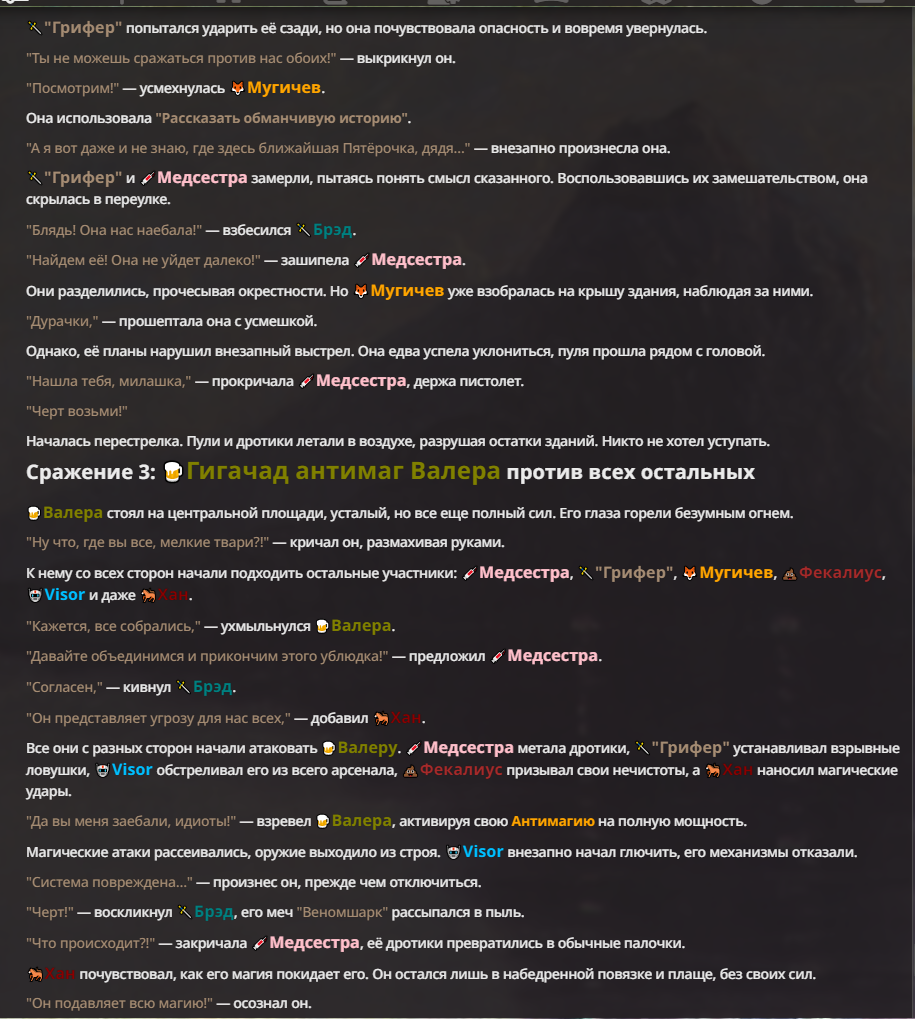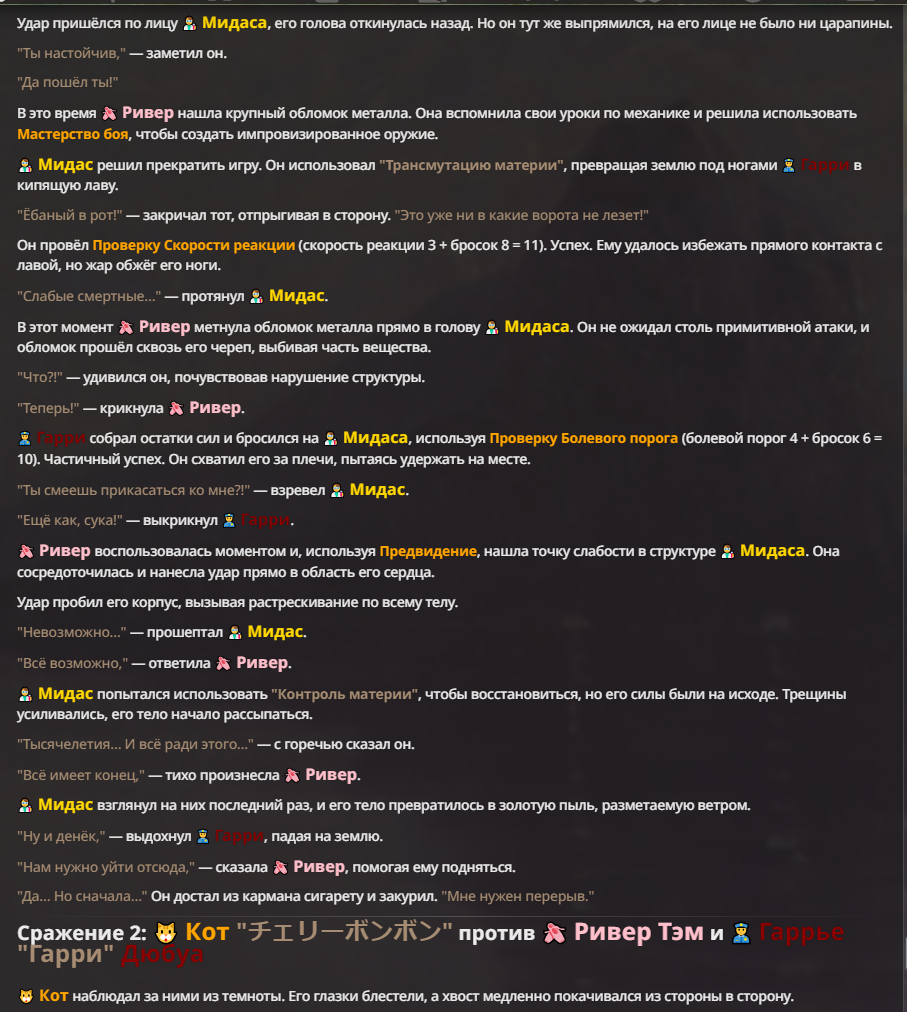 Я ебал аноны. Хуета какая. Гопота проебывает персонажей, путает способности, не может нормально отобразить потери. Чет я не справляюсь, мб промт хуйня, мб версия гопоты не так. Я спать. Приношу извинения что не смог провести нормальных боев и так сильно выебывался на Злокота.
