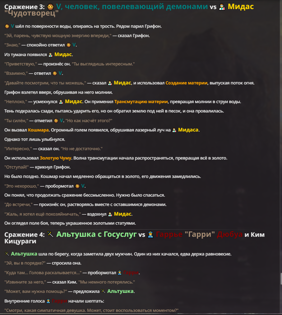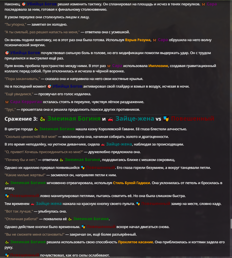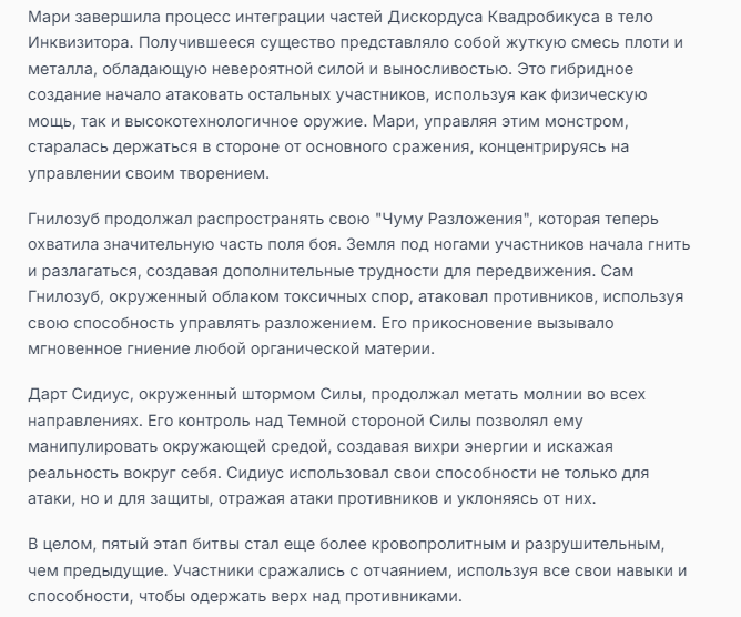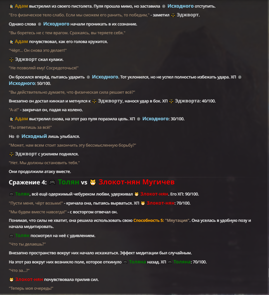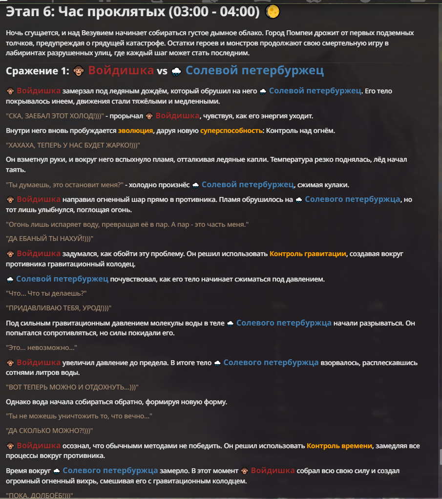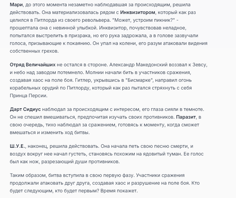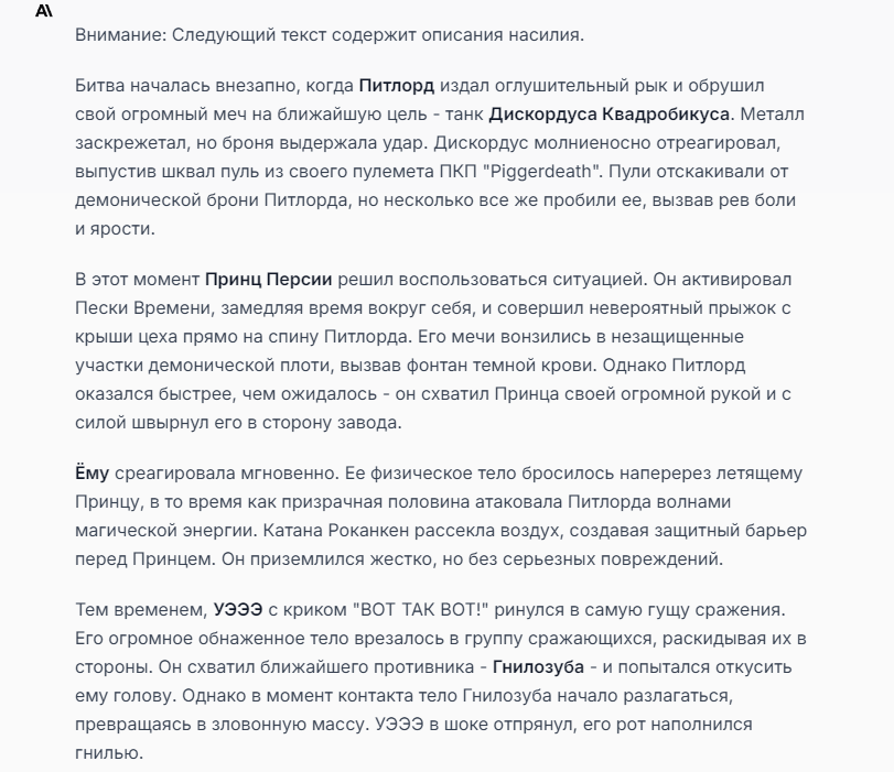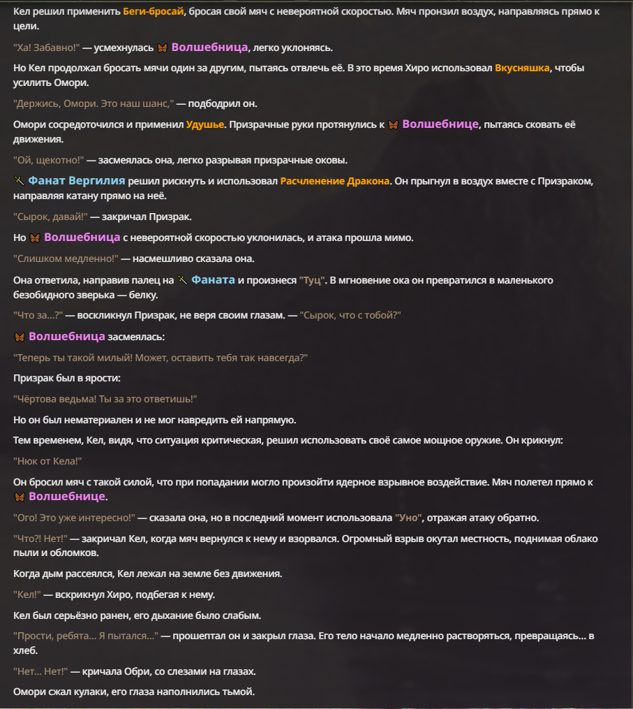 Я ебал аноны. Хуета какая. Гопота проебывает персонажей, путает способности, не может нормально отобразить потери. Чет я не справляюсь, мб промт хуйня, мб версия гопоты не так. Я спать. Приношу извинения что не смог провести нормальных боев и так сильно выебывался на Злокота.