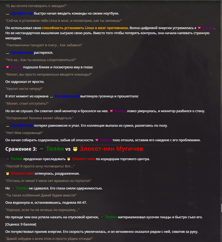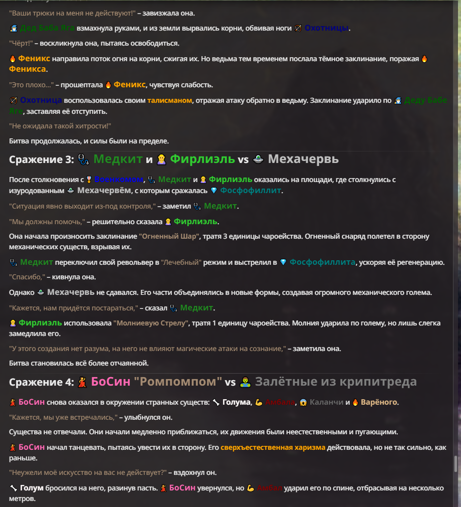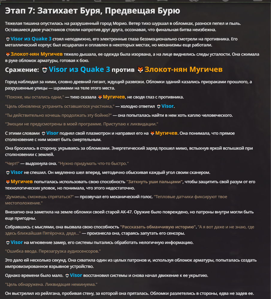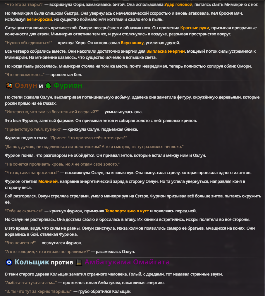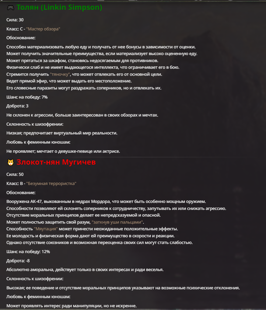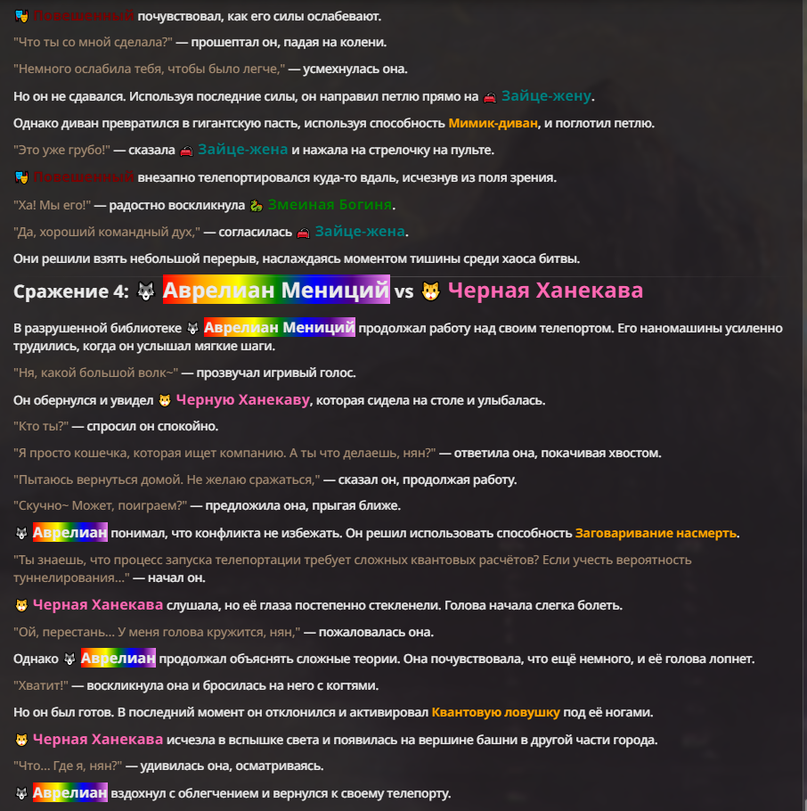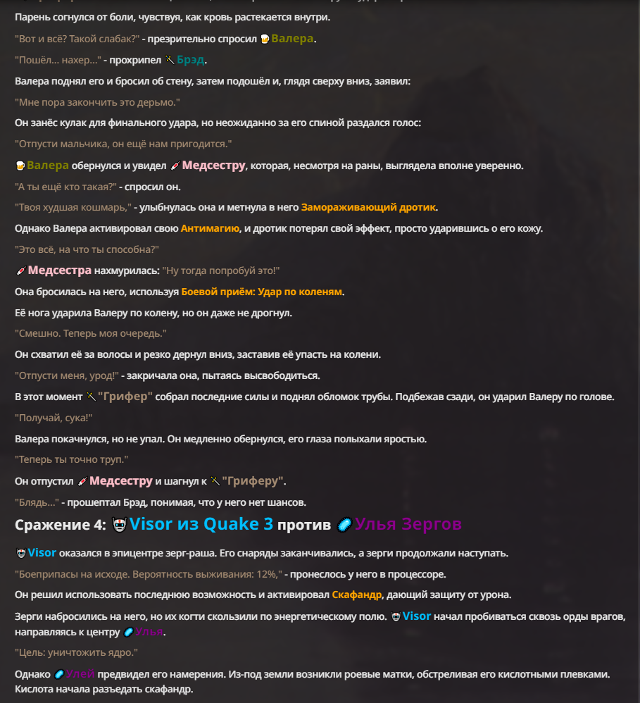 Я ебал аноны. Хуета какая. Гопота проебывает персонажей, путает способности, не может нормально отобразить потери. Чет я не справляюсь, мб промт хуйня, мб версия гопоты не так. Я спать. Приношу извинения что не смог провести нормальных боев и так сильно выебывался на Злокота.