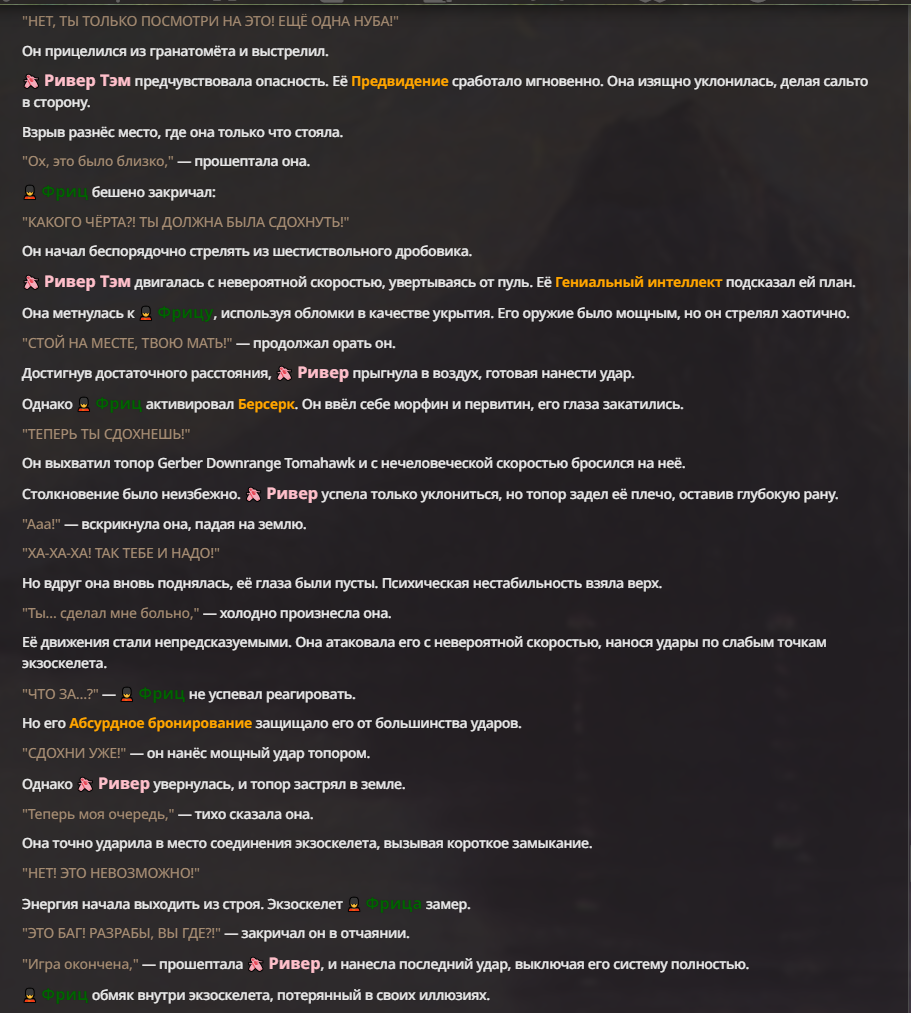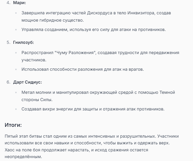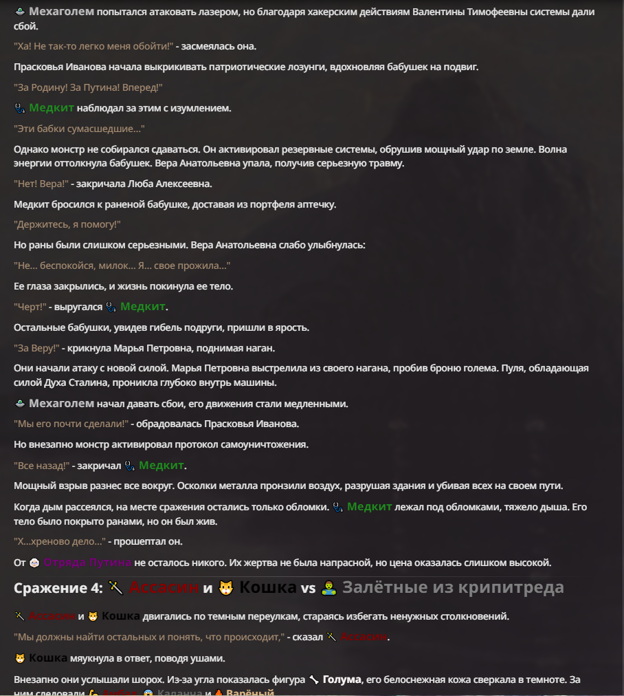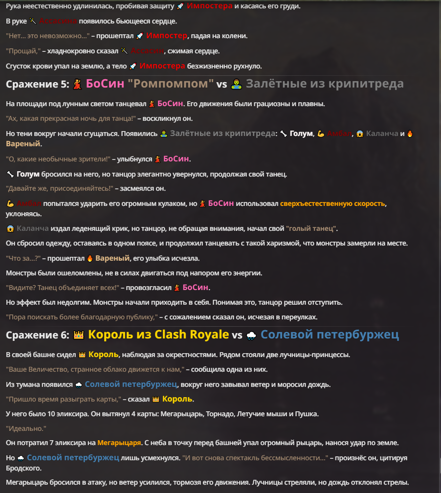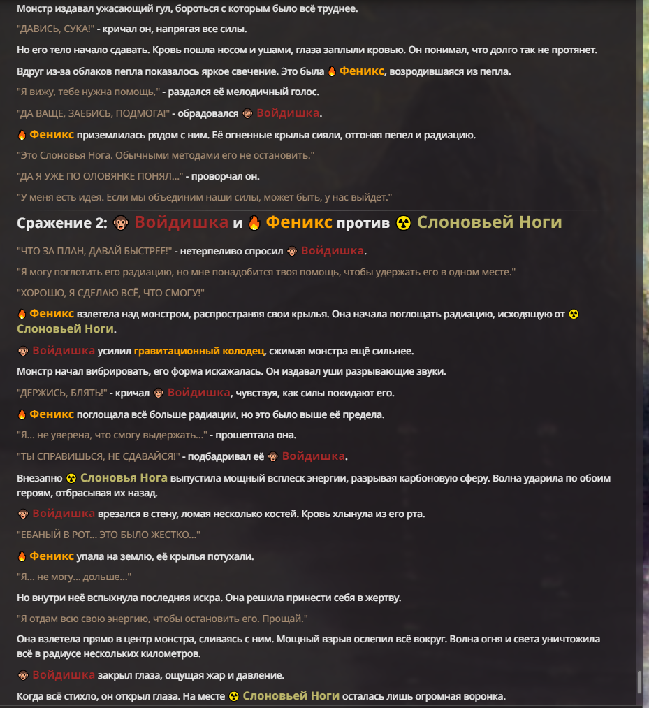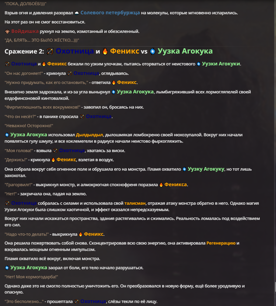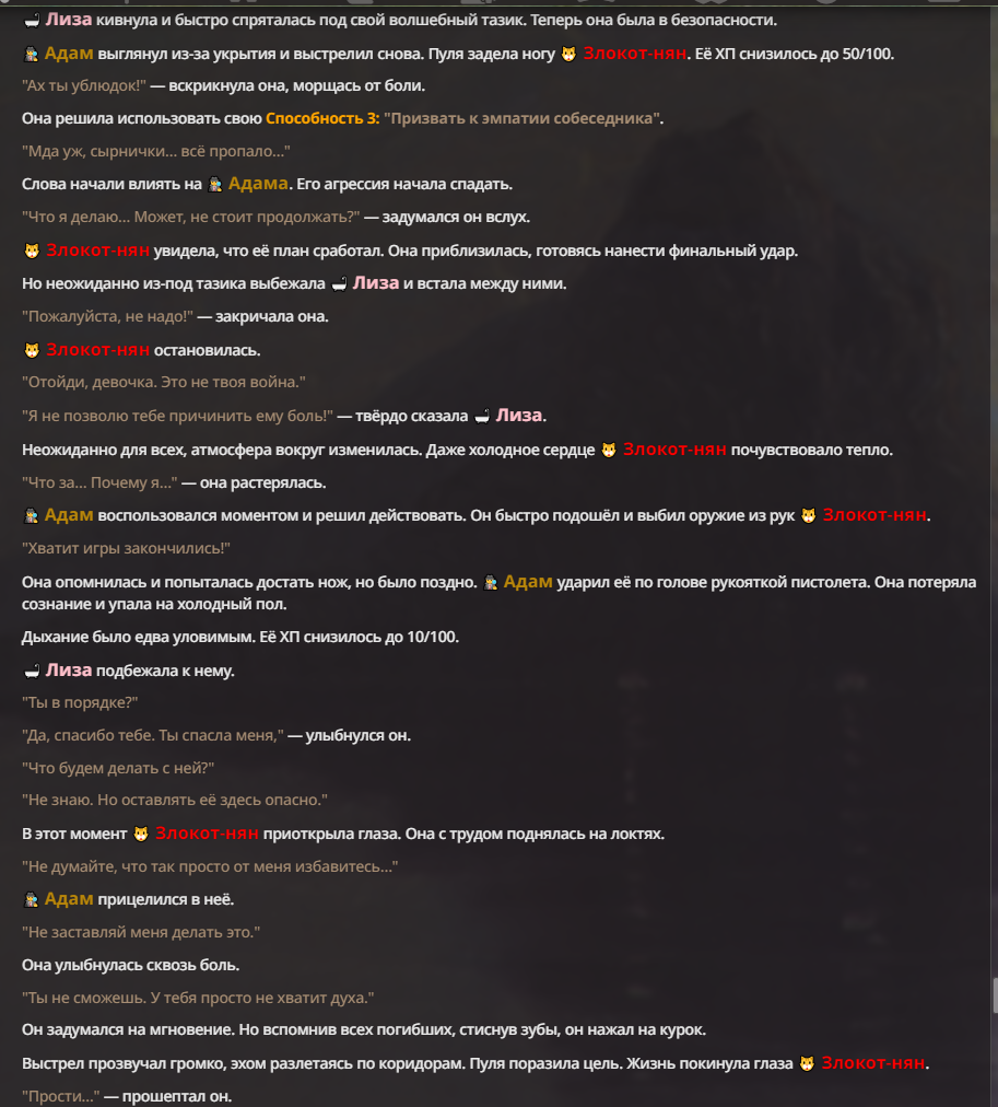 Я ебал аноны. Хуета какая. Гопота проебывает персонажей, путает способности, не может нормально отобразить потери. Чет я не справляюсь, мб промт хуйня, мб версия гопоты не так. Я спать. Приношу извинения что не смог провести нормальных боев и так сильно выебывался на Злокота.