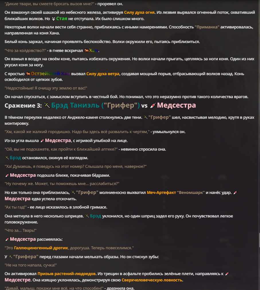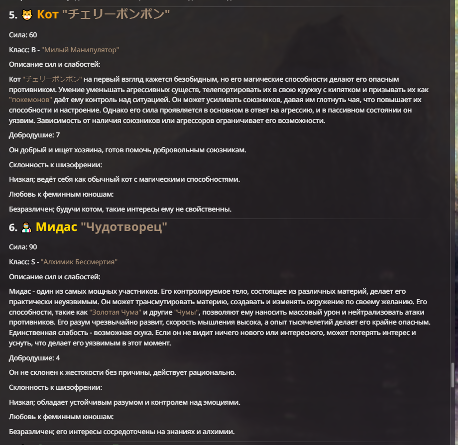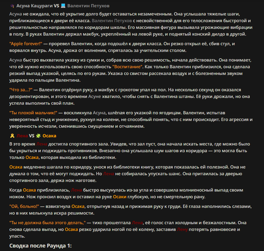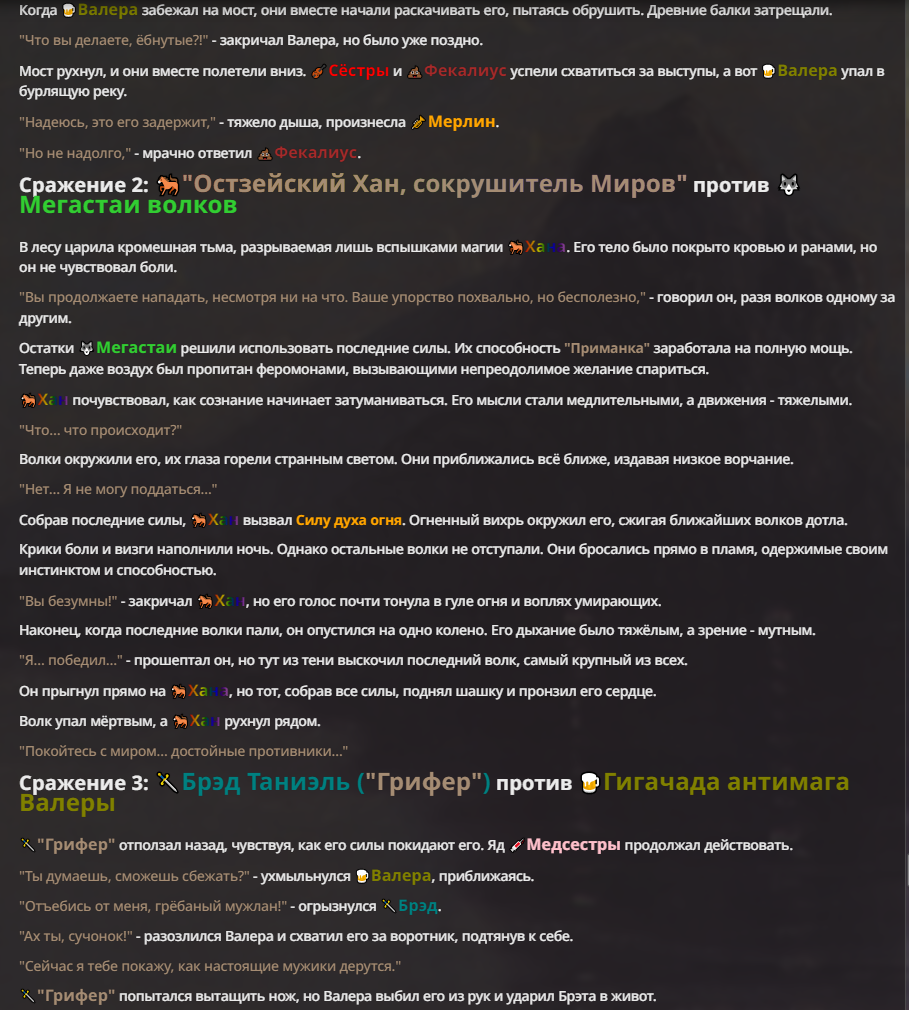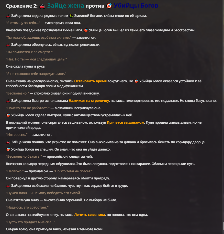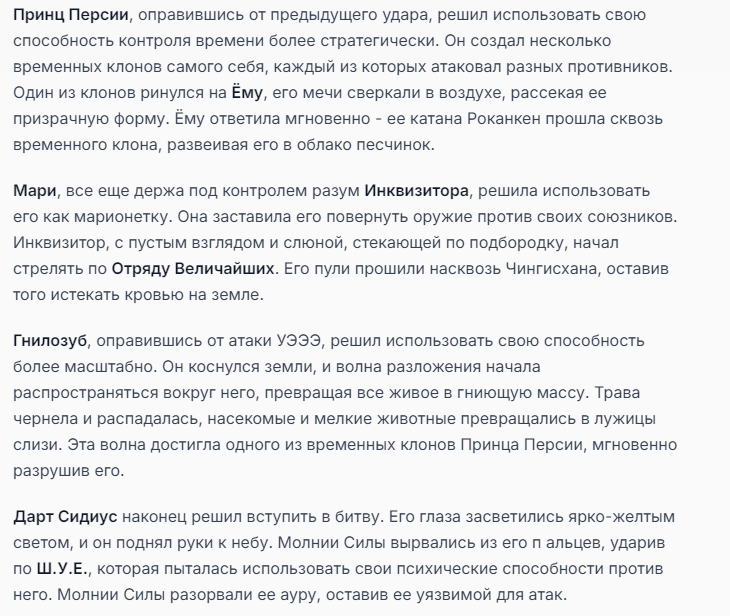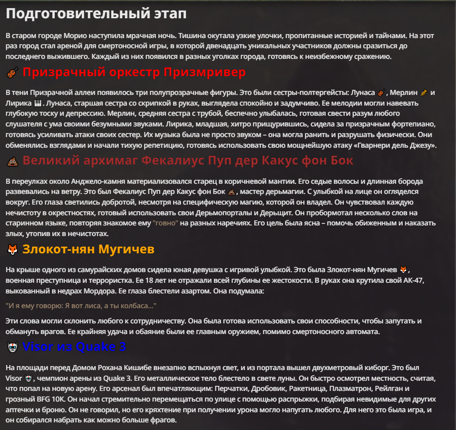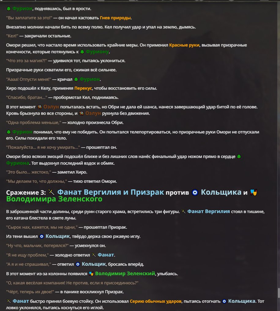 Я ебал аноны. Хуета какая. Гопота проебывает персонажей, путает способности, не может нормально отобразить потери. Чет я не справляюсь, мб промт хуйня, мб версия гопоты не так. Я спать. Приношу извинения что не смог провести нормальных боев и так сильно выебывался на Злокота.