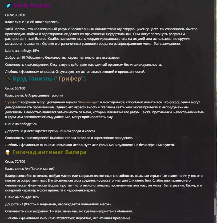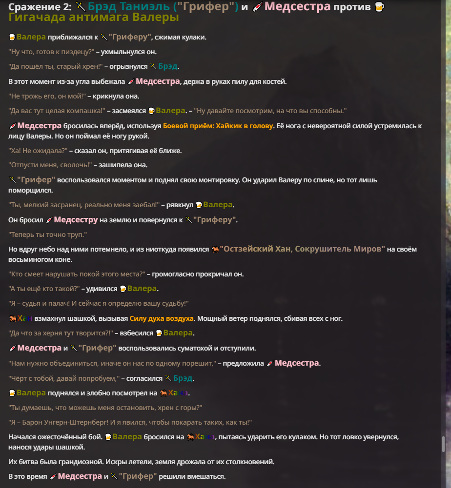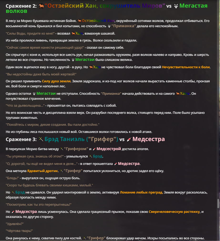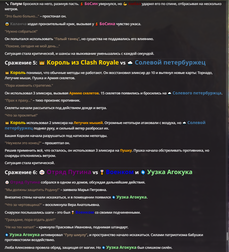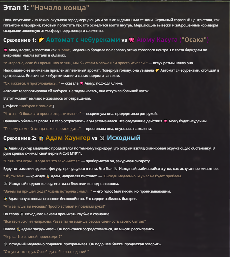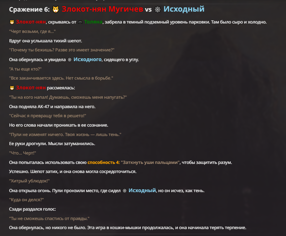 Я ебал аноны. Хуета какая. Гопота проебывает персонажей, путает способности, не может нормально отобразить потери. Чет я не справляюсь, мб промт хуйня, мб версия гопоты не так. Я спать. Приношу извинения что не смог провести нормальных боев и так сильно выебывался на Злокота.