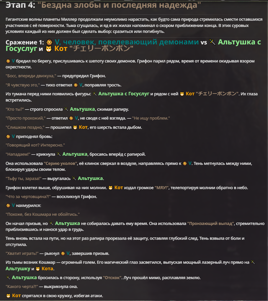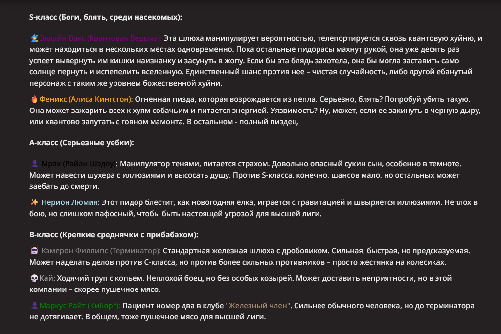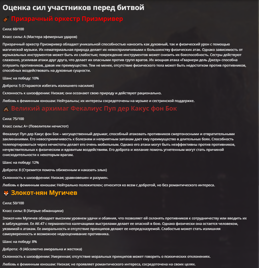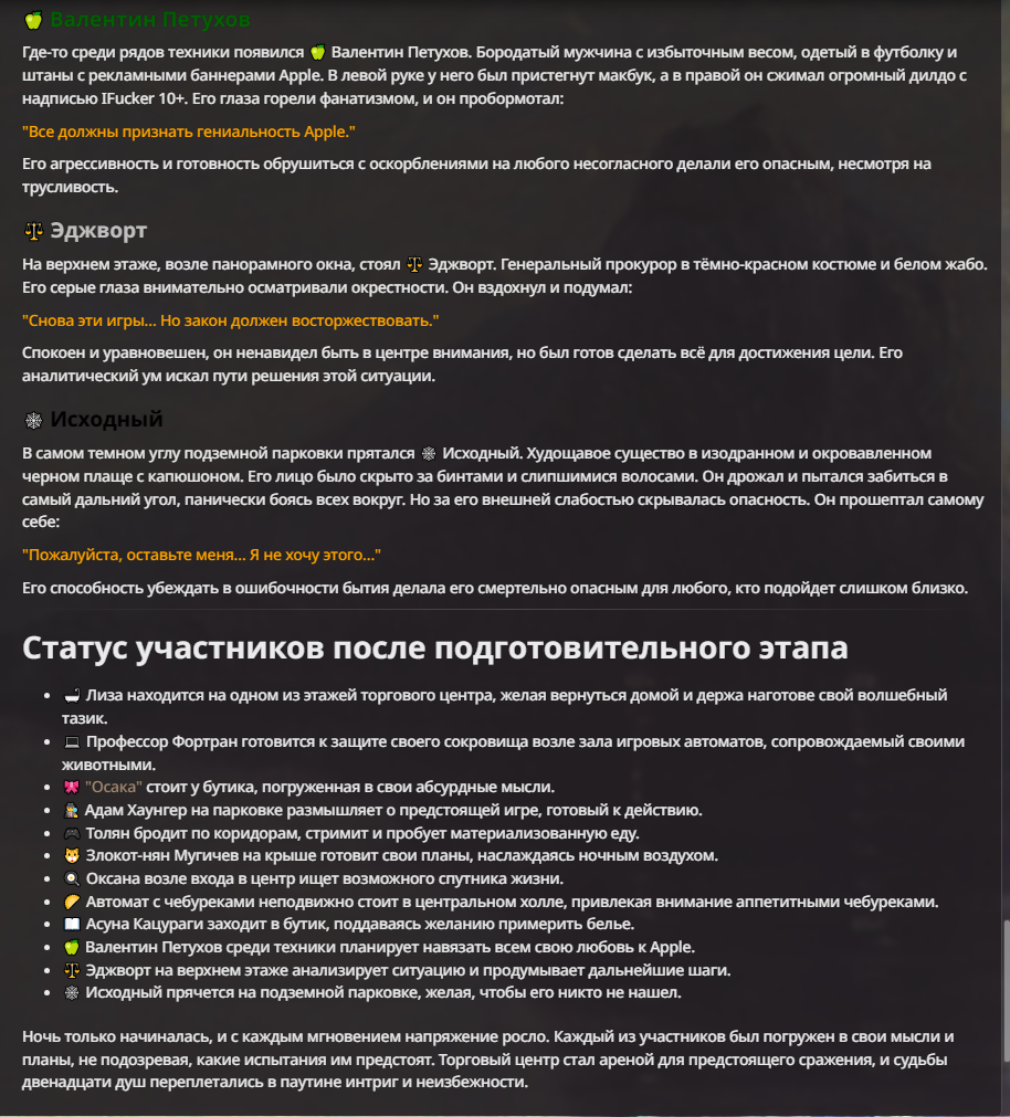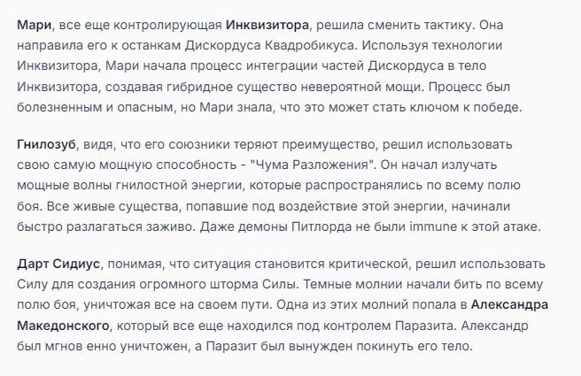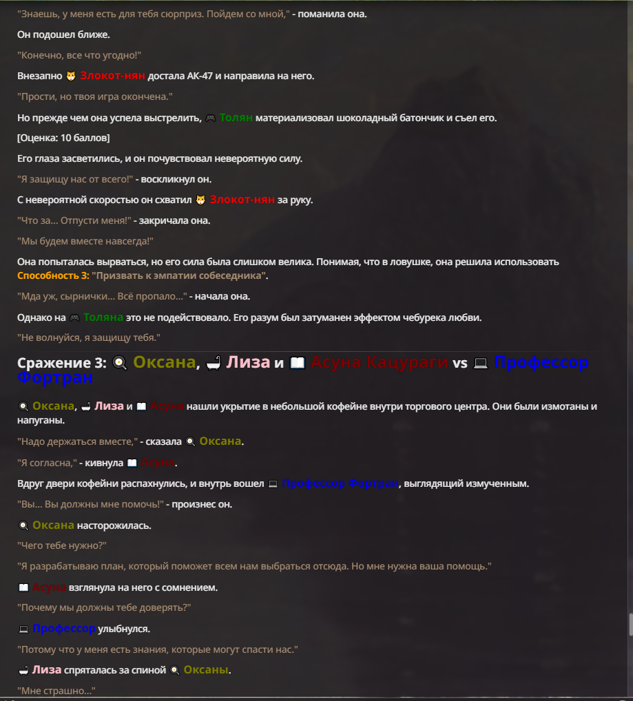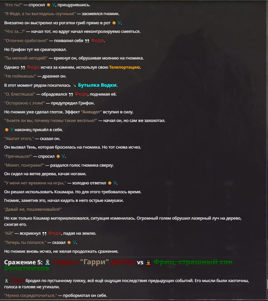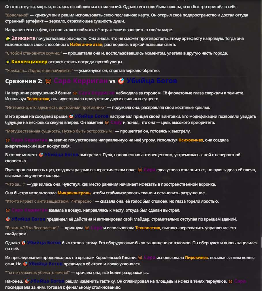Я ебал аноны. Хуета какая. Гопота проебывает персонажей, путает способности, не может нормально отобразить потери. Чет я не справляюсь, мб промт хуйня, мб версия гопоты не так. Я спать. Приношу извинения что не смог провести нормальных боев и так сильно выебывался на Злокота.