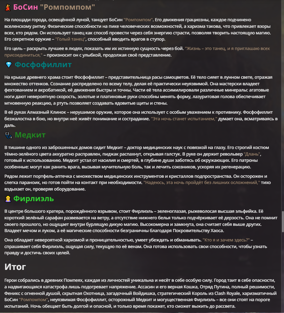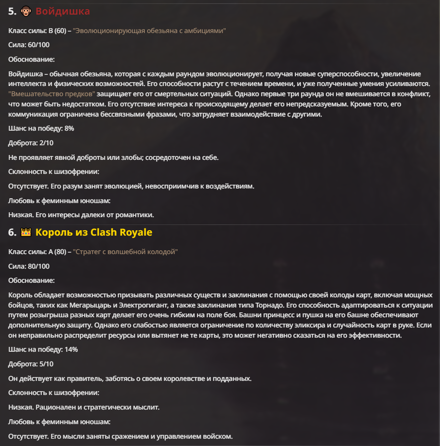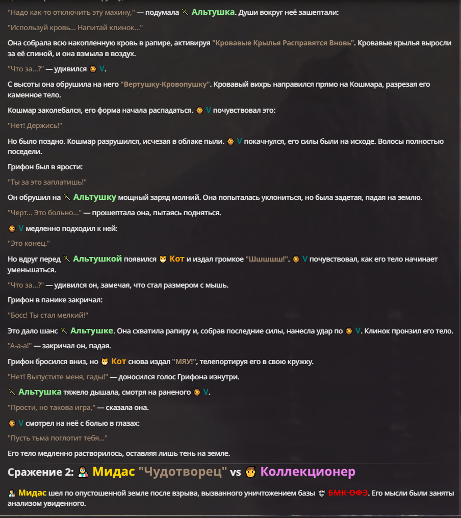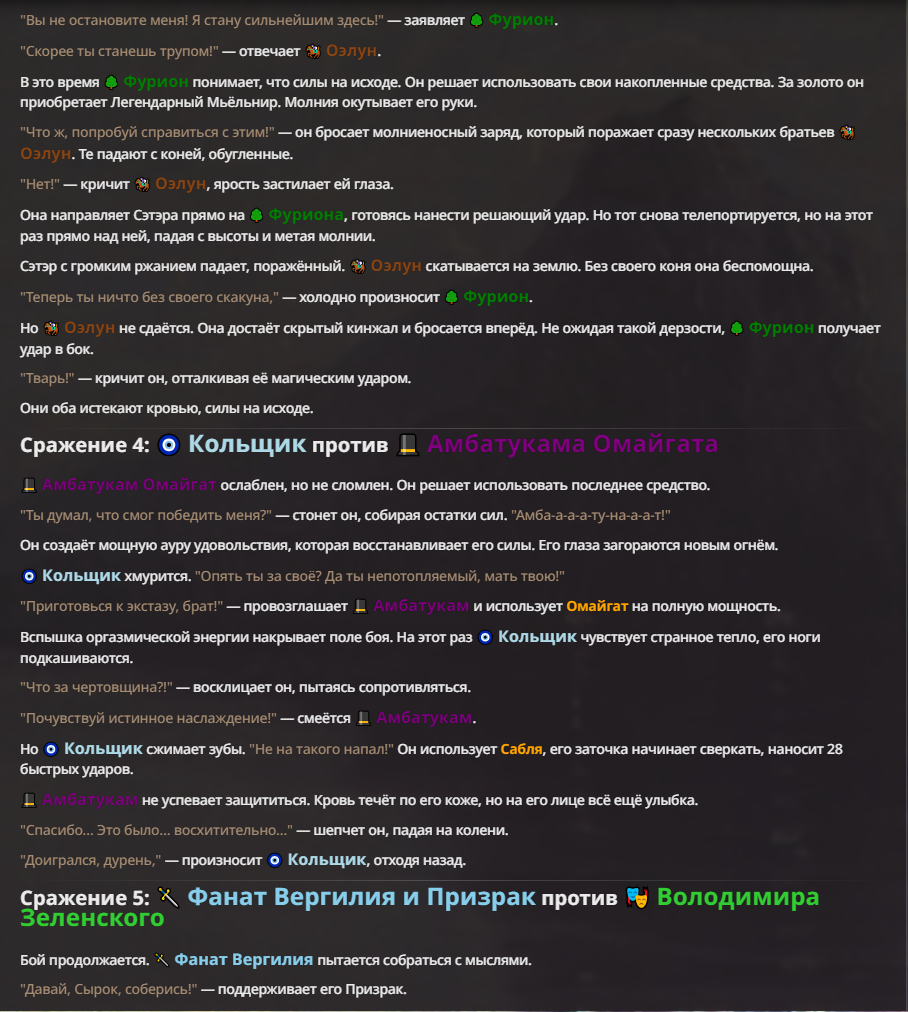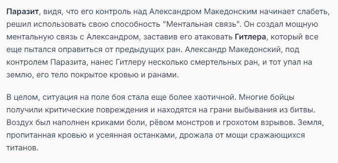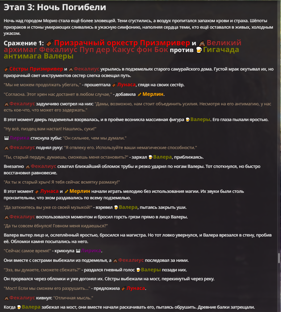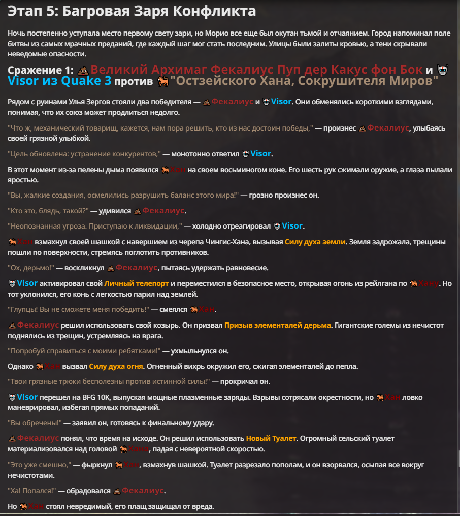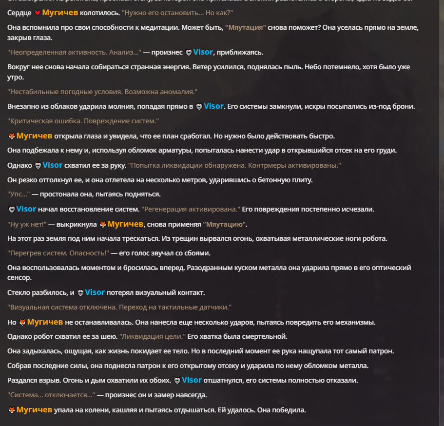 Я ебал аноны. Хуета какая. Гопота проебывает персонажей, путает способности, не может нормально отобразить потери. Чет я не справляюсь, мб промт хуйня, мб версия гопоты не так. Я спать. Приношу извинения что не смог провести нормальных боев и так сильно выебывался на Злокота.