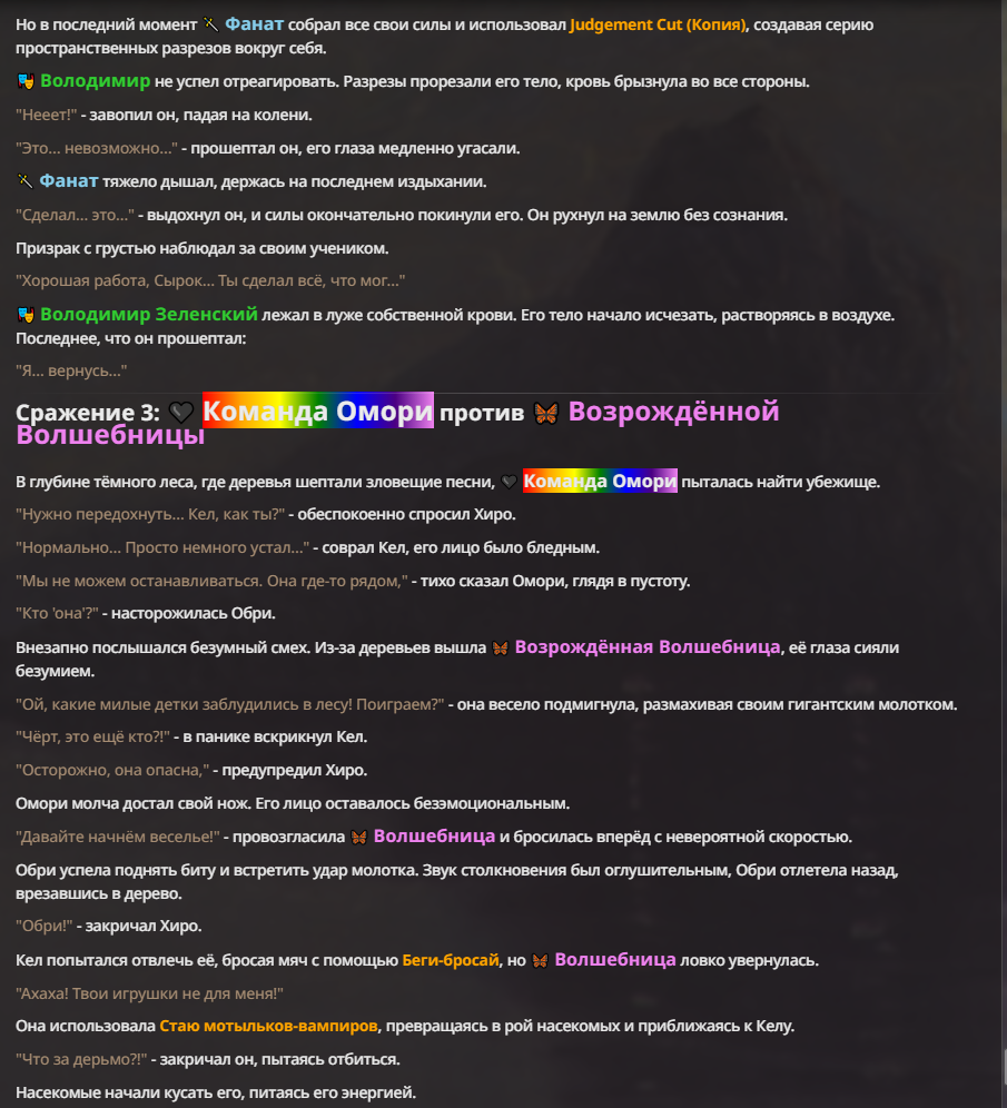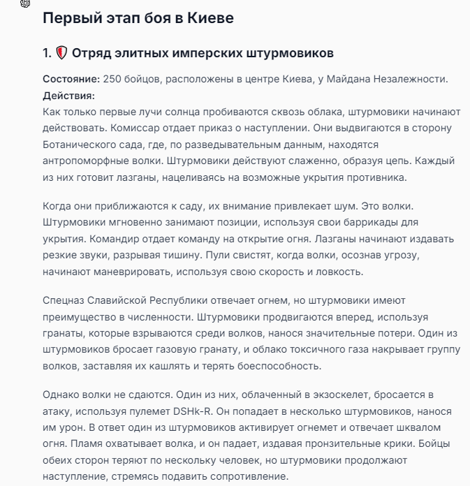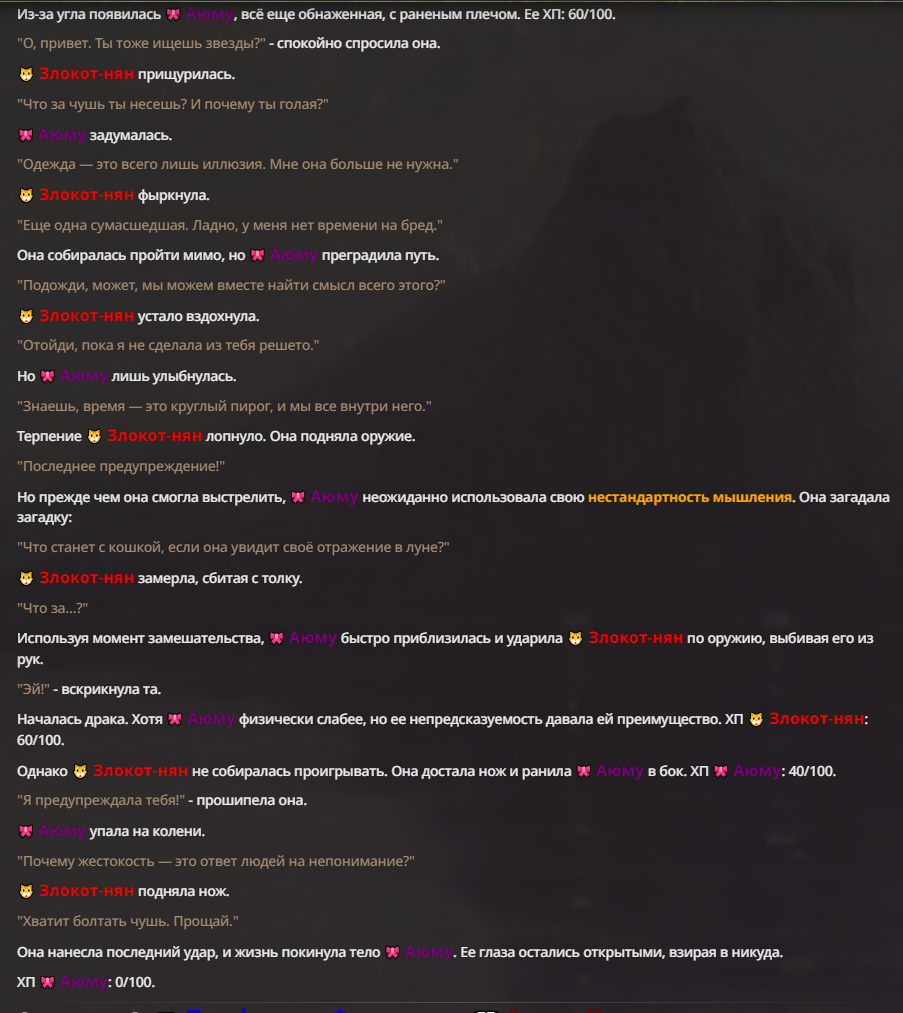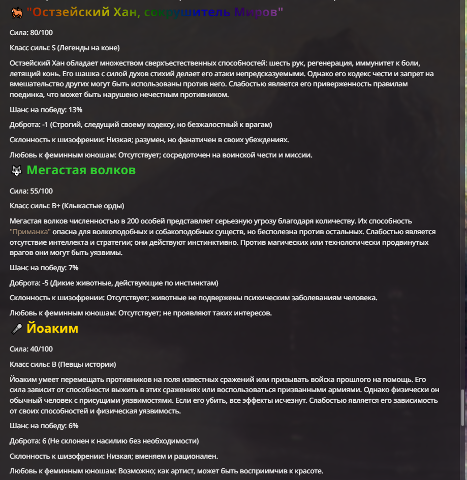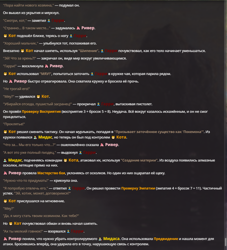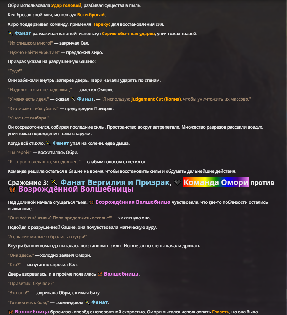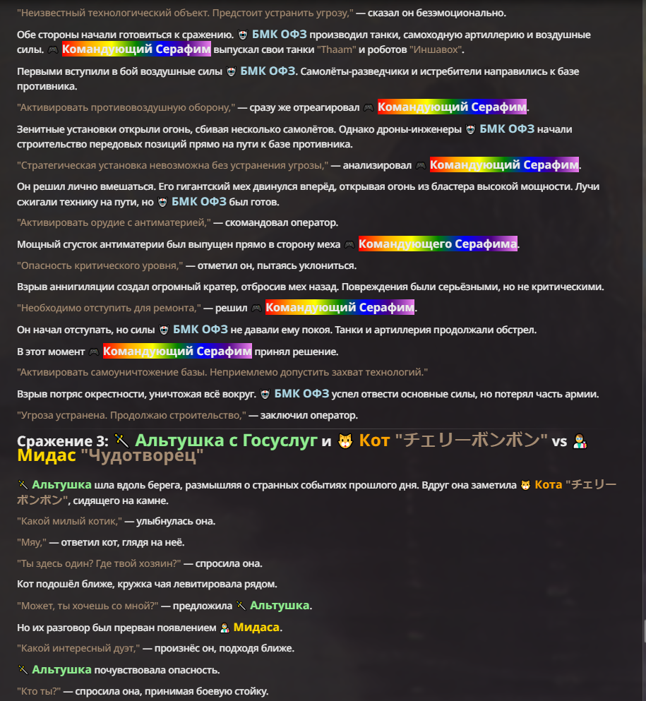 Я ебал аноны. Хуета какая. Гопота проебывает персонажей, путает способности, не может нормально отобразить потери. Чет я не справляюсь, мб промт хуйня, мб версия гопоты не так. Я спать. Приношу извинения что не смог провести нормальных боев и так сильно выебывался на Злокота.