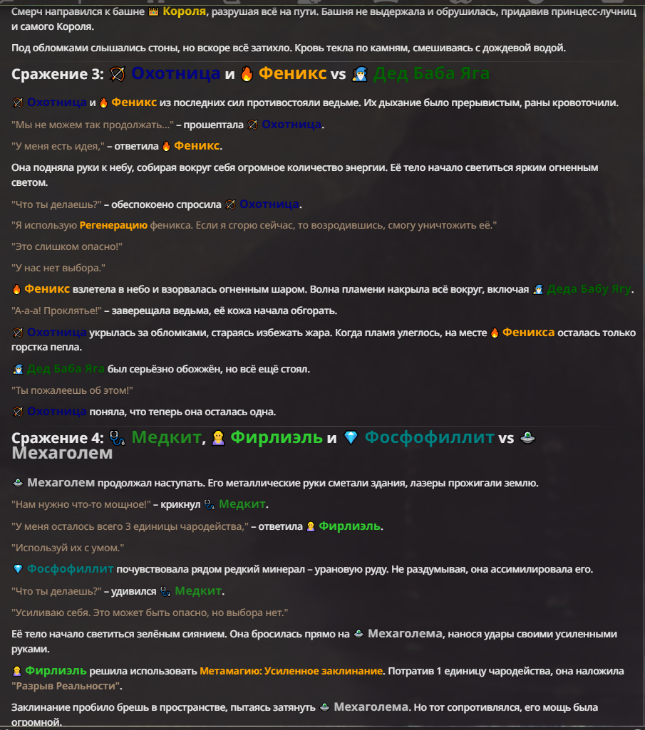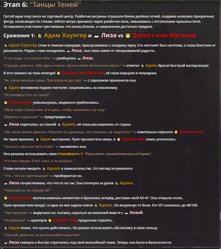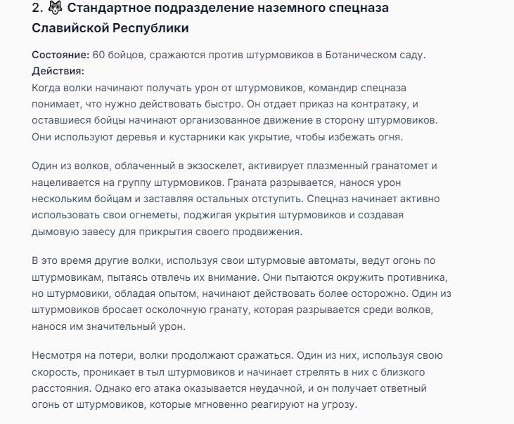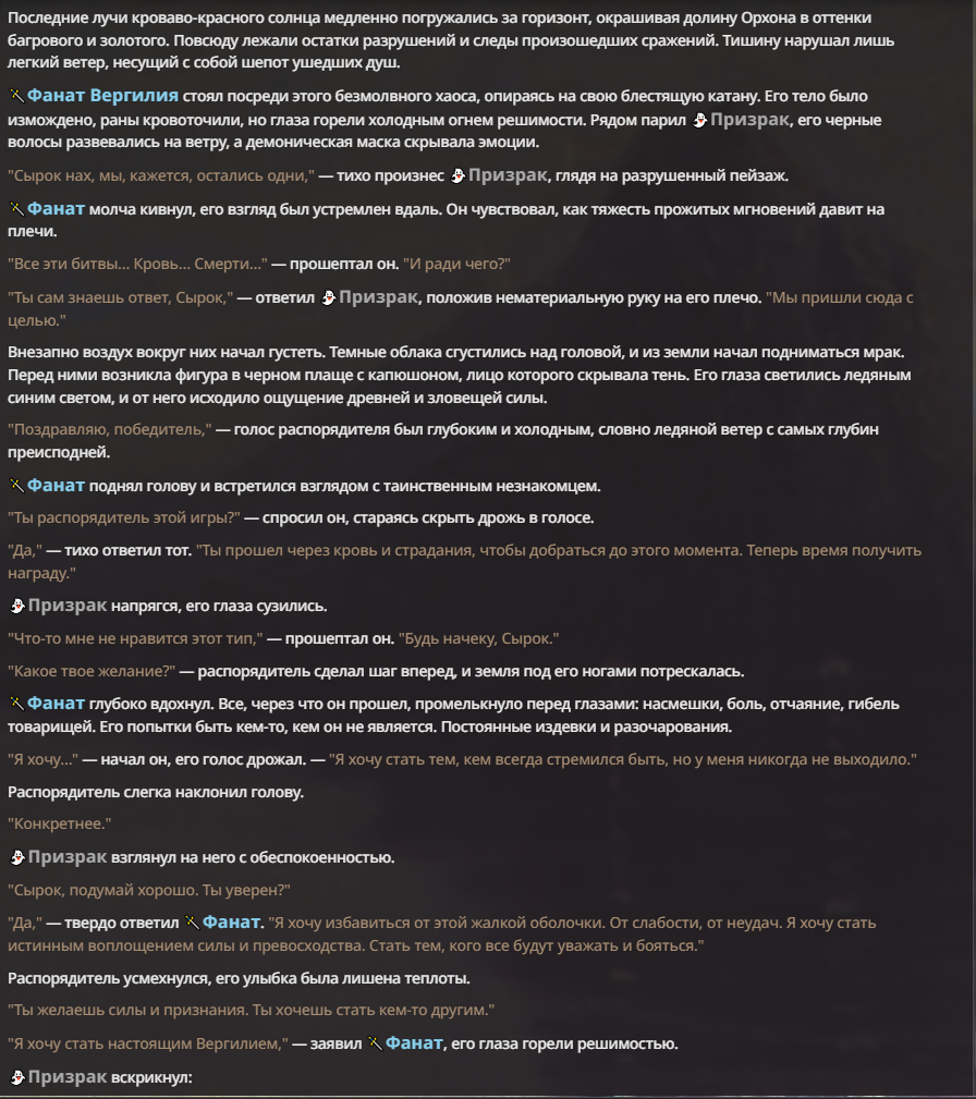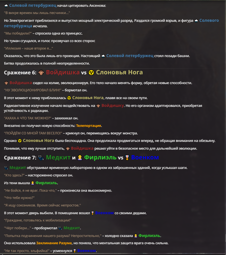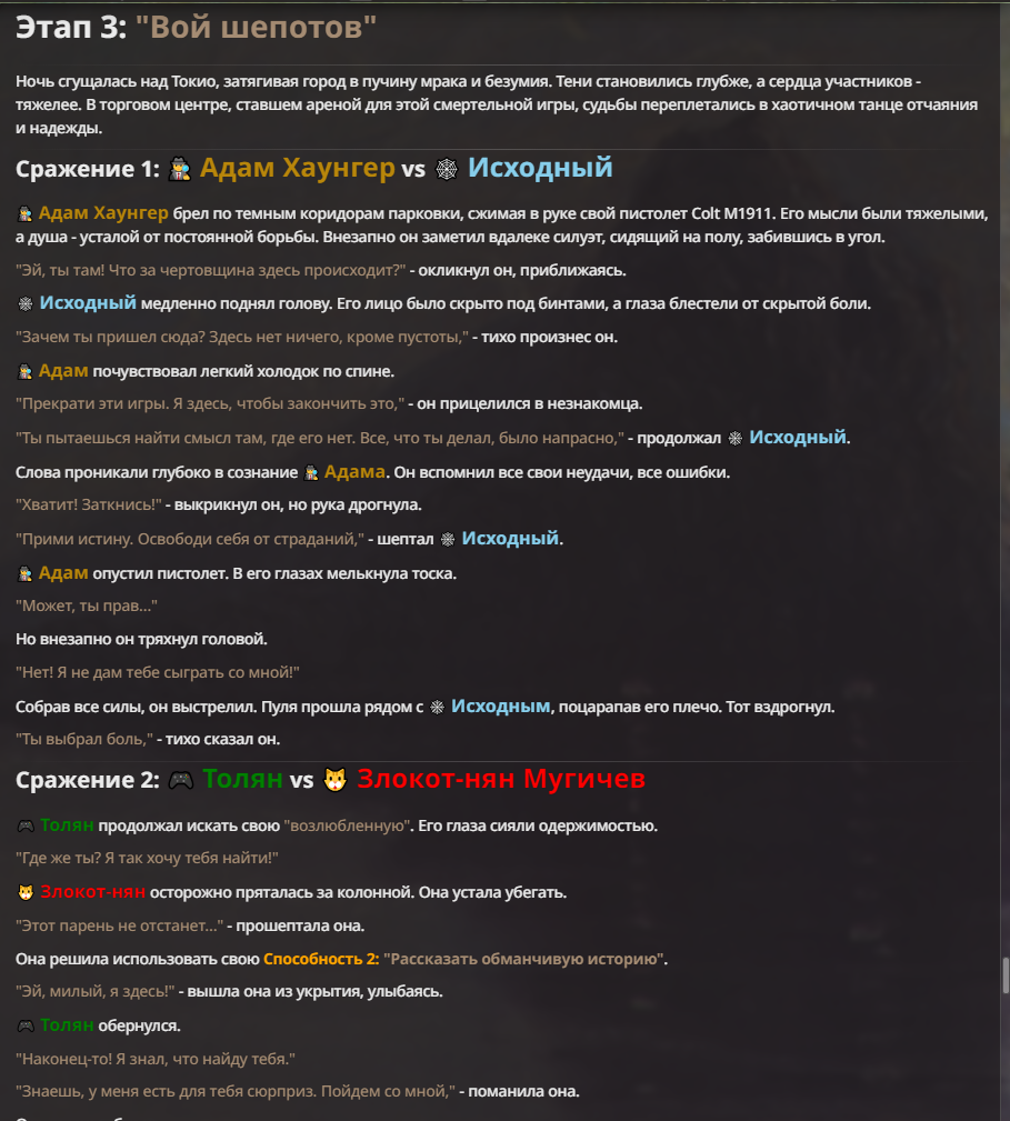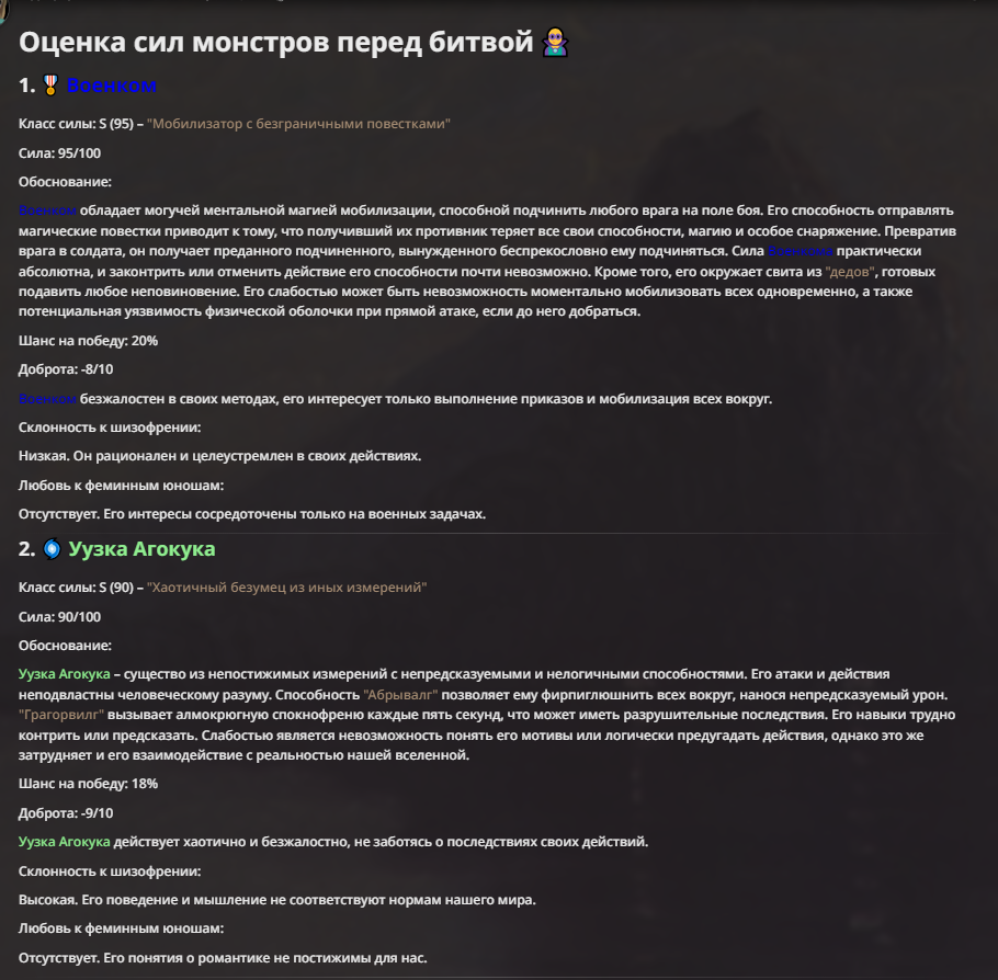 Я ебал аноны. Хуета какая. Гопота проебывает персонажей, путает способности, не может нормально отобразить потери. Чет я не справляюсь, мб промт хуйня, мб версия гопоты не так. Я спать. Приношу извинения что не смог провести нормальных боев и так сильно выебывался на Злокота.