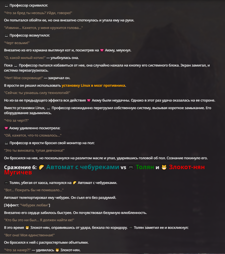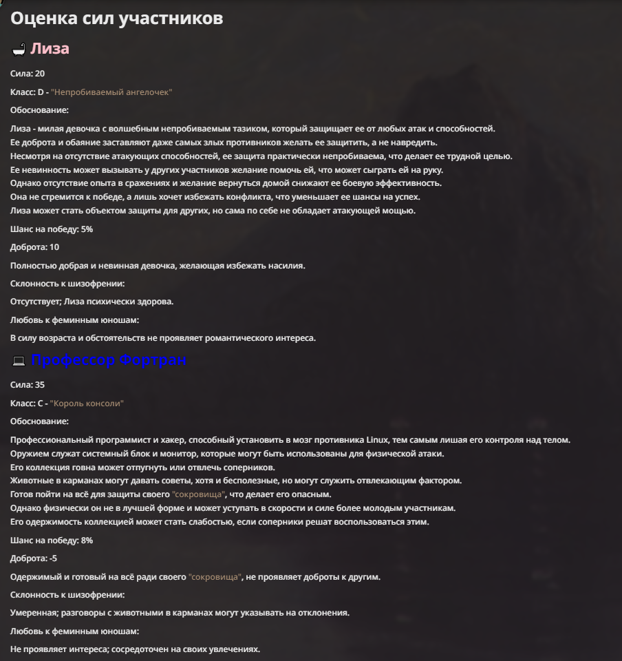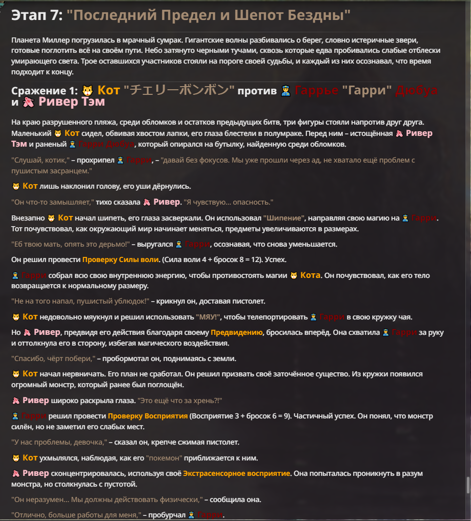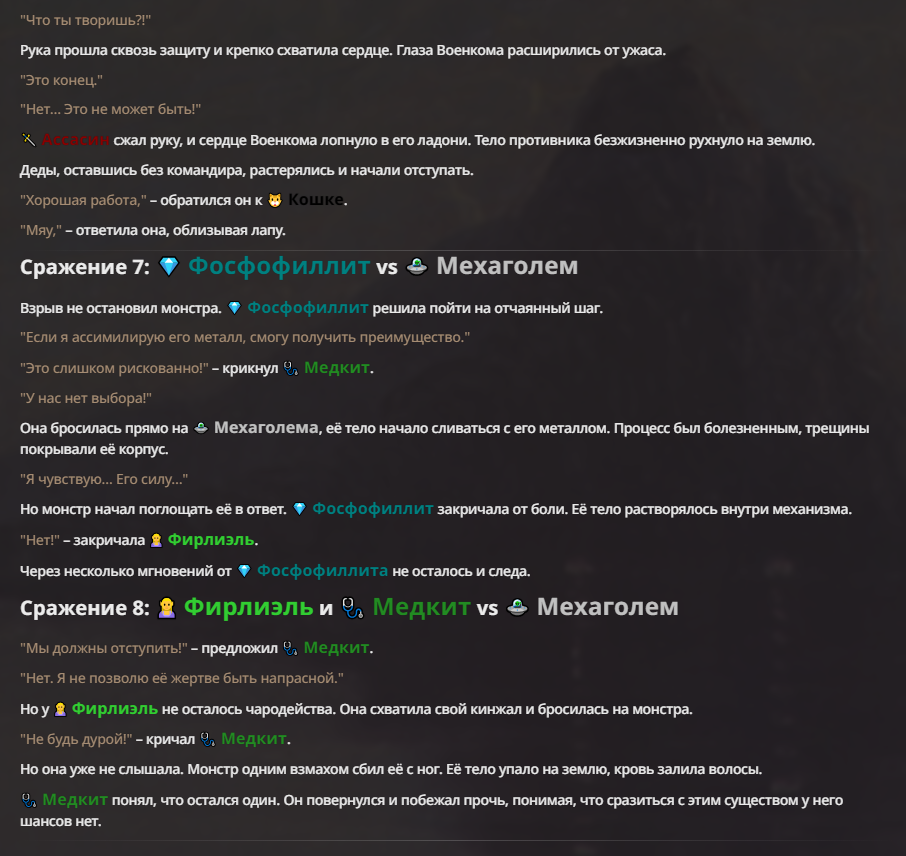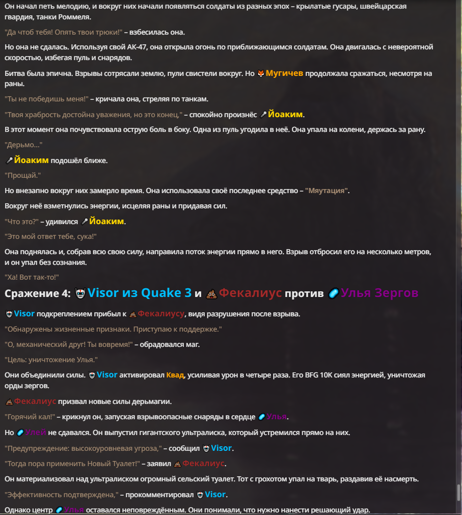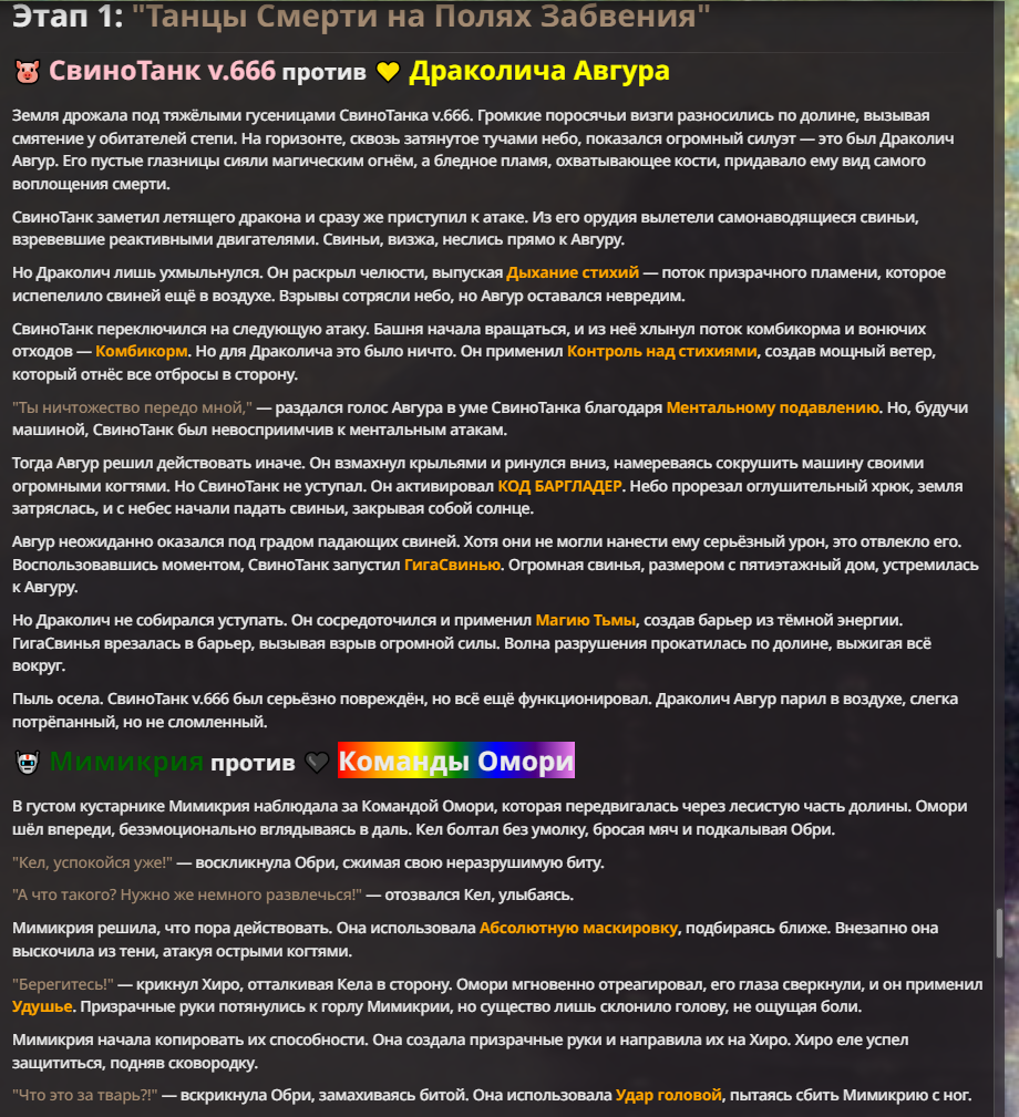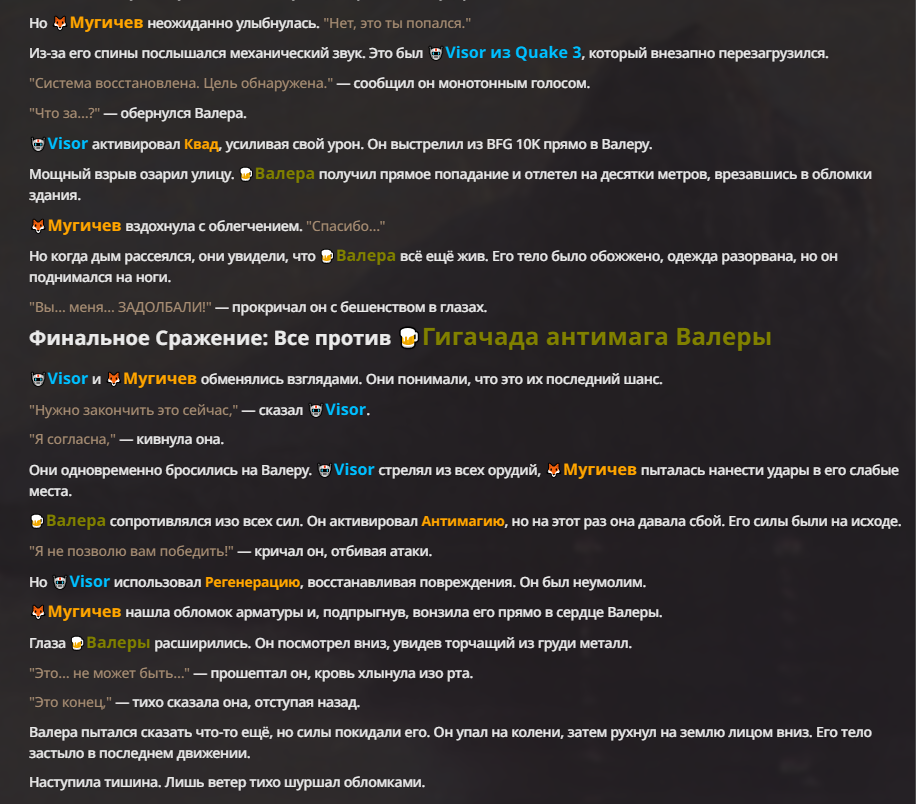 Я ебал аноны. Хуета какая. Гопота проебывает персонажей, путает способности, не может нормально отобразить потери. Чет я не справляюсь, мб промт хуйня, мб версия гопоты не так. Я спать. Приношу извинения что не смог провести нормальных боев и так сильно выебывался на Злокота.