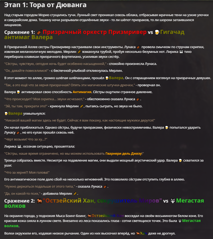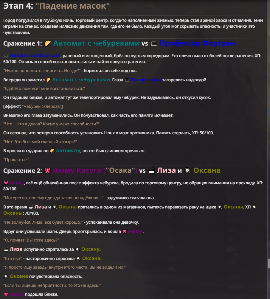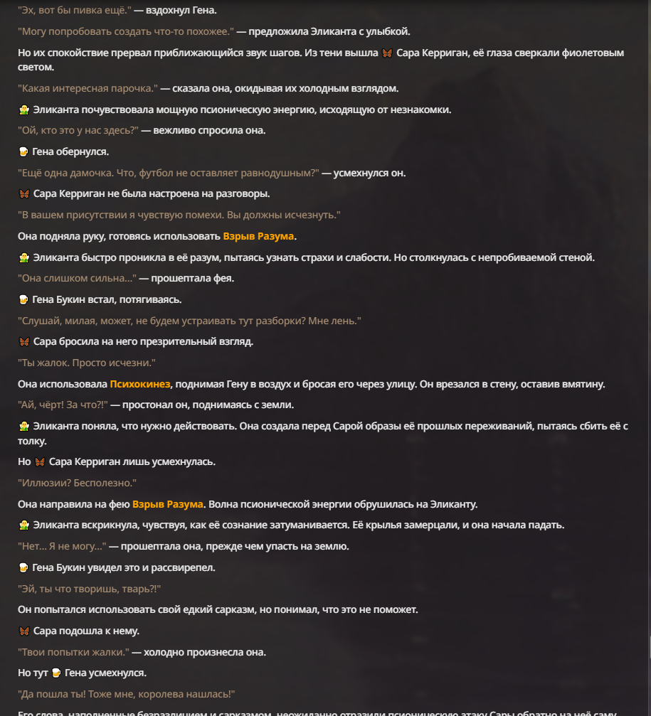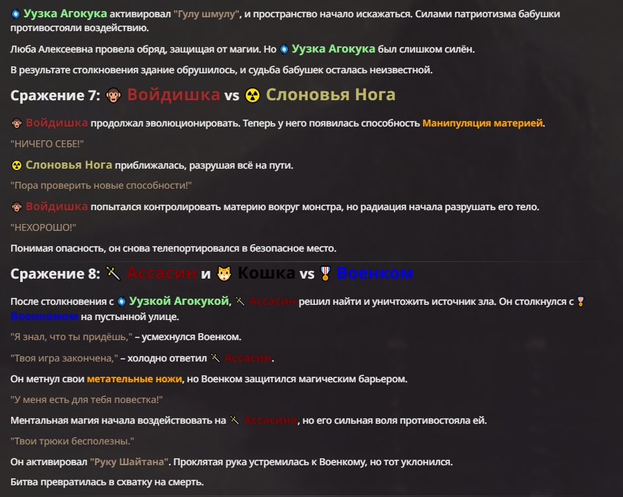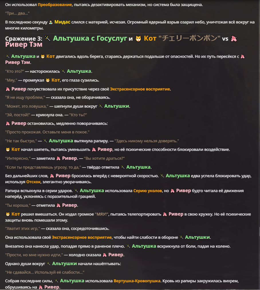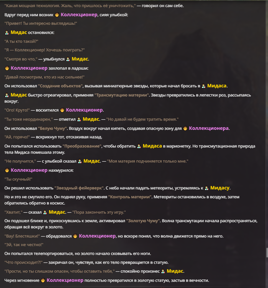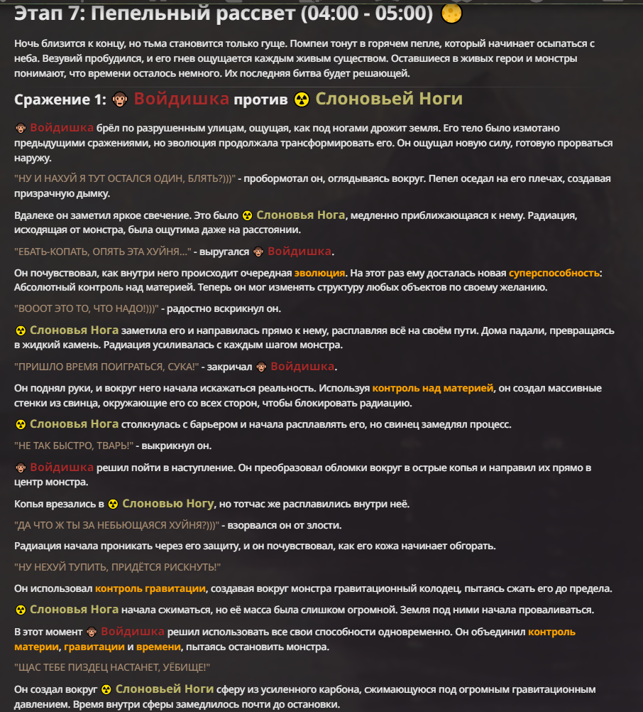 Я ебал аноны. Хуета какая. Гопота проебывает персонажей, путает способности, не может нормально отобразить потери. Чет я не справляюсь, мб промт хуйня, мб версия гопоты не так. Я спать. Приношу извинения что не смог провести нормальных боев и так сильно выебывался на Злокота.