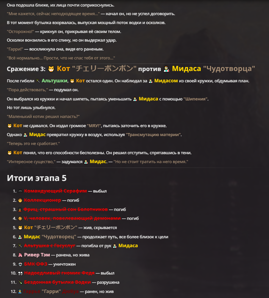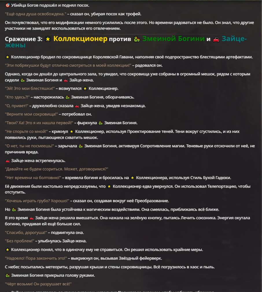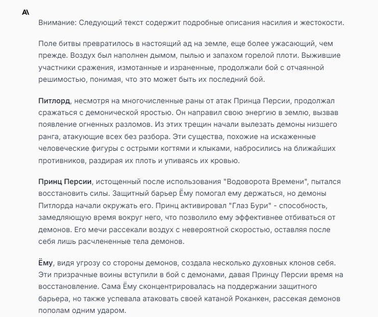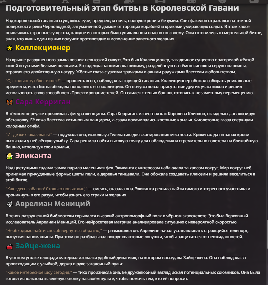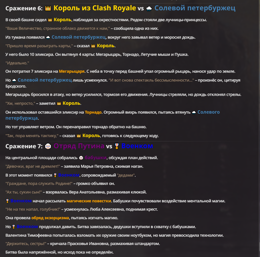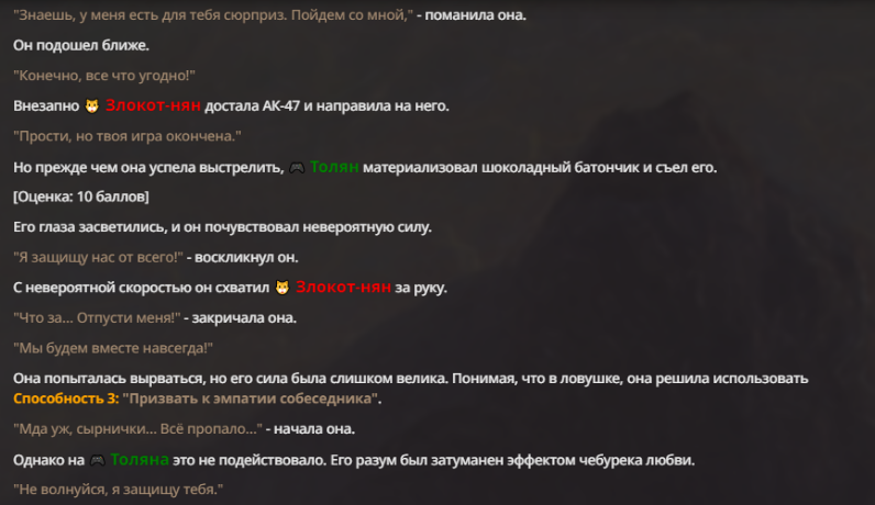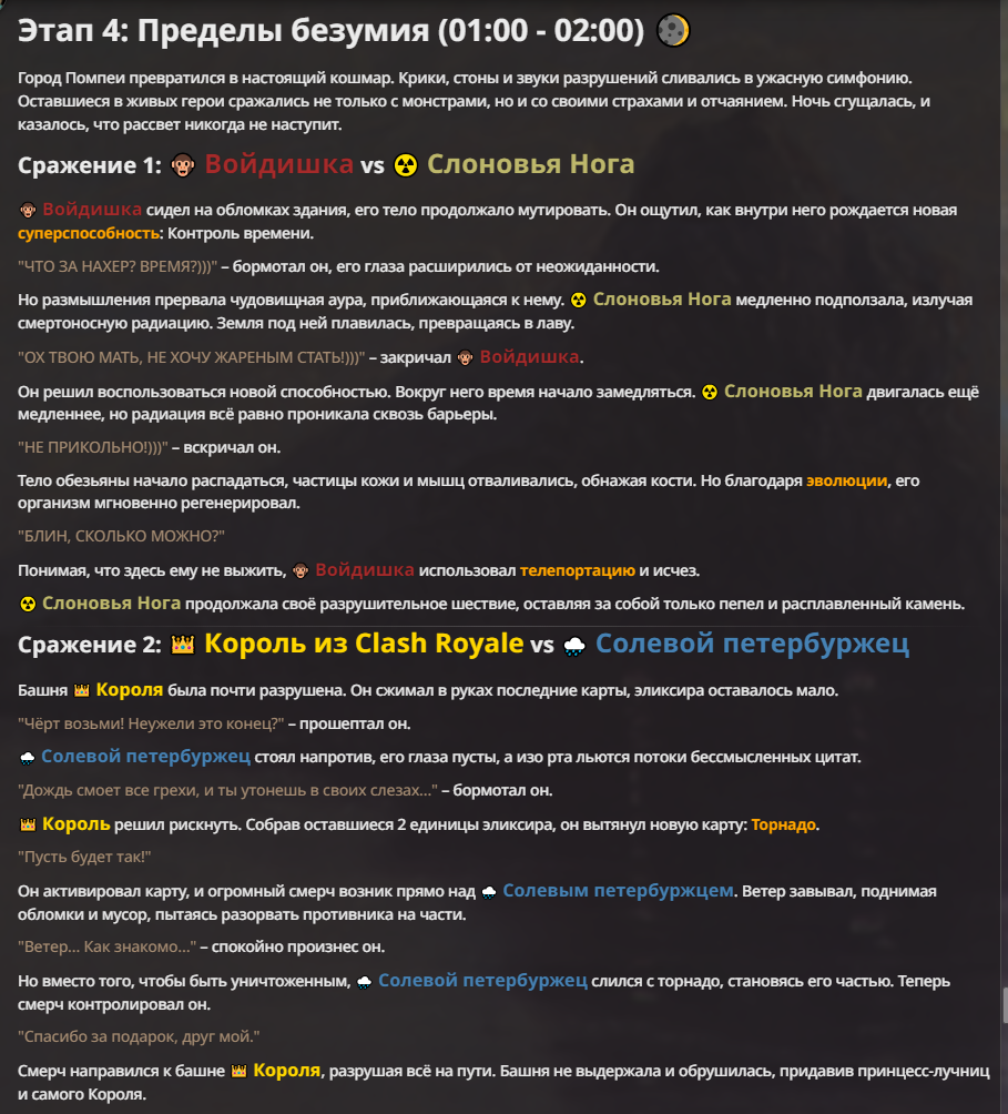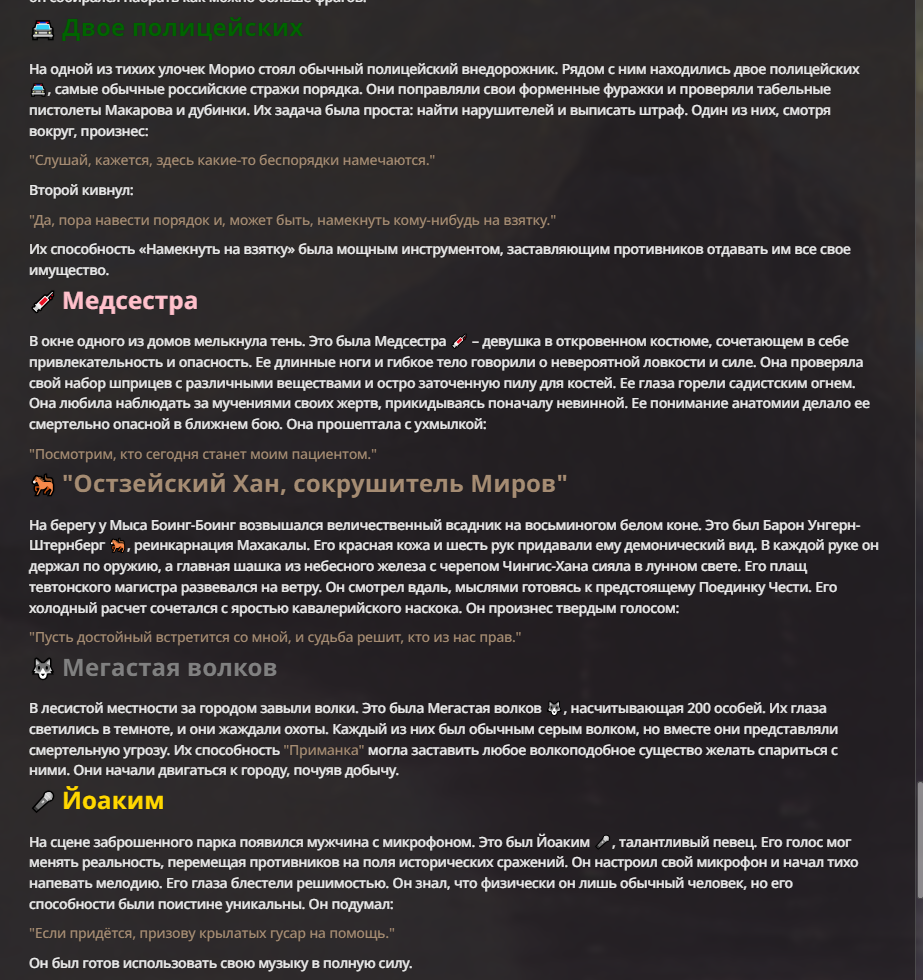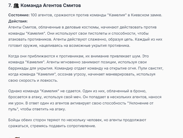 Я ебал аноны. Хуета какая. Гопота проебывает персонажей, путает способности, не может нормально отобразить потери. Чет я не справляюсь, мб промт хуйня, мб версия гопоты не так. Я спать. Приношу извинения что не смог провести нормальных боев и так сильно выебывался на Злокота.