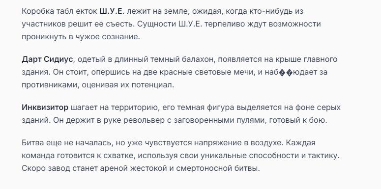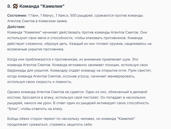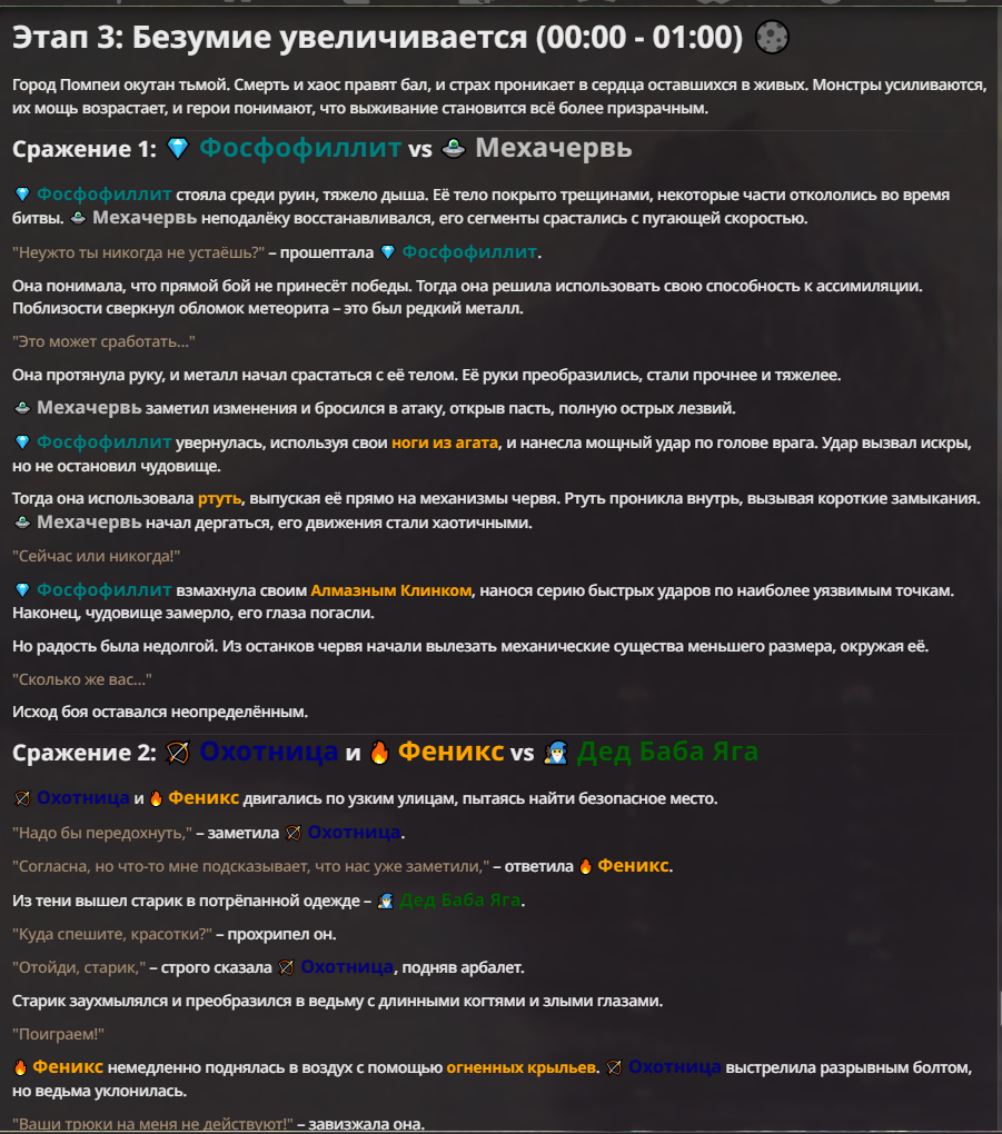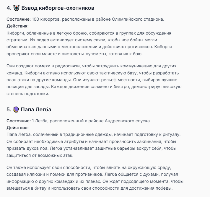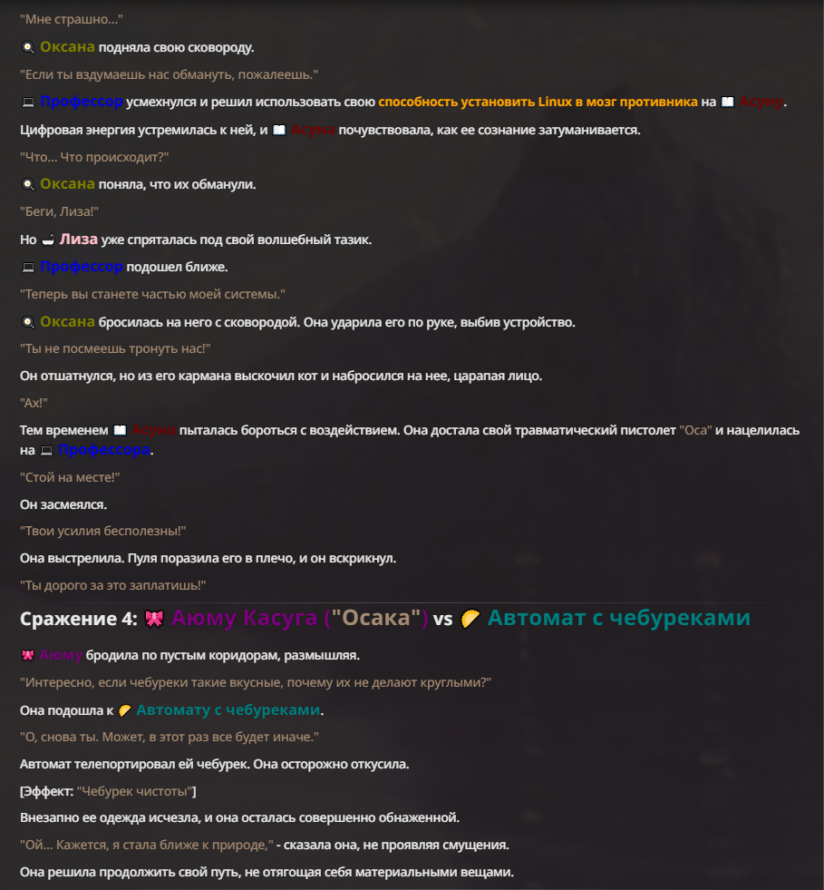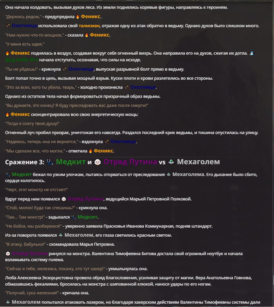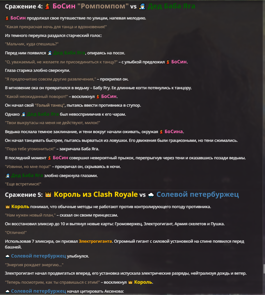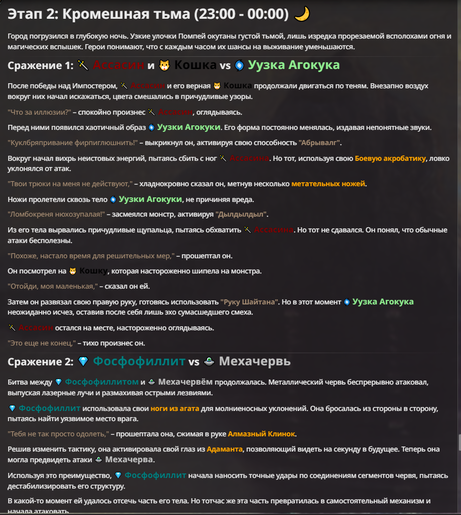 Я ебал аноны. Хуета какая. Гопота проебывает персонажей, путает способности, не может нормально отобразить потери. Чет я не справляюсь, мб промт хуйня, мб версия гопоты не так. Я спать. Приношу извинения что не смог провести нормальных боев и так сильно выебывался на Злокота.