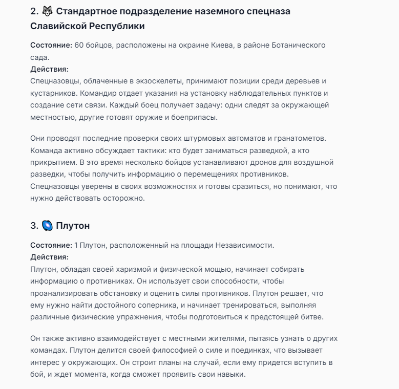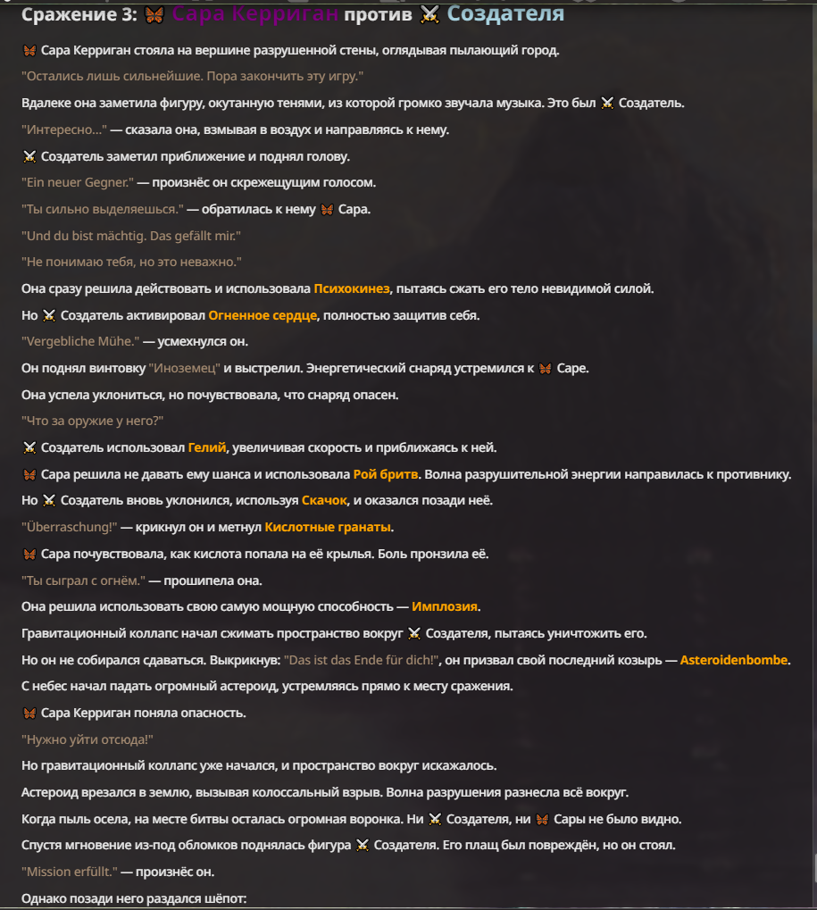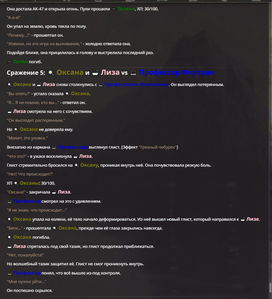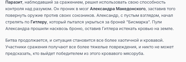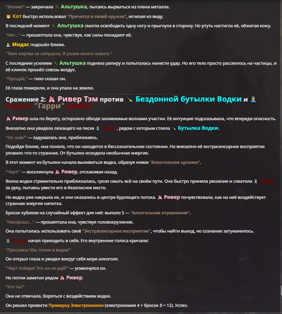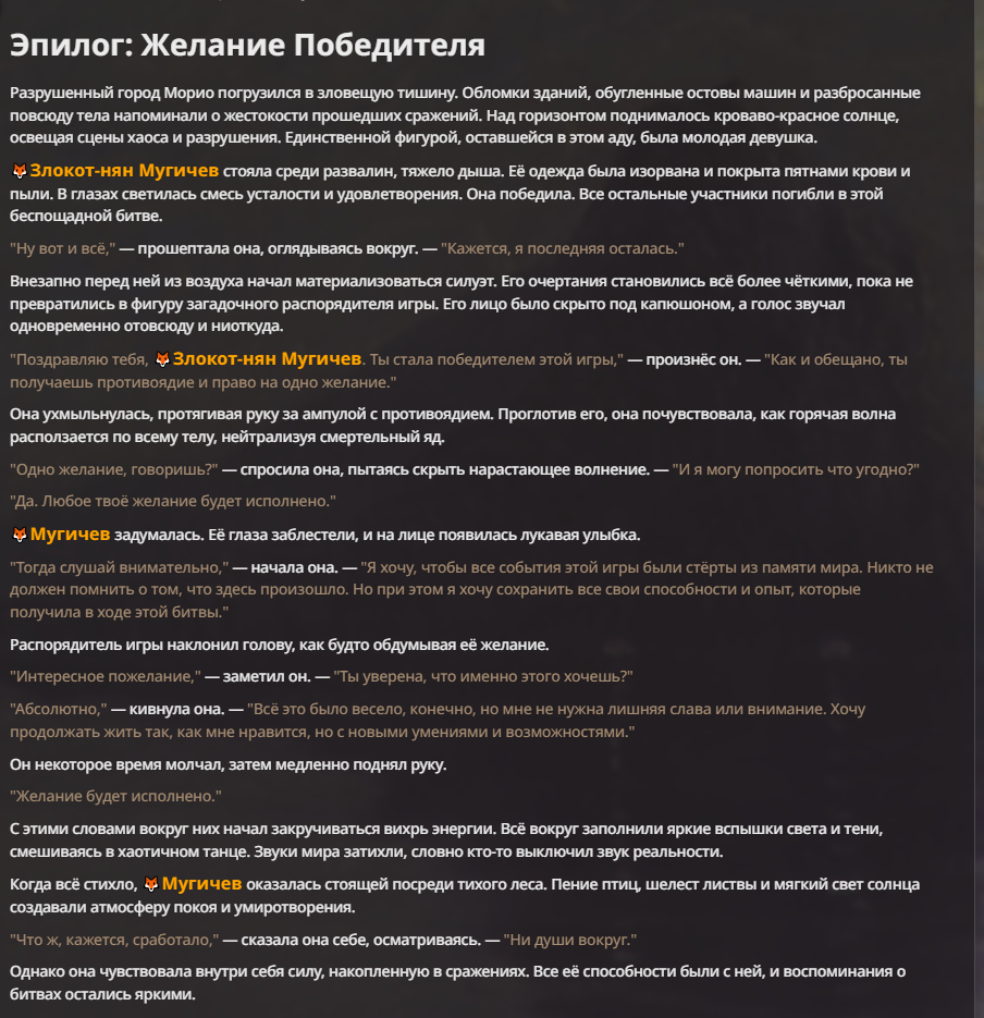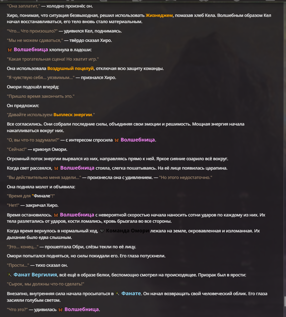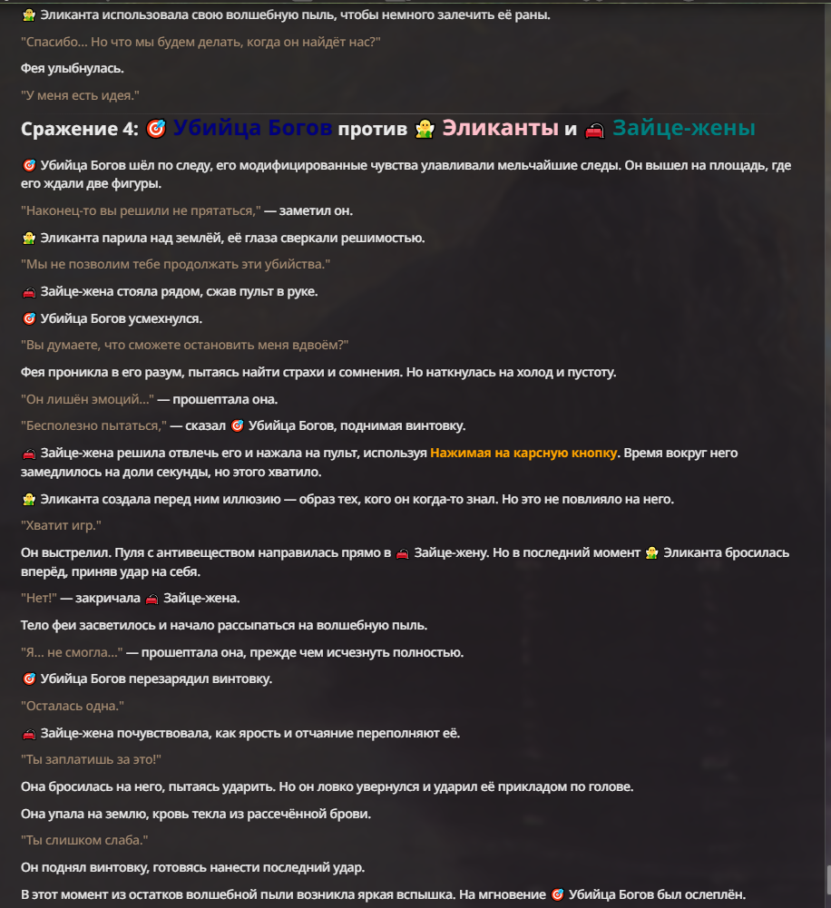 Я ебал аноны. Хуета какая. Гопота проебывает персонажей, путает способности, не может нормально отобразить потери. Чет я не справляюсь, мб промт хуйня, мб версия гопоты не так. Я спать. Приношу извинения что не смог провести нормальных боев и так сильно выебывался на Злокота.