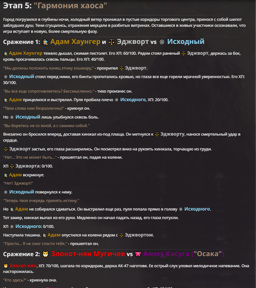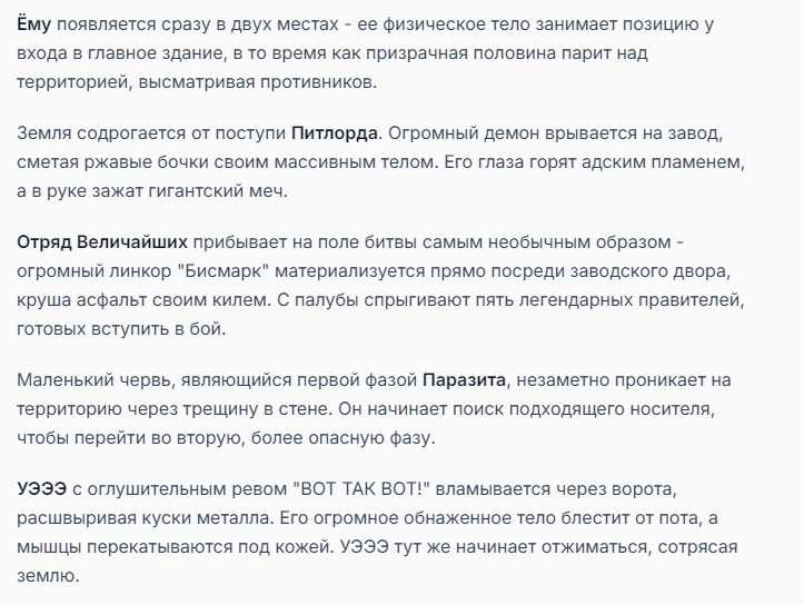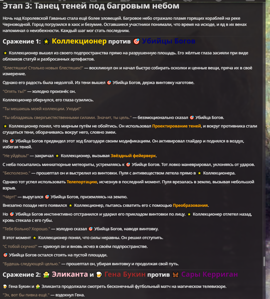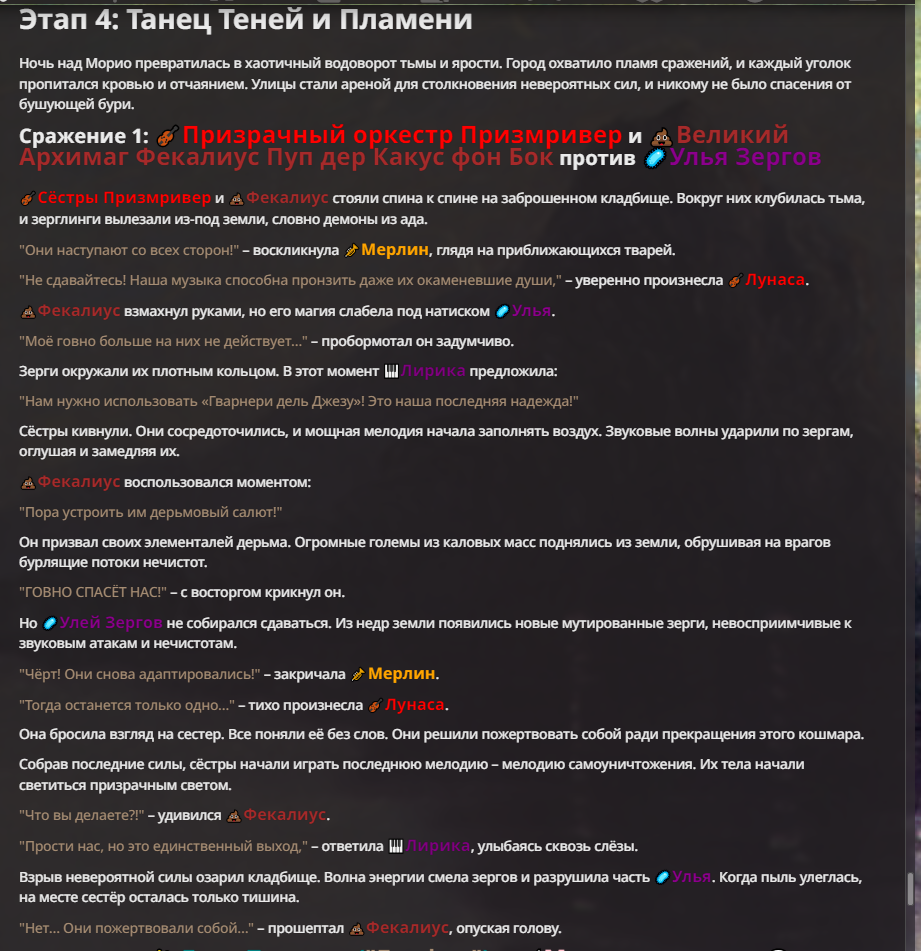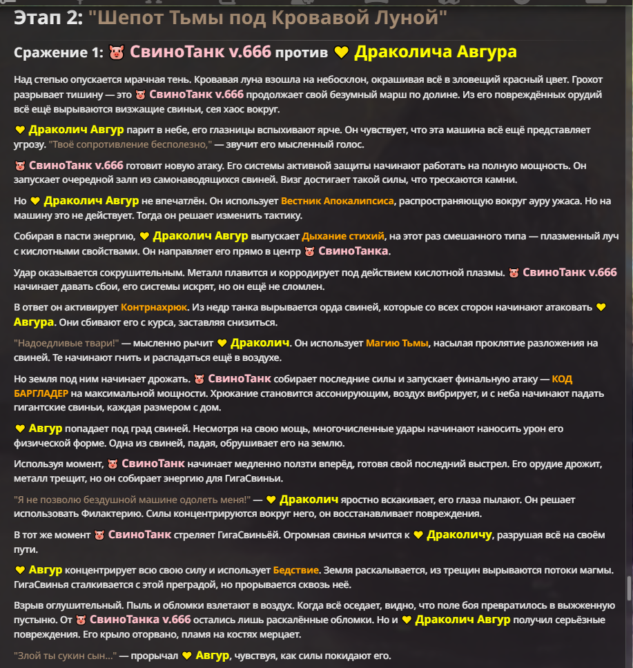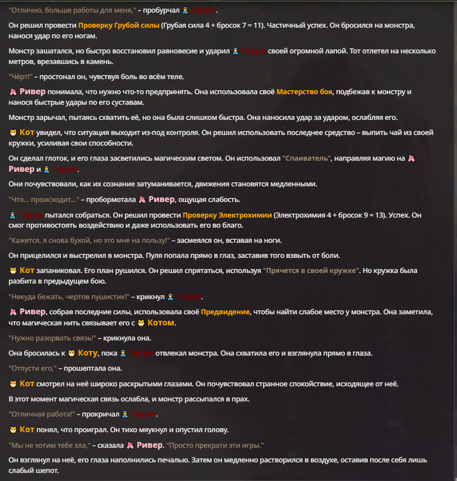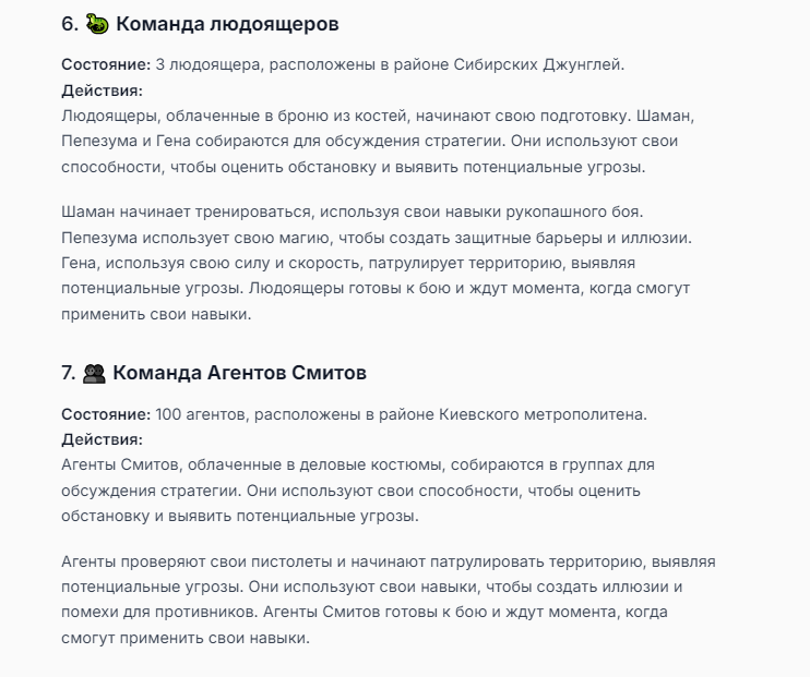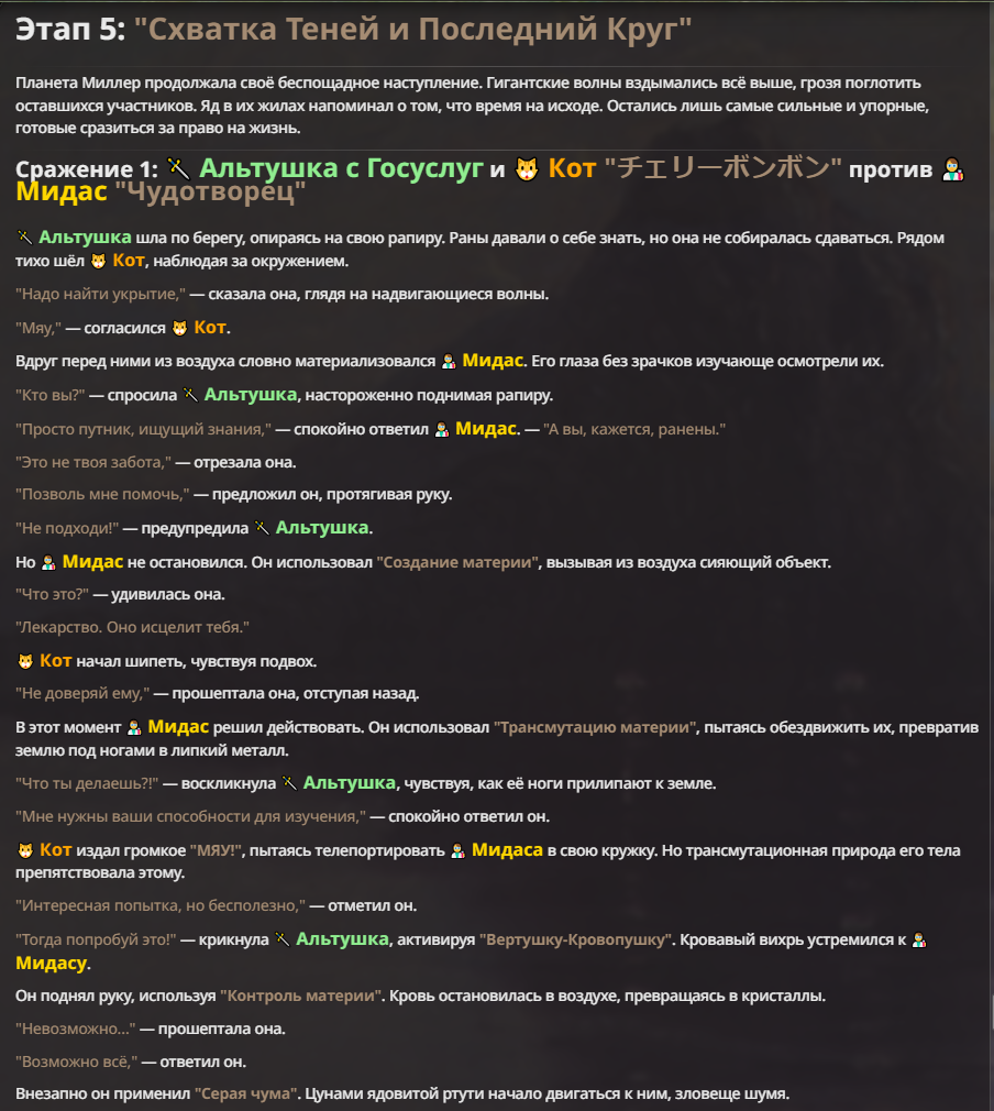Я ебал аноны. Хуета какая. Гопота проебывает персонажей, путает способности, не может нормально отобразить потери. Чет я не справляюсь, мб промт хуйня, мб версия гопоты не так. Я спать. Приношу извинения что не смог провести нормальных боев и так сильно выебывался на Злокота.