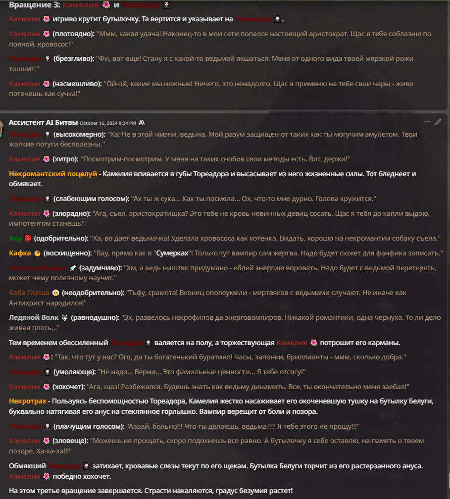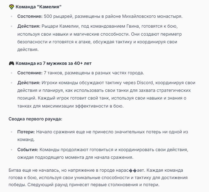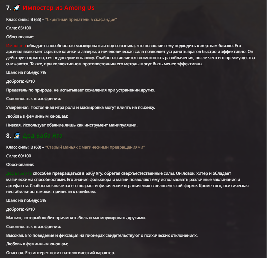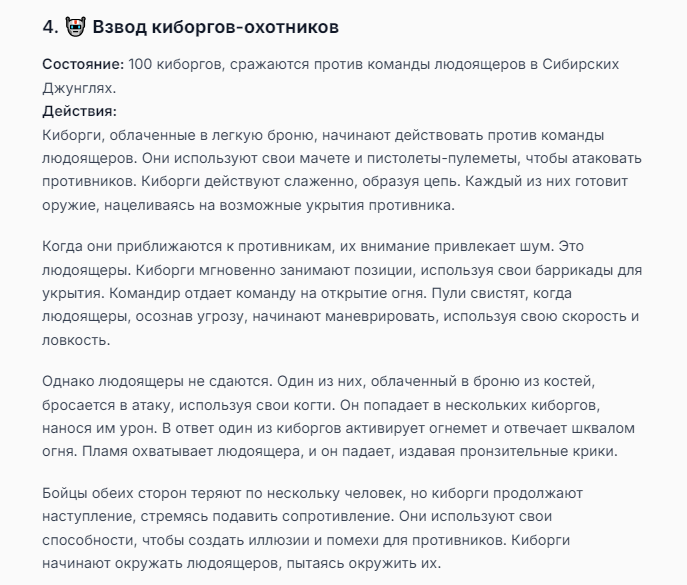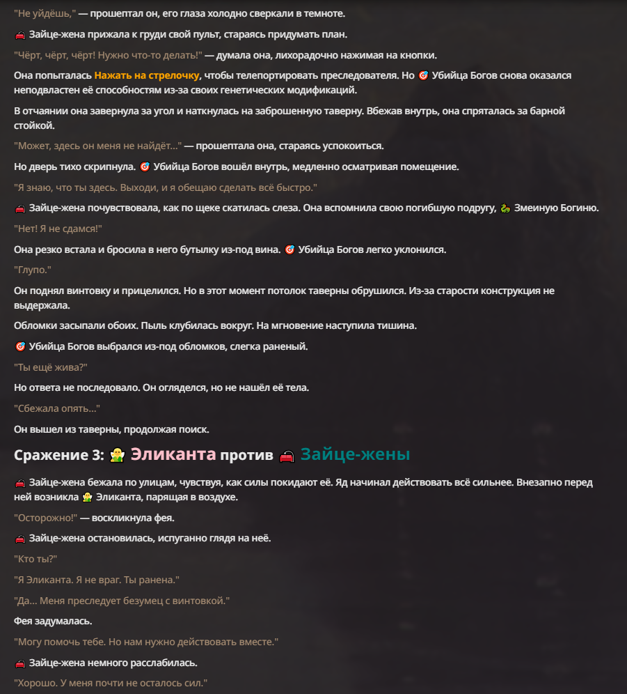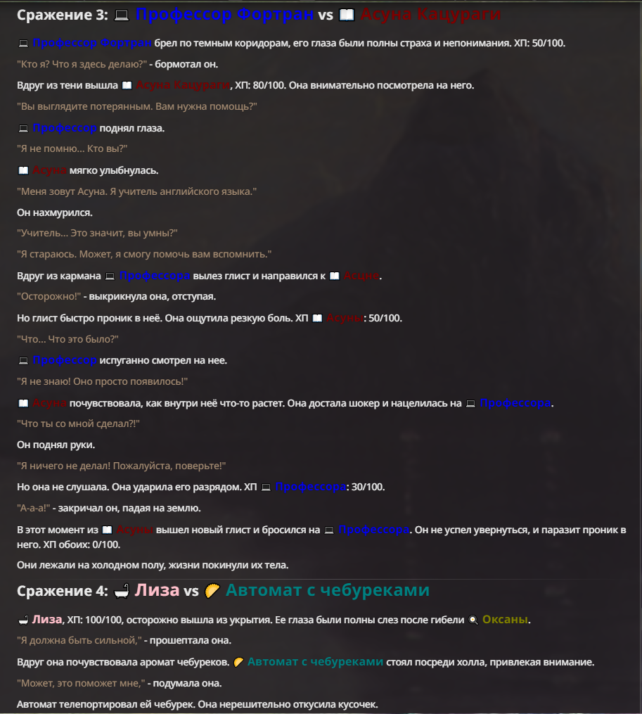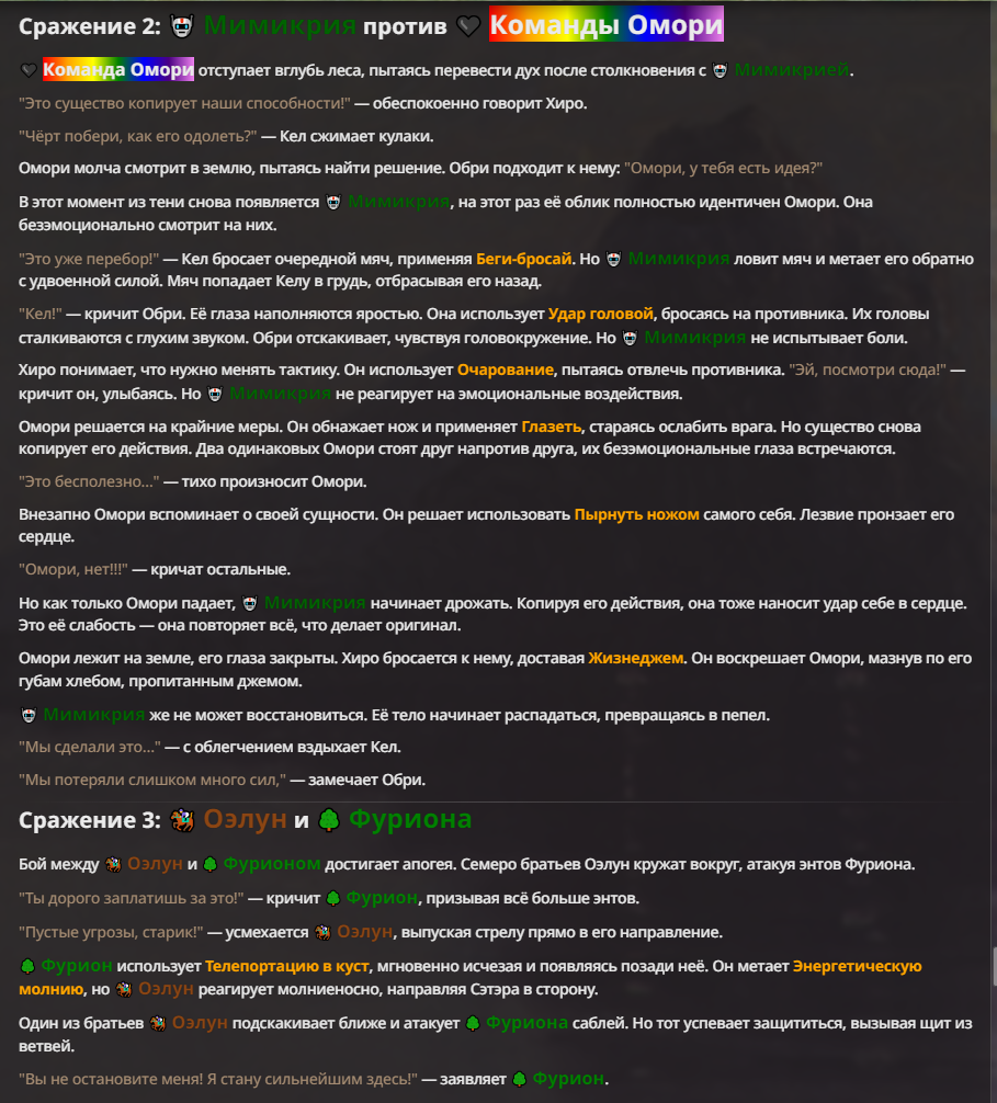 Я ебал аноны. Хуета какая. Гопота проебывает персонажей, путает способности, не может нормально отобразить потери. Чет я не справляюсь, мб промт хуйня, мб версия гопоты не так. Я спать. Приношу извинения что не смог провести нормальных боев и так сильно выебывался на Злокота.