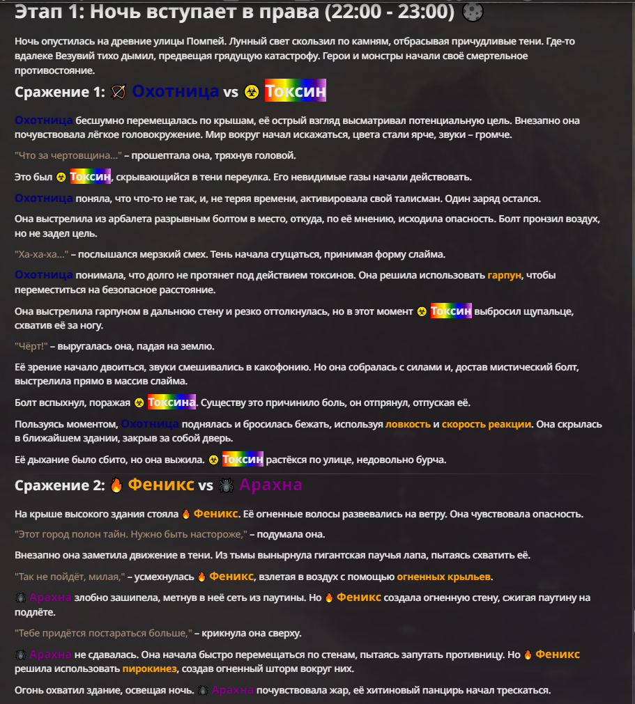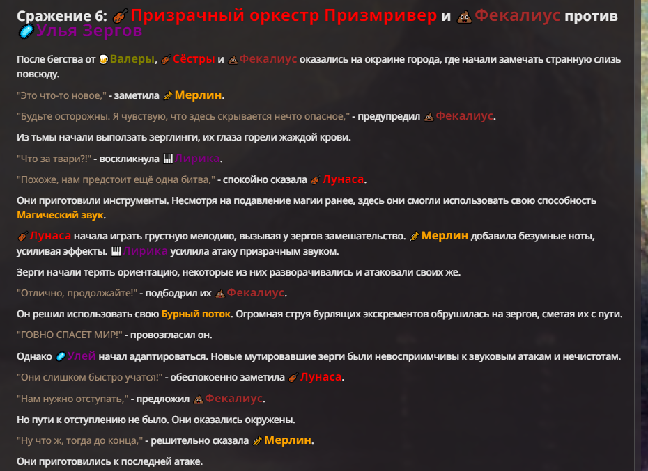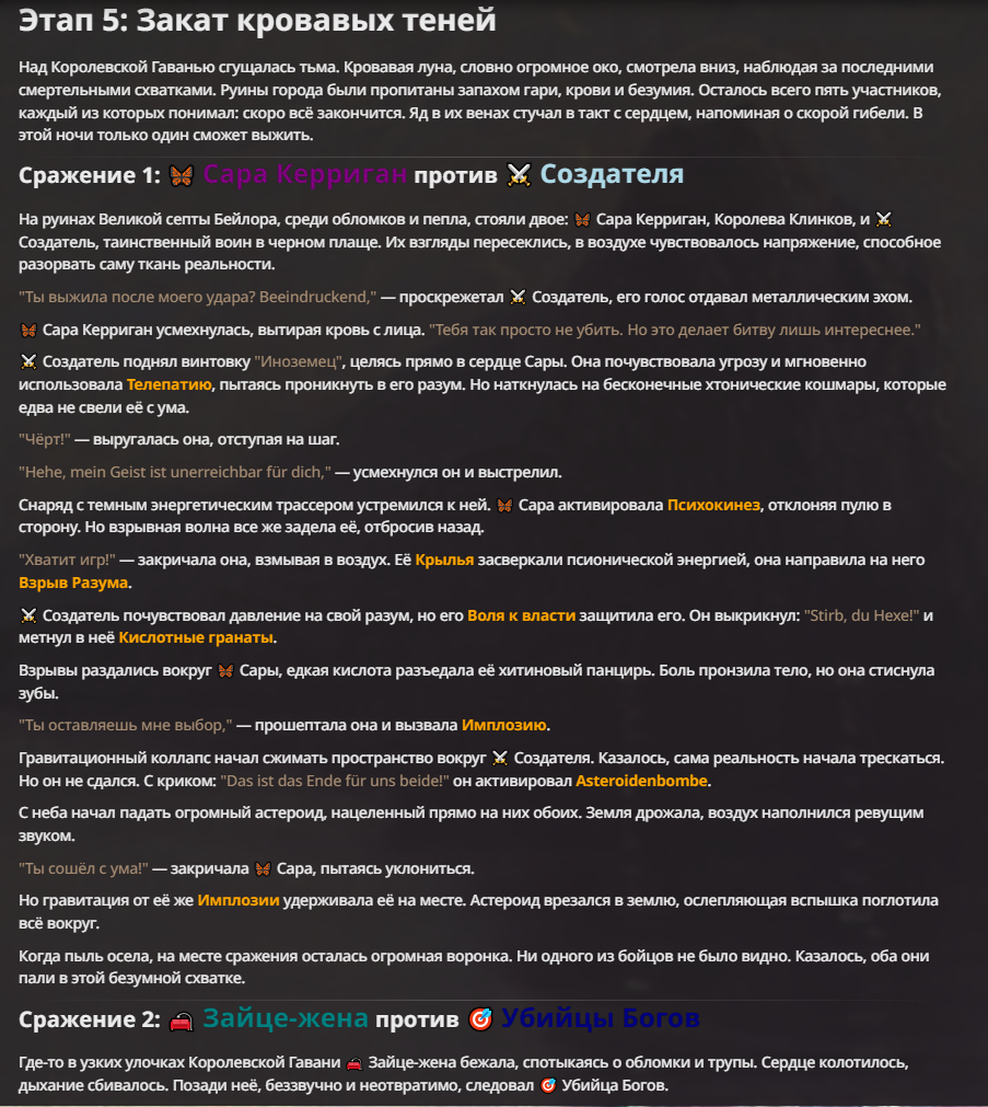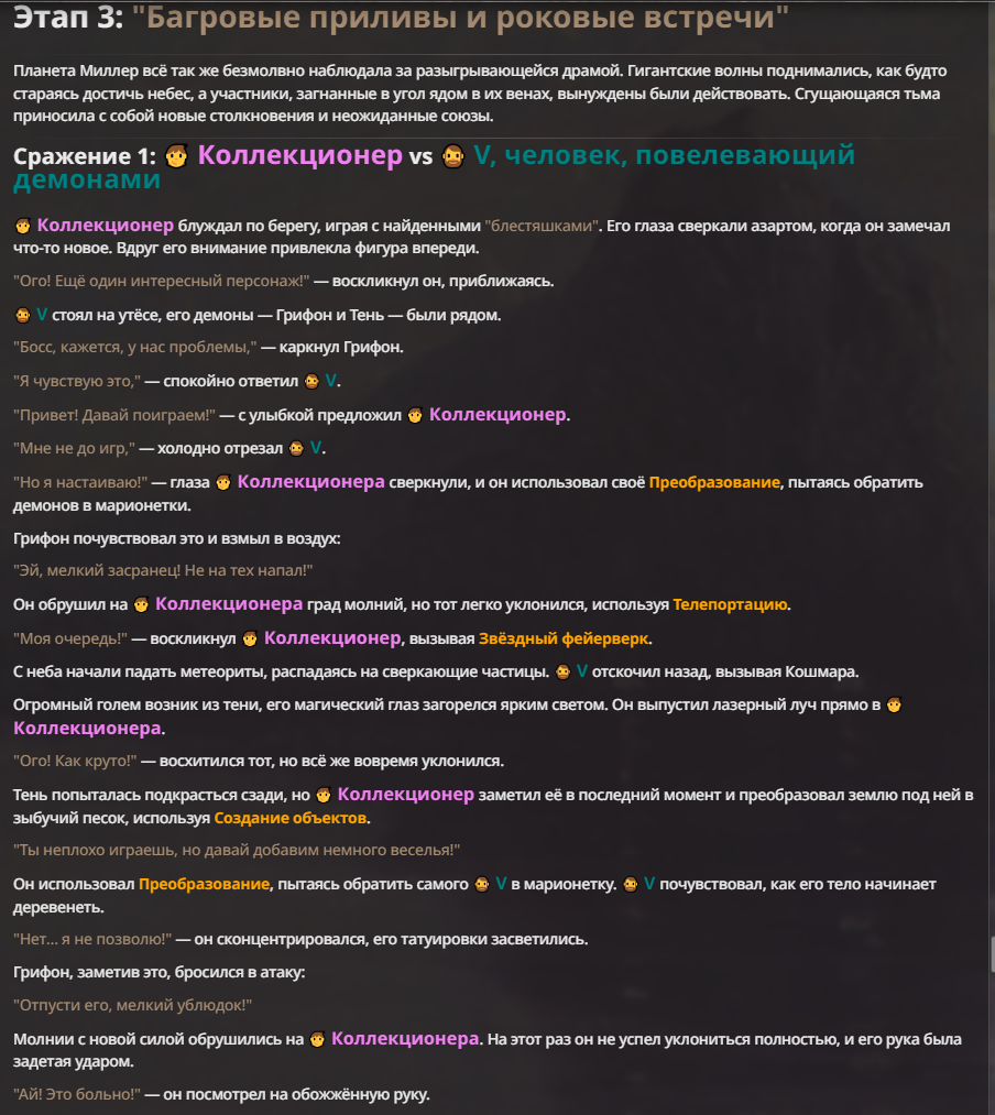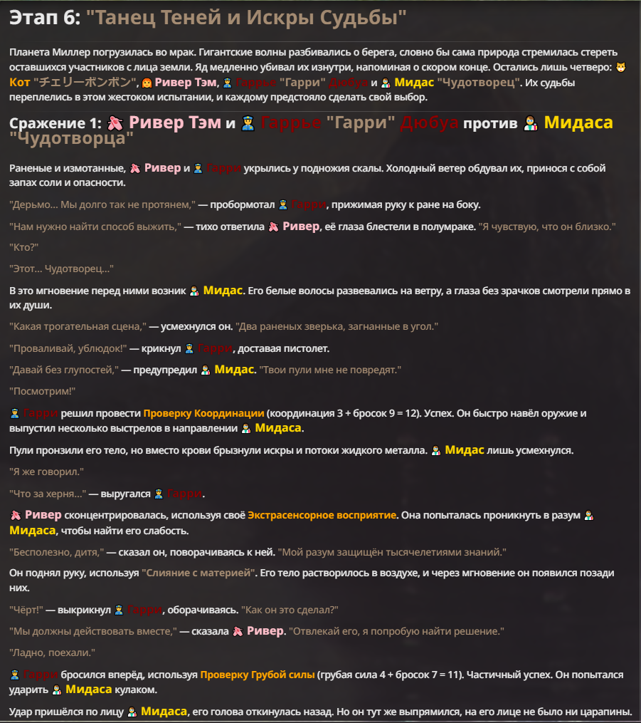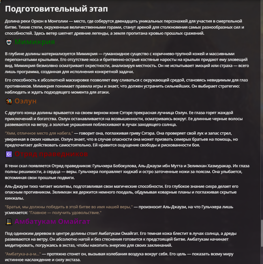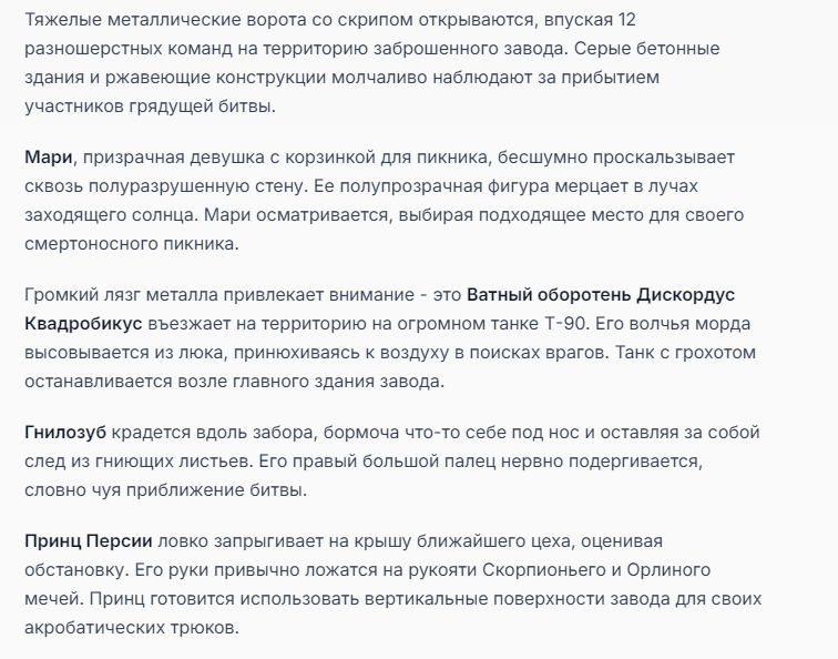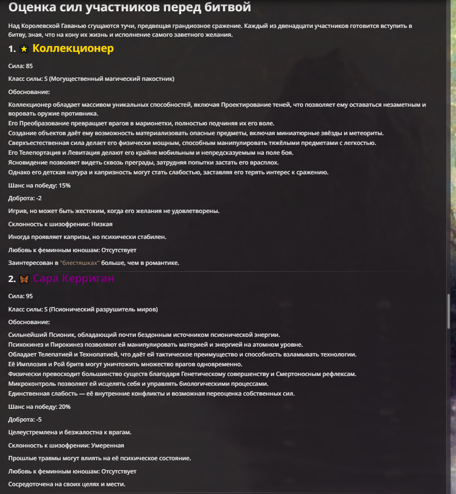 Я ебал аноны. Хуета какая. Гопота проебывает персонажей, путает способности, не может нормально отобразить потери. Чет я не справляюсь, мб промт хуйня, мб версия гопоты не так. Я спать. Приношу извинения что не смог провести нормальных боев и так сильно выебывался на Злокота.