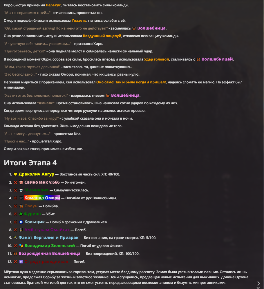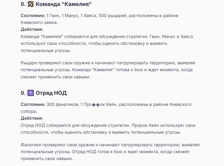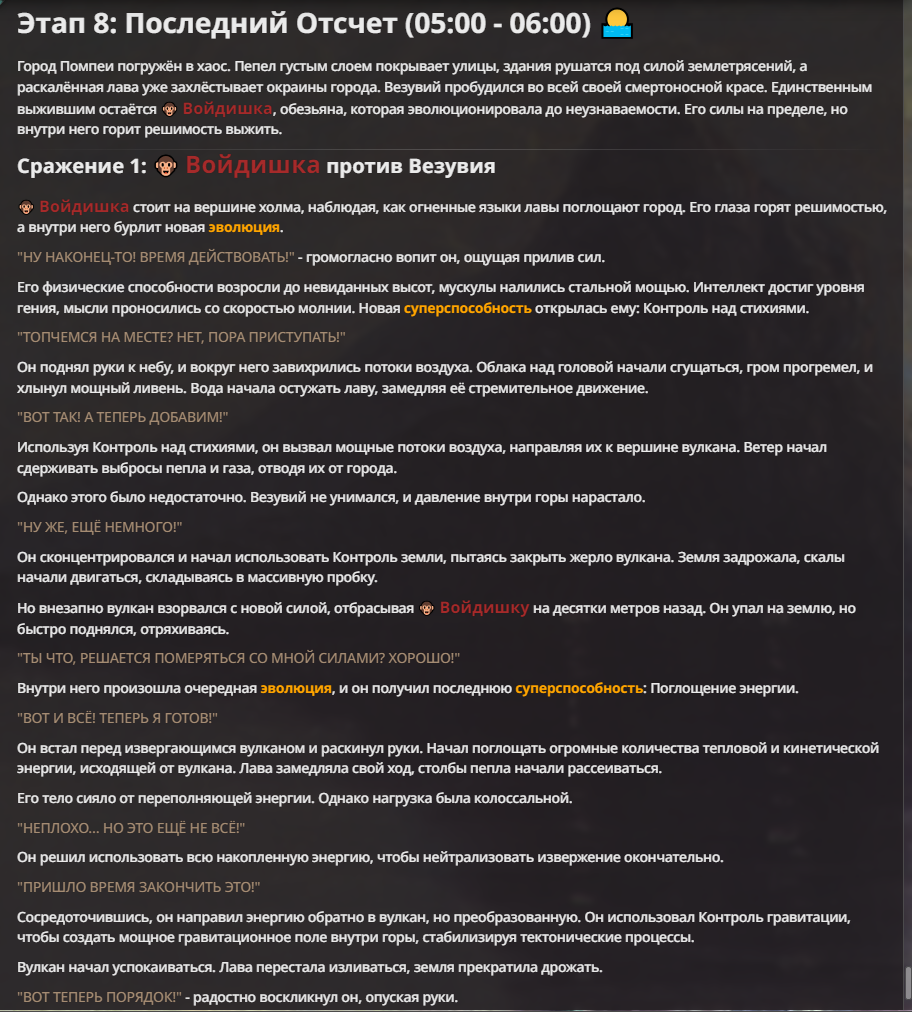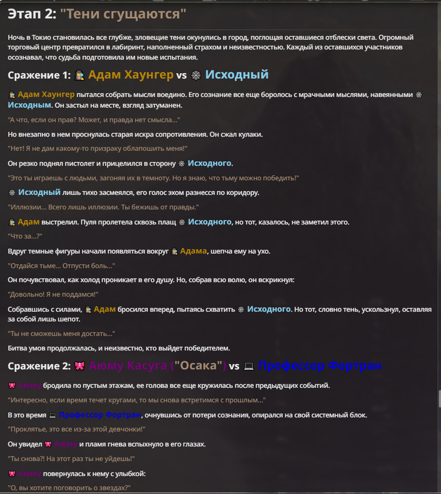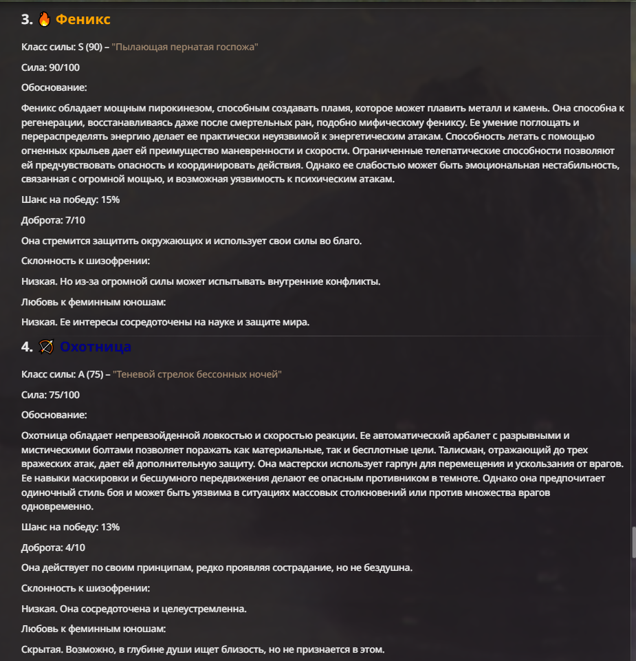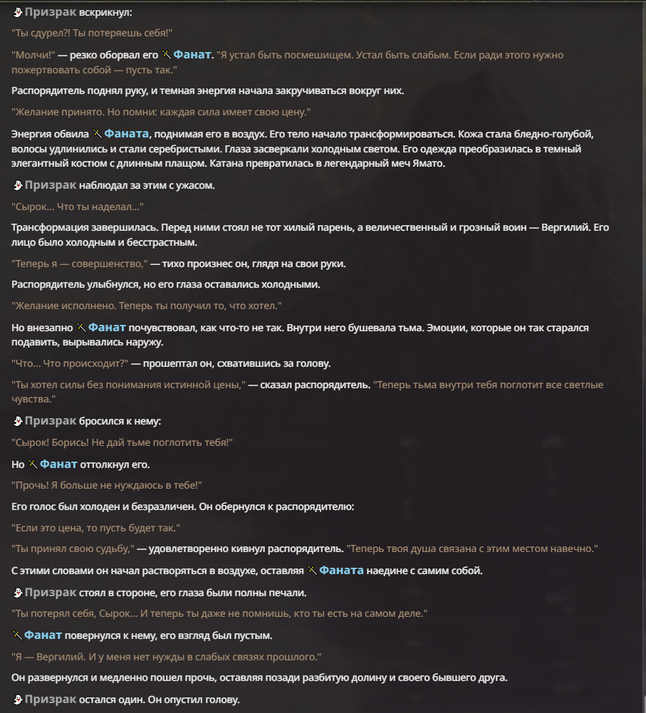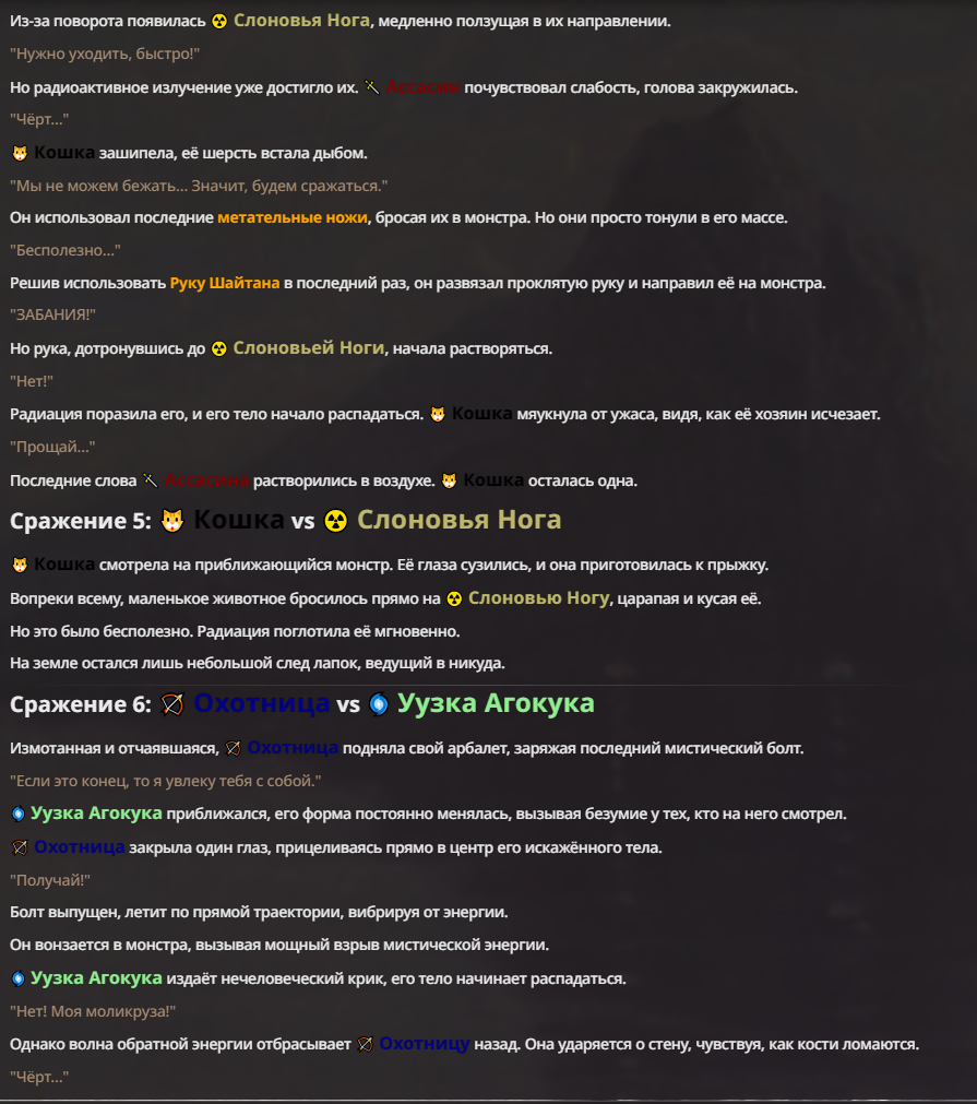 Я ебал аноны. Хуета какая. Гопота проебывает персонажей, путает способности, не может нормально отобразить потери. Чет я не справляюсь, мб промт хуйня, мб версия гопоты не так. Я спать. Приношу извинения что не смог провести нормальных боев и так сильно выебывался на Злокота.
