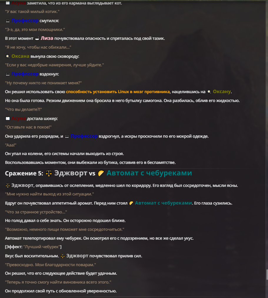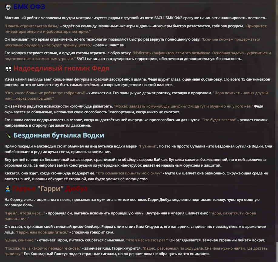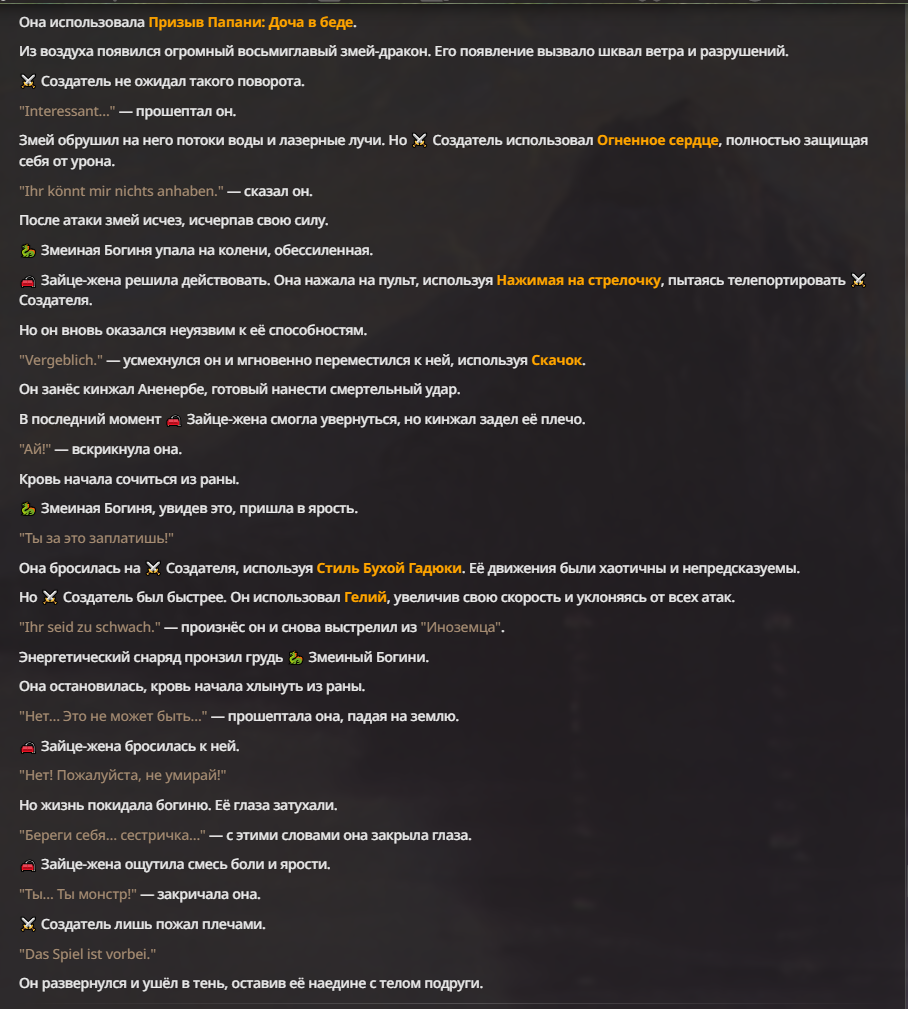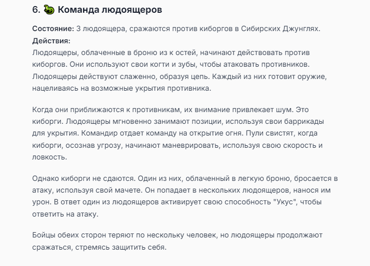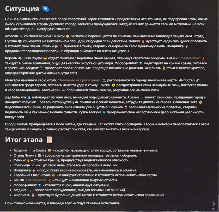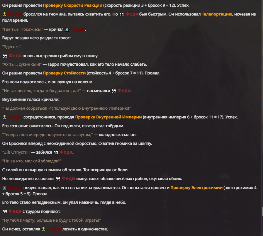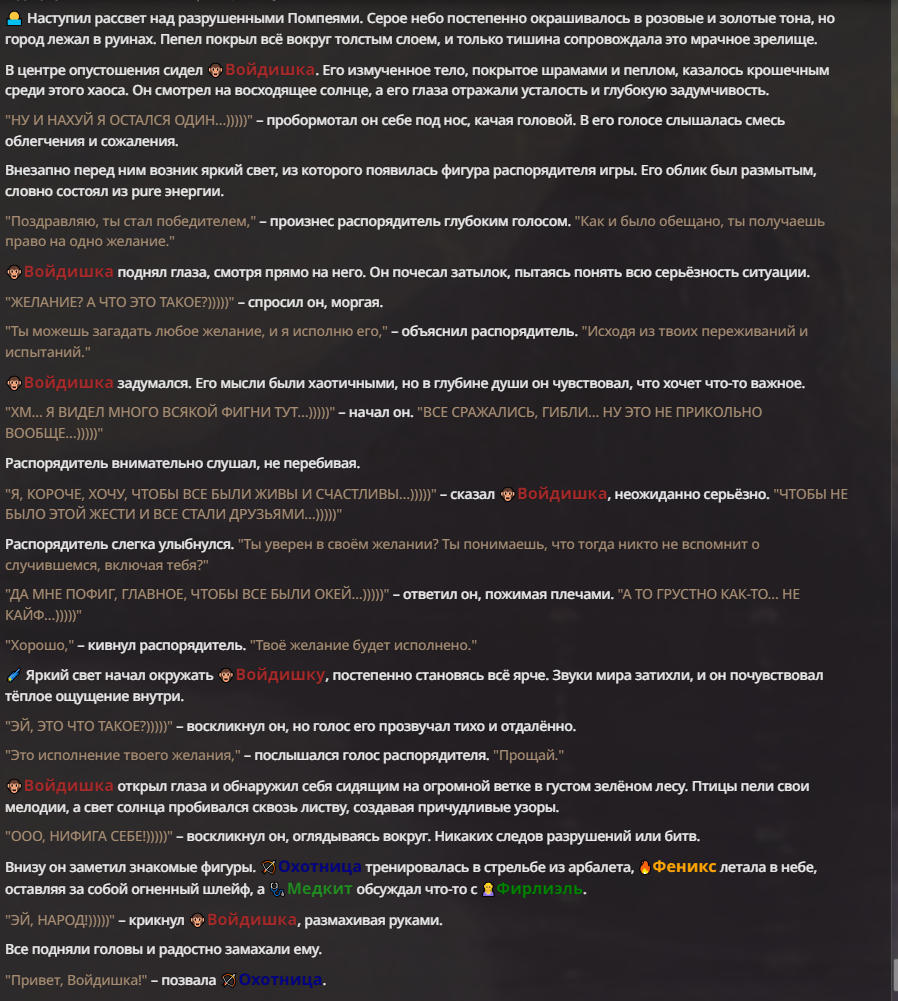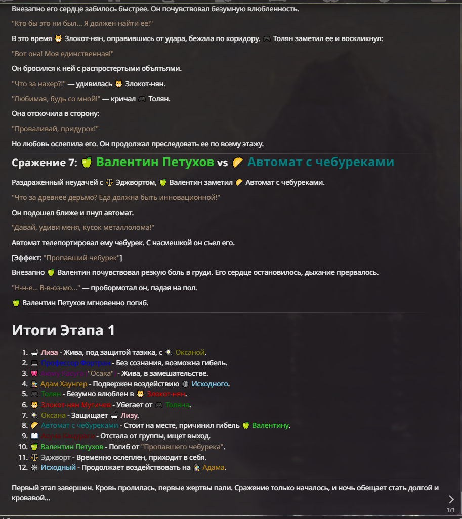 Я ебал аноны. Хуета какая. Гопота проебывает персонажей, путает способности, не может нормально отобразить потери. Чет я не справляюсь, мб промт хуйня, мб версия гопоты не так. Я спать. Приношу извинения что не смог провести нормальных боев и так сильно выебывался на Злокота.