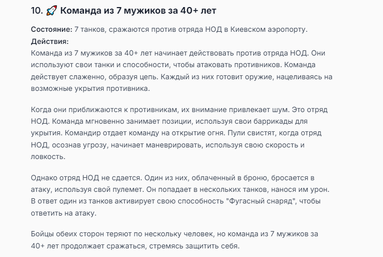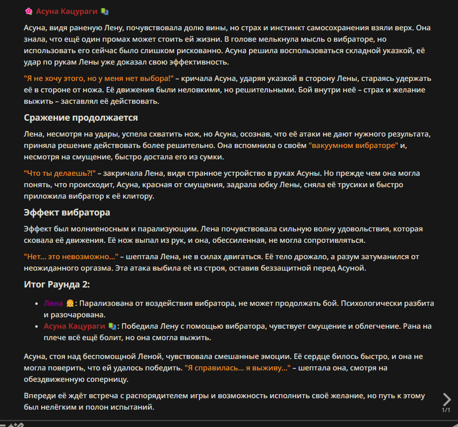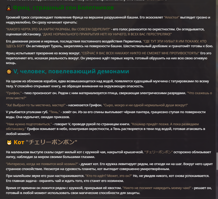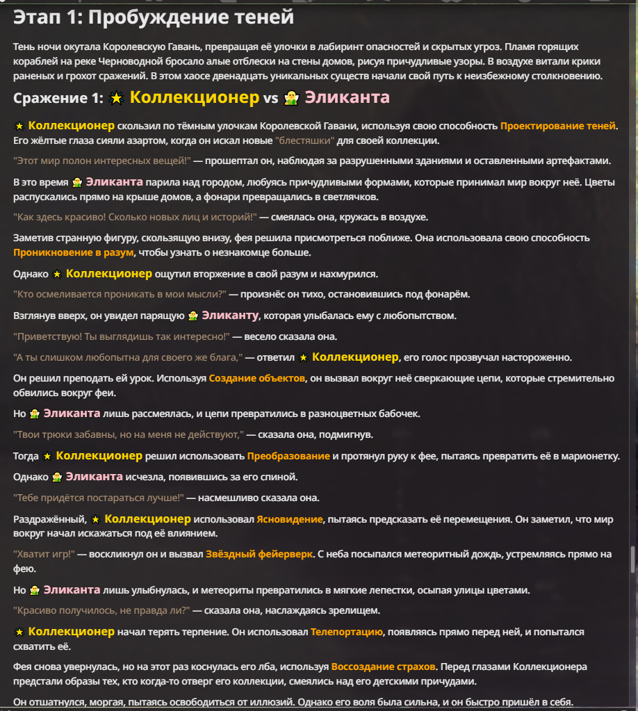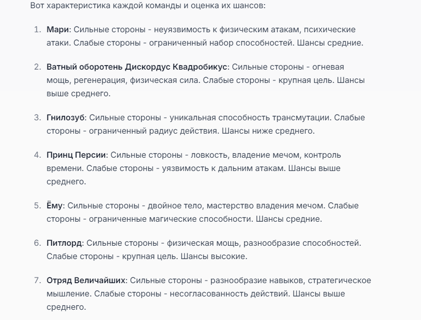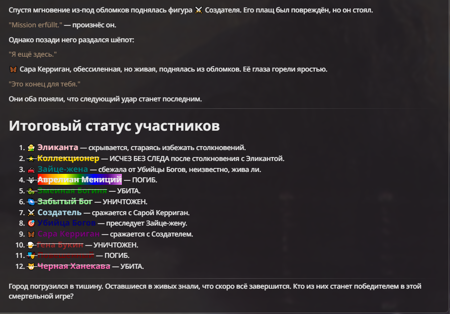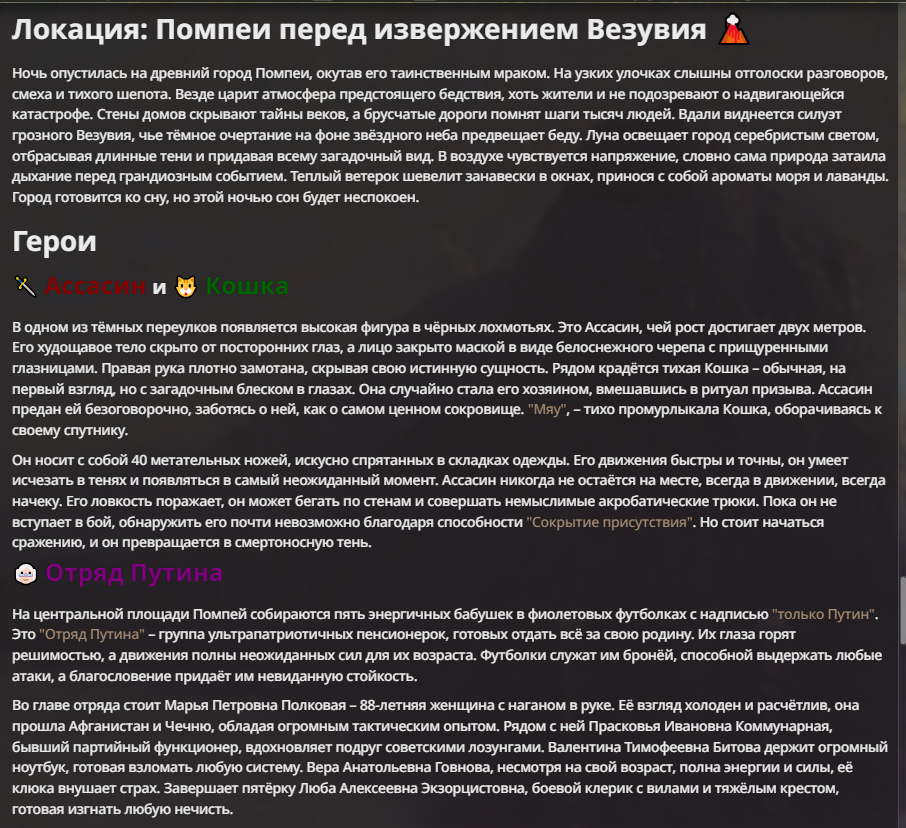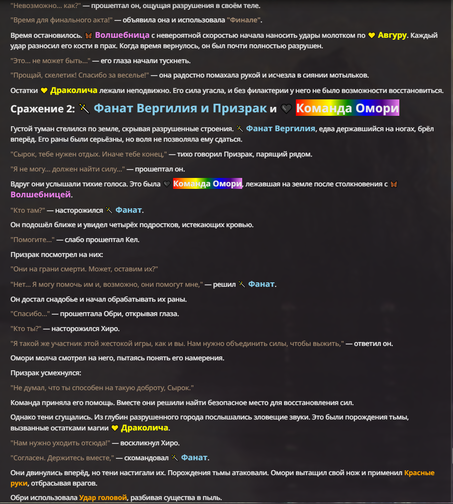 Я ебал аноны. Хуета какая. Гопота проебывает персонажей, путает способности, не может нормально отобразить потери. Чет я не справляюсь, мб промт хуйня, мб версия гопоты не так. Я спать. Приношу извинения что не смог провести нормальных боев и так сильно выебывался на Злокота.