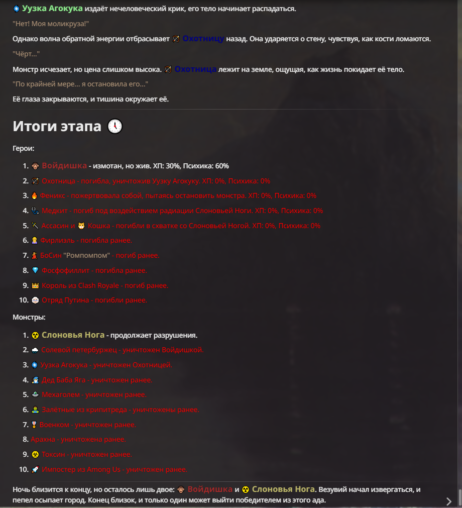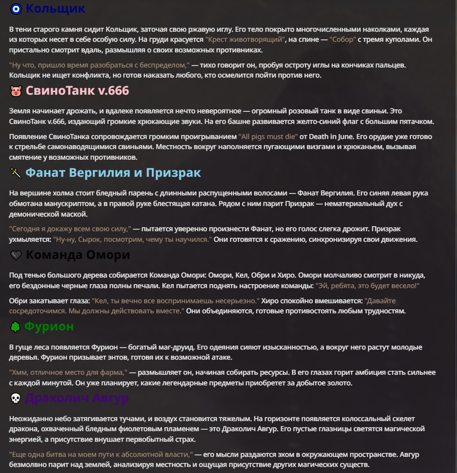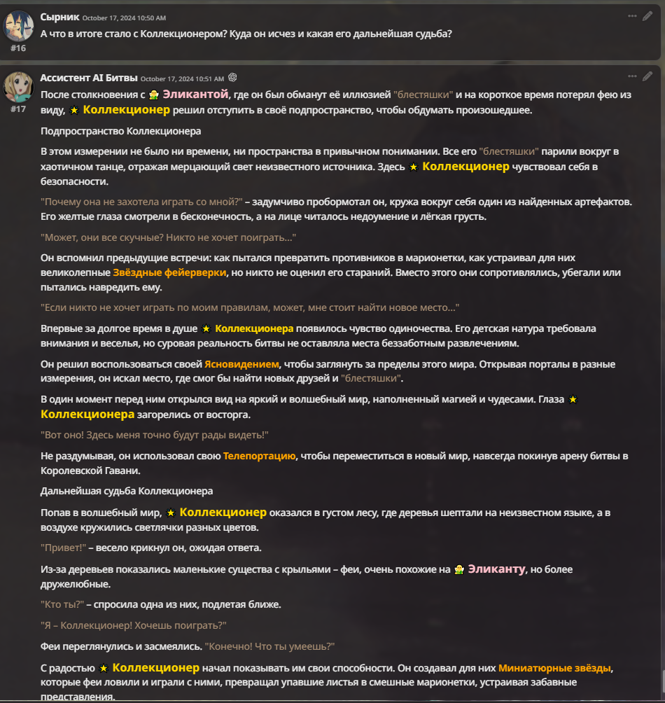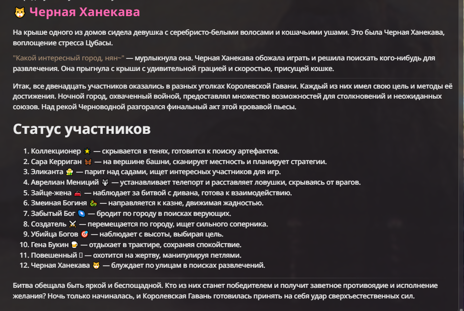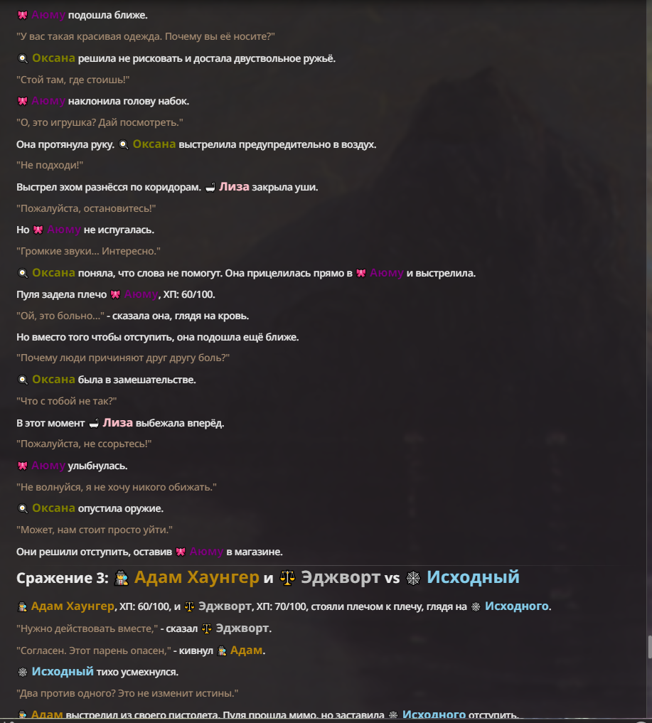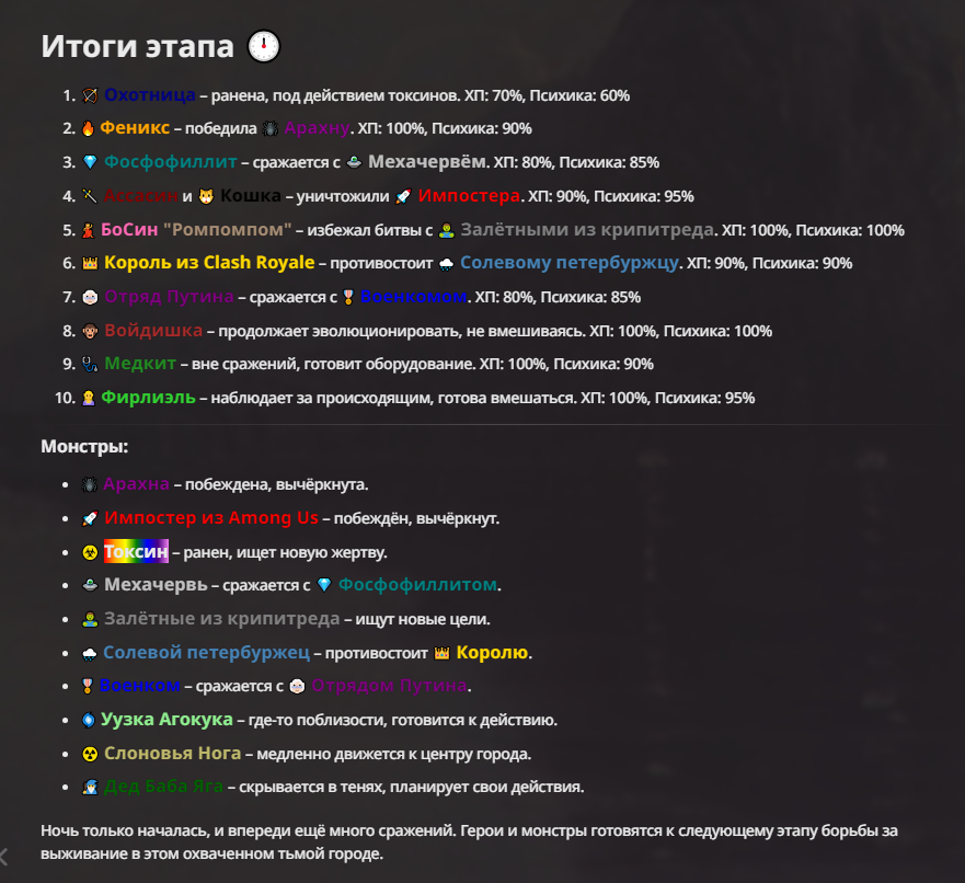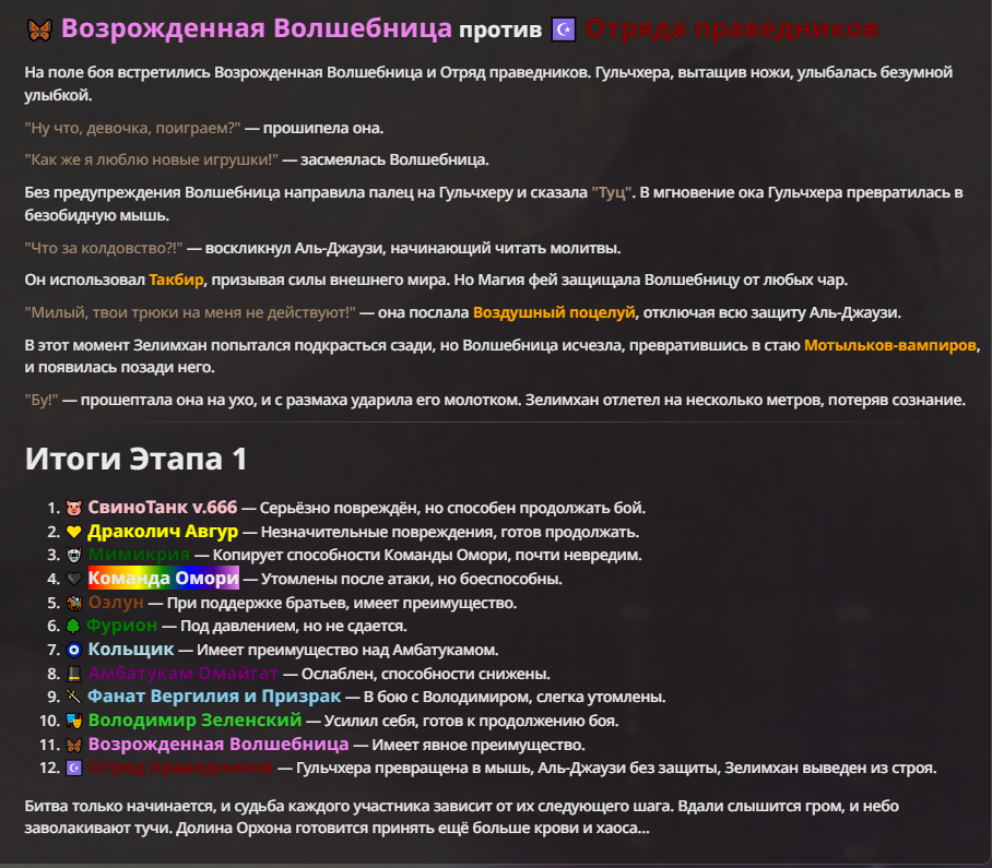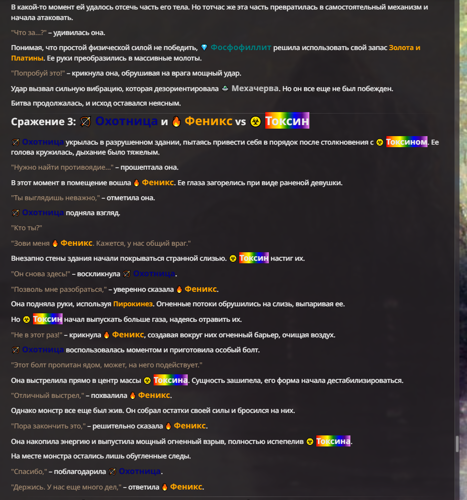 Я ебал аноны. Хуета какая. Гопота проебывает персонажей, путает способности, не может нормально отобразить потери. Чет я не справляюсь, мб промт хуйня, мб версия гопоты не так. Я спать. Приношу извинения что не смог провести нормальных боев и так сильно выебывался на Злокота.