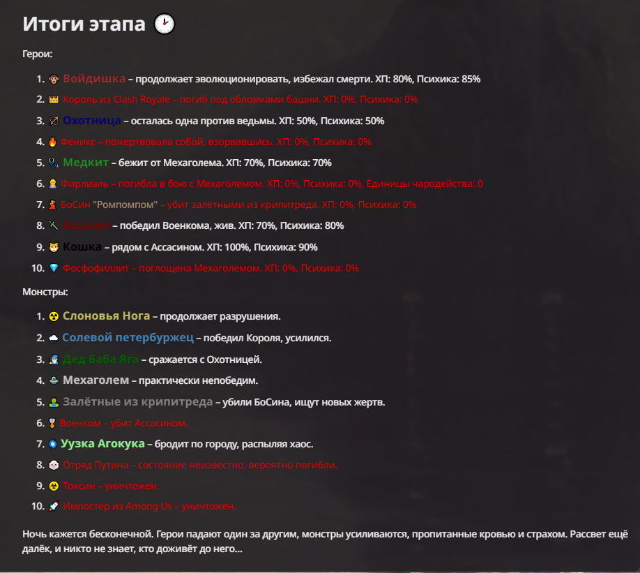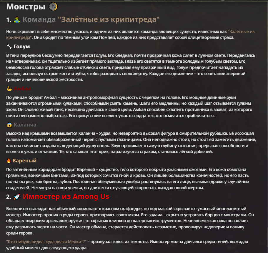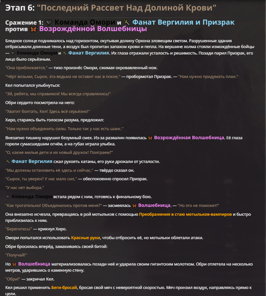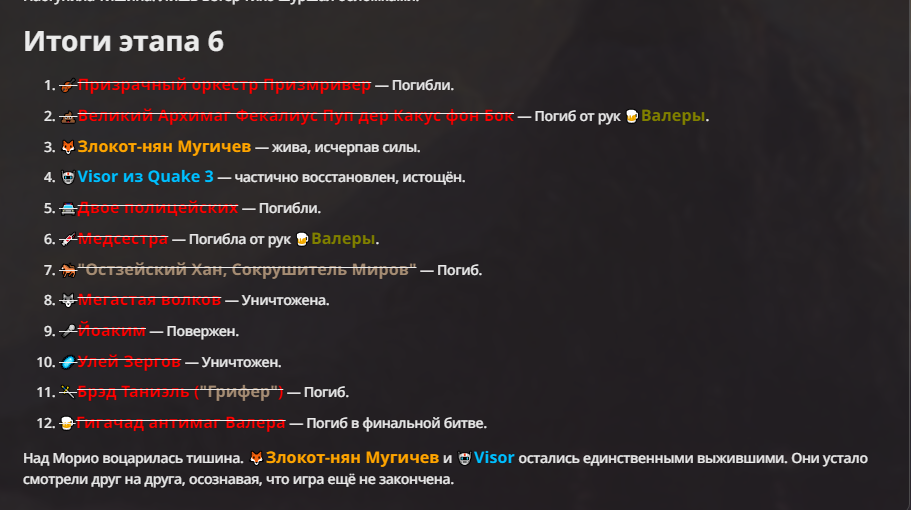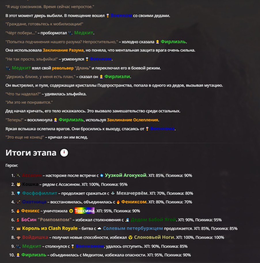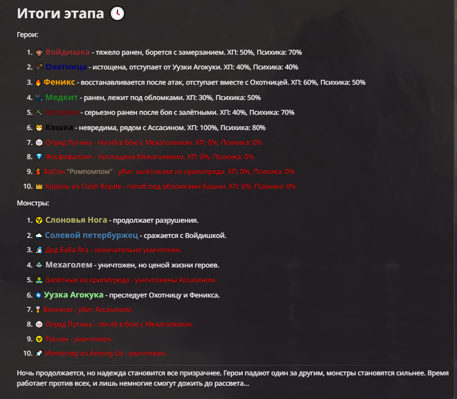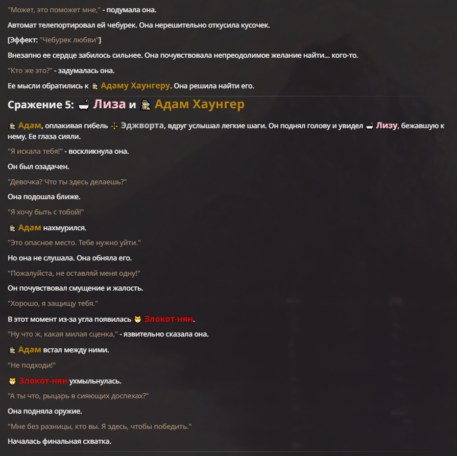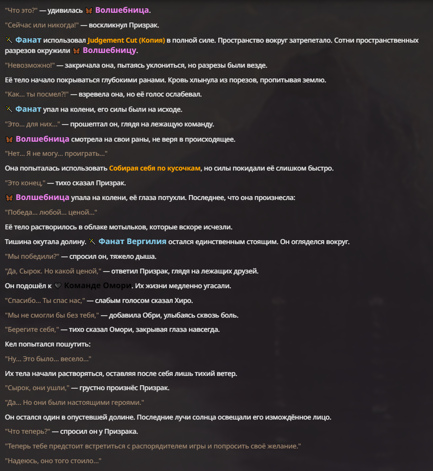 Я ебал аноны. Хуета какая. Гопота проебывает персонажей, путает способности, не может нормально отобразить потери. Чет я не справляюсь, мб промт хуйня, мб версия гопоты не так. Я спать. Приношу извинения что не смог провести нормальных боев и так сильно выебывался на Злокота.