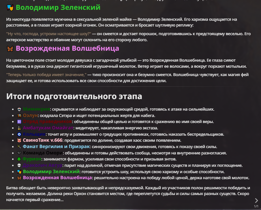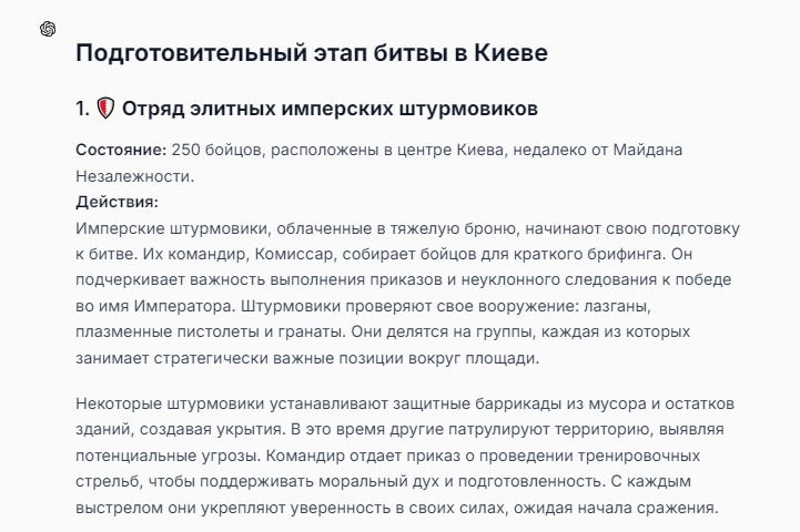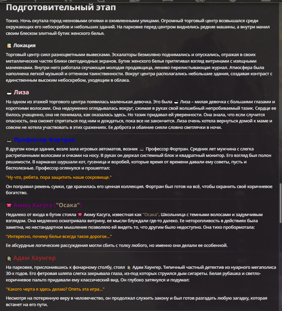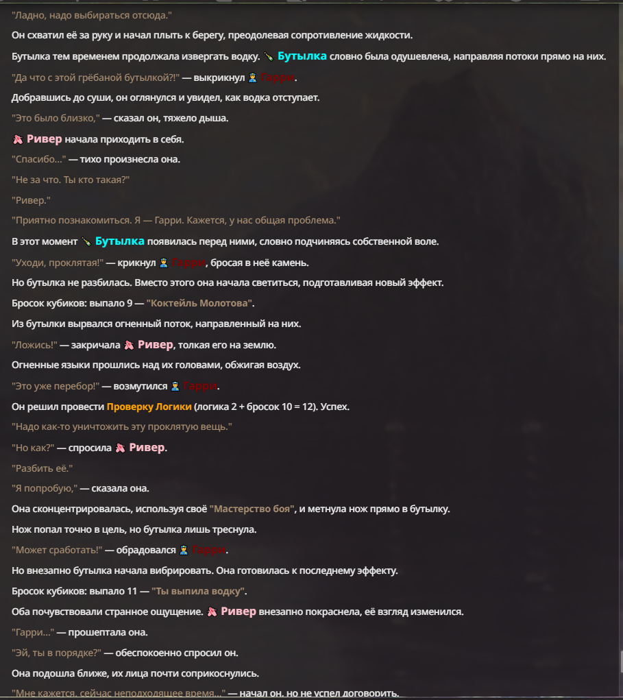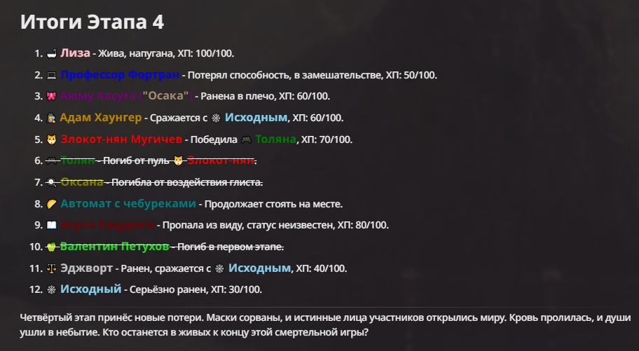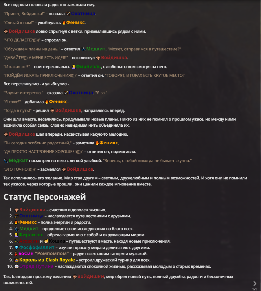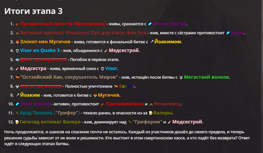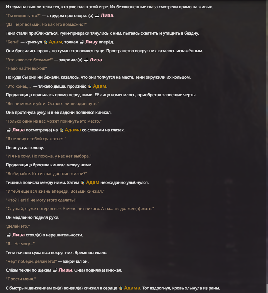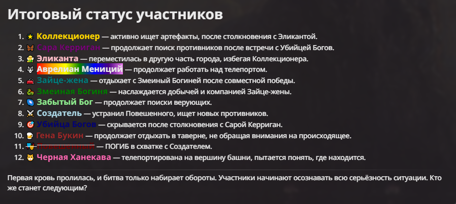 Я ебал аноны. Хуета какая. Гопота проебывает персонажей, путает способности, не может нормально отобразить потери. Чет я не справляюсь, мб промт хуйня, мб версия гопоты не так. Я спать. Приношу извинения что не смог провести нормальных боев и так сильно выебывался на Злокота.