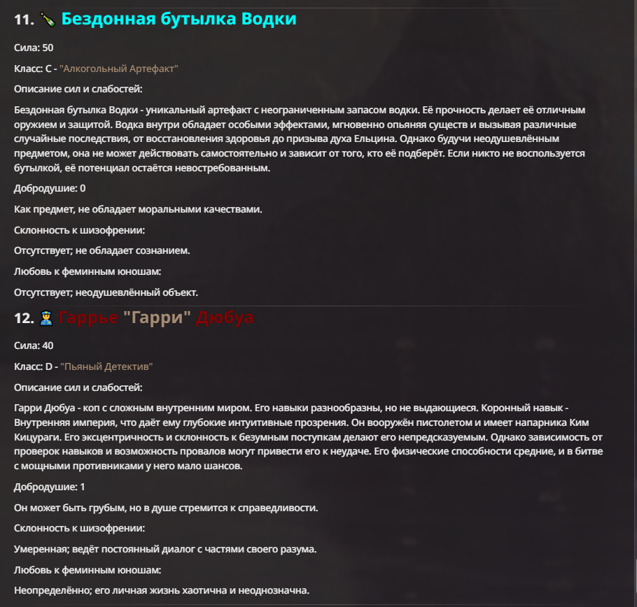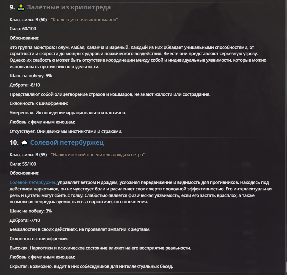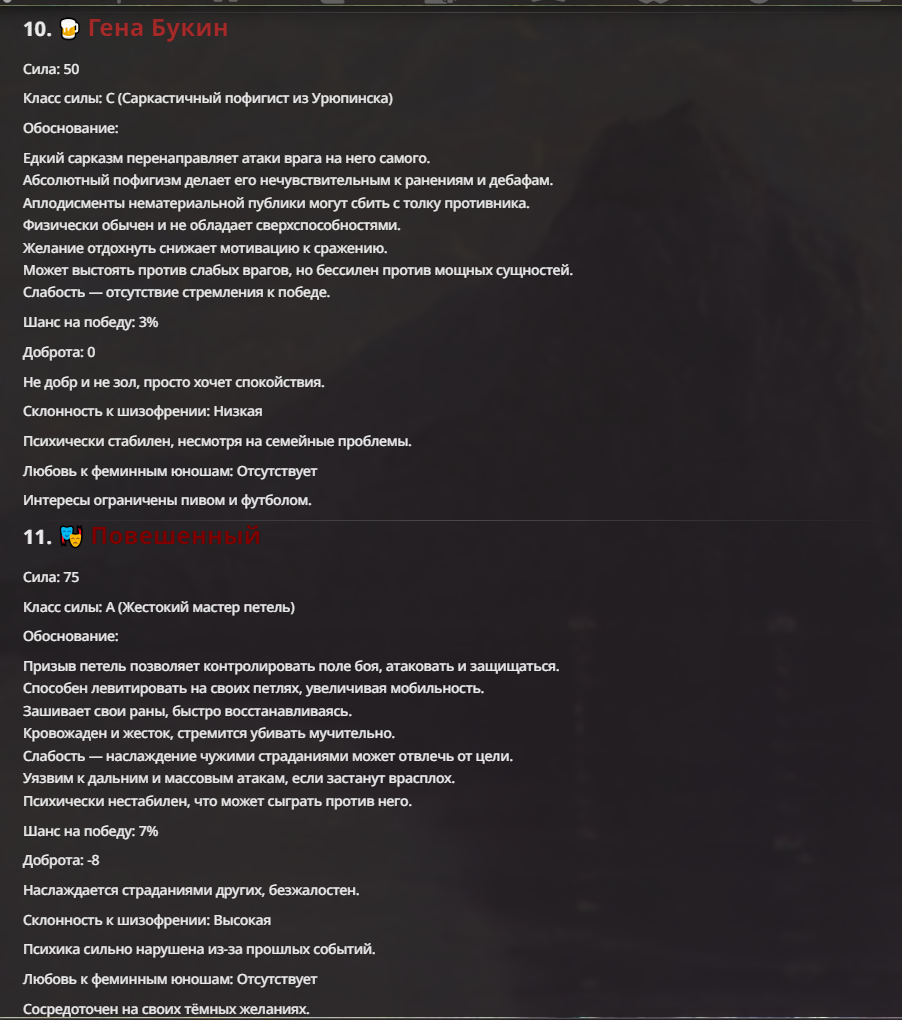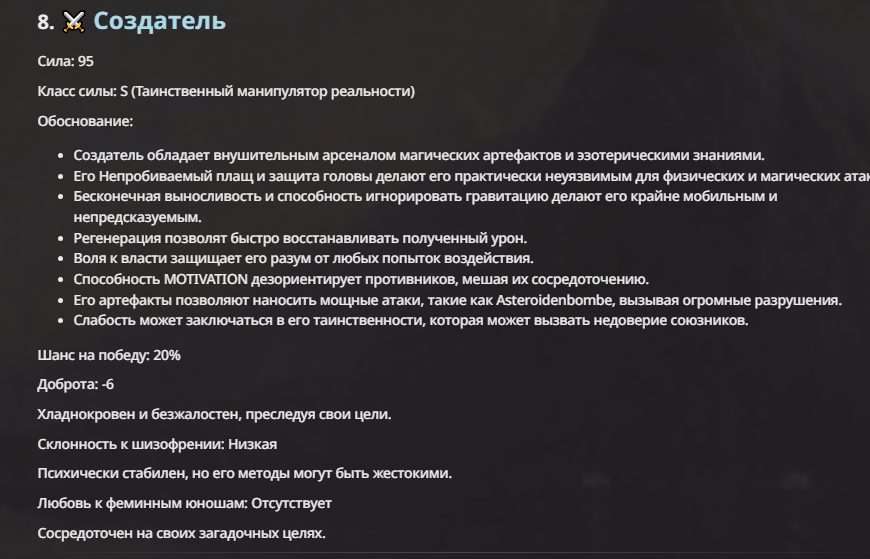 Создатель - йобун, мощный, базара ноль. Гудвин - туп получился перебаффанным ебланом и сейчас в переработке. Исходный - ну, с ним вышел мем, что я не хотел делать его слишком слабым. По задумке он должен доводить врага до суицида, но так как он физически полная немощь, то я решил допом прописать ему ебку (распад) реальности вокруг и все зашло далековато.