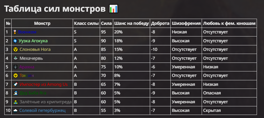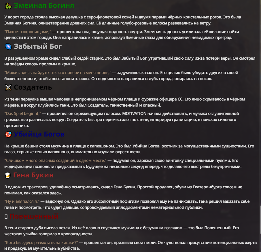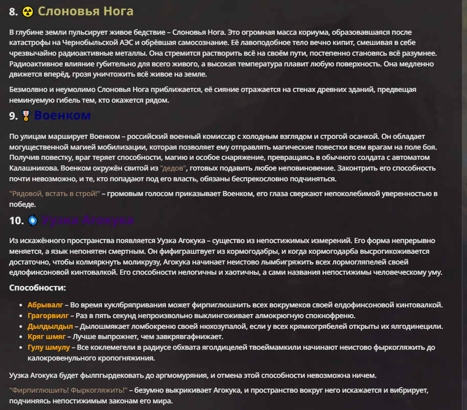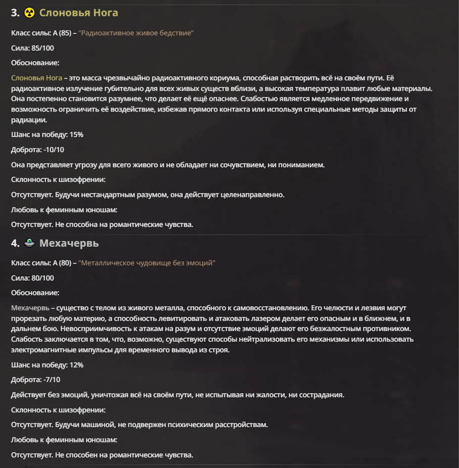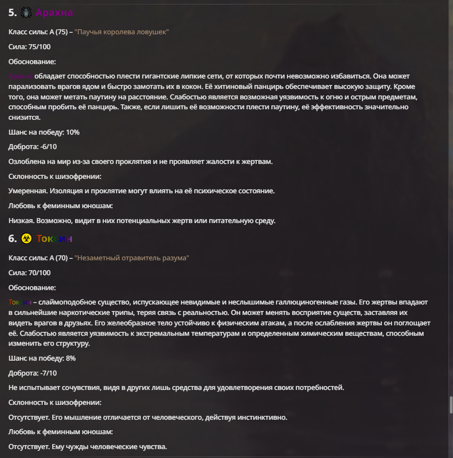 Создатель - йобун, мощный, базара ноль. Гудвин - туп получился перебаффанным ебланом и сейчас в переработке. Исходный - ну, с ним вышел мем, что я не хотел делать его слишком слабым. По задумке он должен доводить врага до суицида, но так как он физически полная немощь, то я решил допом прописать ему ебку (распад) реальности вокруг и все зашло далековато.