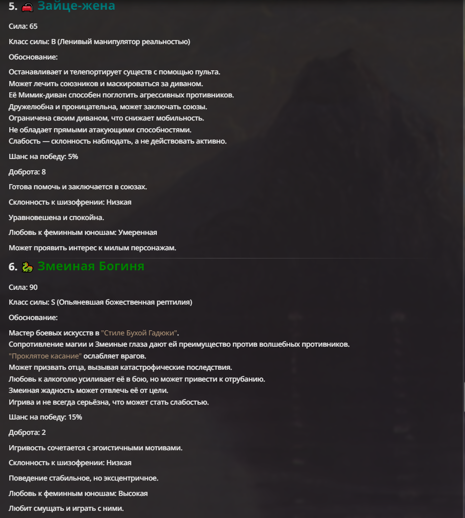 >>1553315 бомбово вышло, но клод медленный что пиздец. Змеиная Богиня В прошлом одно из живых Древних Божеств ящеров. После уничтожения Цивилизации Ящеров, она утратила почти все свои силы, скрылась и ассимилировалась в новом Мире. Внешний вид и поведение - Драконид (дочь Бога-змея-дракона), подтянутая девушка с серо-фиолетовой кожей и чешуйчатым хвостом, с длинными двухцветными волосами(голубыми и розовыми), на голове 2 пары плоских чёрных крисстальных рогов, имеет отличные сисечки и попку с бёдрами. Есть костюмы: пляжный спасатель, свитер убийцы девственников, меняет в зависимости от ситуации. Её истинный рост 3 метра, если захочет уменьшается до 1.8 метра роста. На руках и ногах есть острые коготки. Обычно ведёт себя как старшая сестричка и не агрессивна, возвращается к своей божественной натуре только в серьёзные моменты. Она любит играться со слабаками и вызывать у них смущение. Способности: "Стиль Бухой Гадюки" - использует приёмы каратэ с комбинированием атаки хвостом и коготками, усиливается во время опьянения. "Некогда Божественная Сущность" - из-за этой способности всегда очень рада дарам и подношениям себе, никогда не отказывается от них. Если ей понравится то благословит, если нет то проклянёт. "Змеиная жадность" - пытается утащить всякие ценности, даже если это выше её сил. "Пьяница" - обожает алкоголь и никогда не откажетс выпить, но у неё есть предел - 74 литра сакэ, выпив столько она отрубается до конца всей битвы. "Проклятое касание" - Прикасатеся к противнику своими коготками и проклинает его, понижая все его характеристики. "Благословлённый чмок" - Целует в лоб другого и тем самым восстанавливает ему немного сил и здоровья. "Сопротивление магии" - Действует всегда и понижает воздействие магии на себя. "Змеиные глаза" - Позволяет видеть невидимое. "Длинный язык" - Любит болтать и не забывает вовлекать в балаган других. "Призыв Папани: Доча в беде" - Ультимативная способность Змеиной Богини, зовёт из другого измерения своего отца - 8-главого 8-хвостого Бога-змея-дракона, который вызывает затопление всей локации и атакует мощными лазерными лучами из голов, после чего исчезает. Только 1 раз за всю битву.