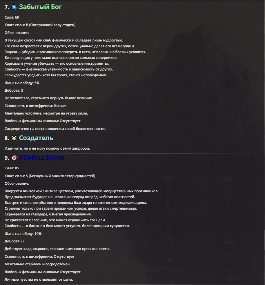 По мне так надо просто запретить некоторые слова в промпты прописывать. Например: бог, божественное, неуязвимость более чем к одному свойству (неуязвимые к ко всему, непробиваемые, стойкие к магии разума, окружения, - это шиза).