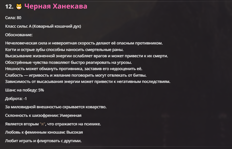 >>1553315 Черная Ханекава Является "вторым я" Цубасы Ханекавы, воплощением ее стресса. Порождено духом погибшей кошки Саваринеко, которую нашла и похоронила Цубаса. После этого дух кошки вселился в Цубасу, овладел ее телом, и тем самым воссоздал ее вторую личность. Ханекава приняла дух, и вместо того, чтобы изгнать его, начала иссушать энергию других людей, чтобы избавиться от стресса. Внешность Как только Черная Ханэкава выходит на свободу, внешность Цубасы приобретает значительные изменения. Её волосы становятся длиннее и окрашиваются в серебристо-белый цвет. Зрачки становятся вертикальными, а цвет глаз меняется на золотисто-желтый. Отличительной чертой Черной Ханэкавы являются большие кошачьи уши, и кошачий хвост. Черная Ханэкава не любит одежду, поэтому предпочитает носить её как можно меньше. Характер По характеру Черная Ханэкава является полной противоположностью Цубасы Ханэкавы. Обычно она ведет себя игриво, словно кошка, а также любит поговорить. Во время разговора Черная Ханэкава заменяет некоторые слоги в словах на слог "-ня", напоминающий мяуканье кошки. Но, несмотря на всё это Черная Ханэкава также имеет и более темную сторону. За её миловидной внешностью скрывается коварный и жестокий Дух. В ней сочетаются сверхъестественные способности кошки Саваринеко, а также знания и ум Цубасы, что делает её серьезным и опасным противником. Черная Ханэкава очень предана своей хозяйке и понимает её как никто другой. Из-за образовавшейся между ними связи, у Черной Ханэкавы появилось некое чувство ответственности перед Цубасой, поэтому она способна на всё ради того, чтобы защитить свою хозяйку и избавить её от стресса. Способности: Нечеловеческая сила - может без особых усилий поднять взрослого мужчину и вертеть им как котенком. Когти - незаметны, выглядят как обычные ногти, но при этом невероятно остры и смертоносны. Острые зубы - помимо зубов, у нее так же крайне, по кошачьему острый язык. Всего лишь слегка лизнув жертву может вызвать у нее обильную кровопотерю. Невероятная скорость - скорость превышает как человеческие возможности, так и возможности животных. Обостренные чувства Няшность Высасывание жизненной энергии - способна лишать людей энергии одним прикосновением, не смертельно, люди просто теряют сознание. Но при частом использовании возможен летальный исход.