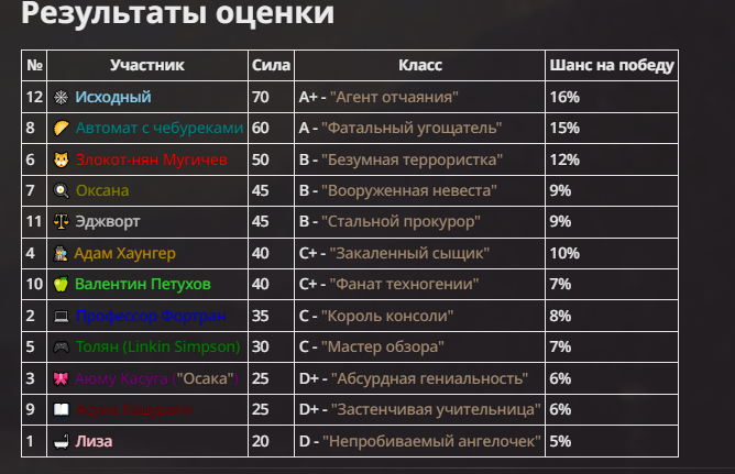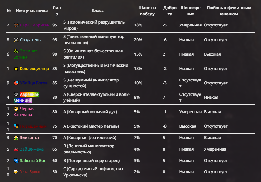 Щас пытаюсь всех как-то к адекватным значениям привести и какую-то уникальность придать. Разве-что Создателя вбросил ради прикола.