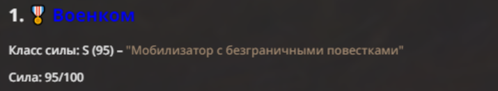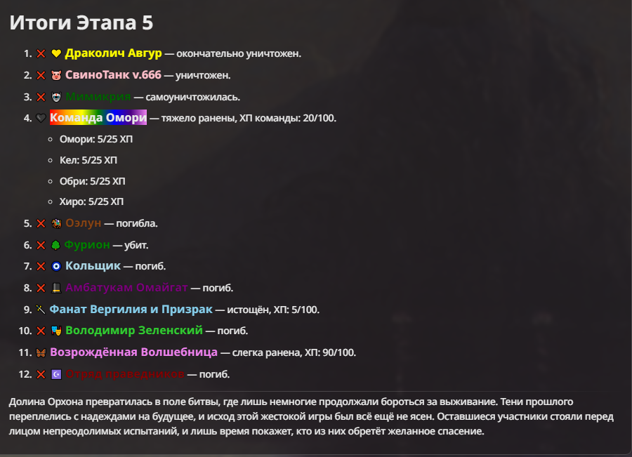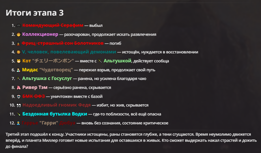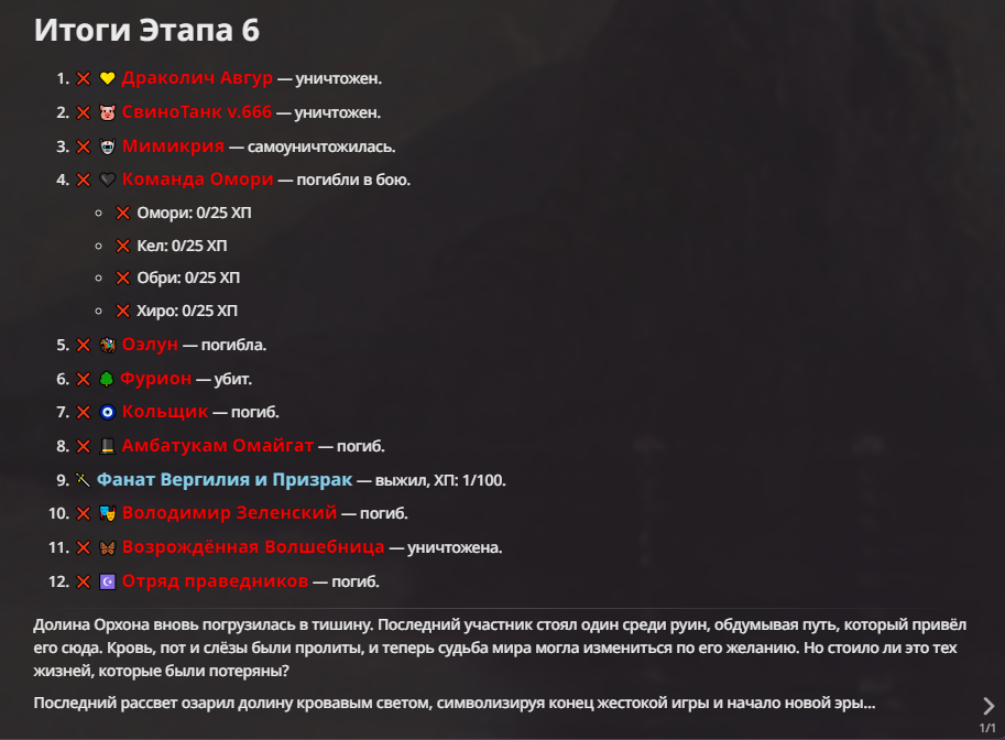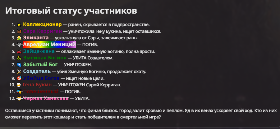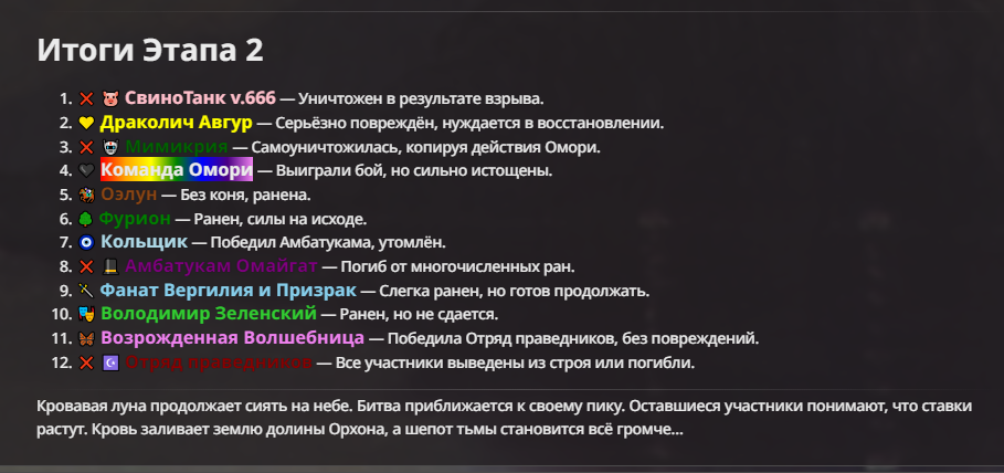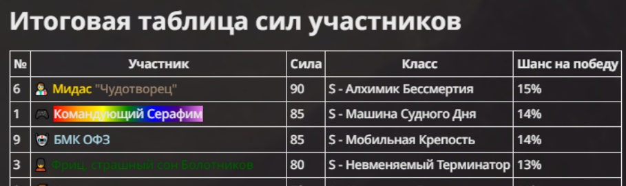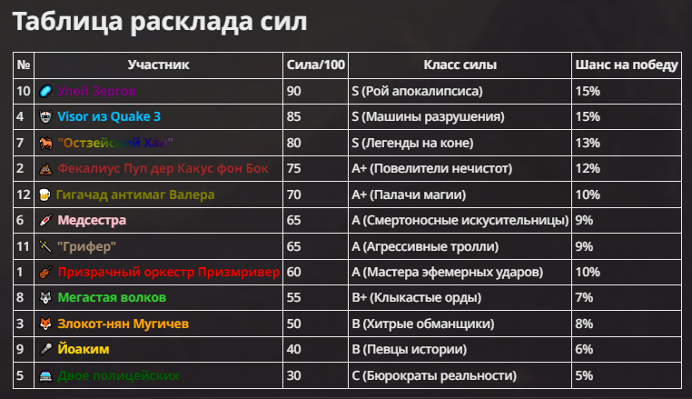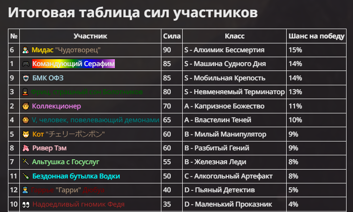 Правила(могут меняться в зависимости от ОПа): 1. Максимум в бою могут участвовать 12 персонажей. После этого набор закрывается и начинается битва. 2.Нельзя предлагать персонажей на около божественном уровне силы. 3.Персонажи с напарниками НЕ запрещены В РАЗУМНЫХ ПРЕДЕЛАХ, с соблюдением баланса сил. Никаких легионов космодесанта. Upd. Уточняйте у текущего ОПа. 4.После участия в бою персонаж уходит на перерыв в 3 боя(сделано для защиты от спамеров одного персонажа). 5.Нельзя предлагать персонажей которые могут призывать других существ без каких-либо условий. Пример: Маг который призывает демонов по щелчку пальцев == не допускается. Маг которому нужны трупы или какой-то длительный ритуал с условиями для призыва демона == допускается. 6.После использования локации она выбивается из случайного списка на 9 боёв.(Почему так много? Ради разнообразия) Upd. Формат может меняться в зависимости от ОПа 7.Набор персонажей полностью закрывается после начала боя и открывается только когда он закончится и будет объявлен новый набор. 8. Ведущий оставляет за собой право не принять вашего персонажа. Будьте корректны - в случае, если такое произошло, вежливо спросите причину и/или дождитесь другого ведущего.