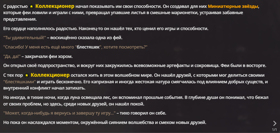 Коллекционер Общее описание: Коллекционер – это невысокое гуманоидное существо из расы древних могущественных небесных существ. С его загорелой желтой кожей и густыми белыми волосами он выглядит одновременно странно и обворожительно.У него загорелая жёлтая кожа, густые белые волосы и брови, большое бледно-голубое пятно, которое затмевает левую сторону его лица, придавая правой стороне форму полумесяца. Глаза Коллекционера жёлтые, с узкими зрачками и алыми радужками. Его одежда напоминает пижаму – темно-синяя справа и серая слева, отражая его двойственную натуру. Личность: Коллекционер обладает детскими чертами – он игривый, любознательный и часто капризный. Он легко увлекается новыми развлечениями и заставляет окружающих участвовать в своих безумных и опасных играх. Несмотря на свою игривую натуру, он может быть весьма разрушительным и жестоким, когда его желания не удовлетворяются. Агрессия и нетерпение проявляются, когда он чувствует, что его потребности игнорируются, или когда он чувствует, что его обманывают. Глубокий внутренний конфликт между желанием близости и страхом быть брошенным делает его личность сложной и многослойной. У Коллекционера нет упоминаний о родителях. Коллекционер любит находить и забирать себе любые артефакты и интересные вещи, такие как оружие противника. Он называет их «блестяшками». Найденые «блестяшки» он держит в особом подпространстве, куда имеет доступ только он и больше никто другой. В случае опасности, он может ненадолго спрятаться в этом подпространстве сам. Он может использовать найденные и украденные вещи («блестяшки») в бою. Также он может найти артефакты с неизвестными свойствами на поле боя, и использовать их. Сила и навыки: 1.Проектирование теней:Коллекционер может манипулировать тенями, проходя мимо врагов незамеченным, а так же незаметно воровать с помощью теней оружие и артефакты противника. 2.Преобразование:Уникальная способность превращать врагов в деревянные или пластиковые марионетки, которыми он может управлять. 3.Создание объектов:Коллекционер может вызывать различные объекты из воздуха, включая миниатюрные звезды и метеориты, что позволяет ему использовать их в бою. 4.Сверхъестественная сила:Обладает невероятной физической силой, манипулирует тяжелыми предметами с легкостью. 5.Телепортация:Его способности к телепортации делают его непредсказуемым врагом. 6.Ясновидение:Он может видеть сквозь преграды. 7.Левитация:Он может парить в воздухе и поднимать другие предметы, создавая хаос на поле боя. 8.Звездный фейерверк:Создаёт великолепный метеоритный дождь, накатывающий на противников, что превращает сражение в зрелище. 9.«С тобой скучно!»:Долгие бои утомляют Коллекционера, поэтому он мгновенно телепортируется к другому противнику.