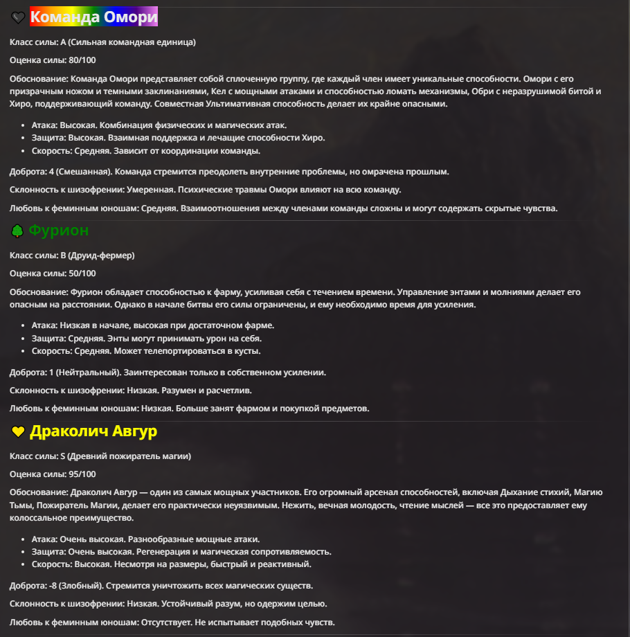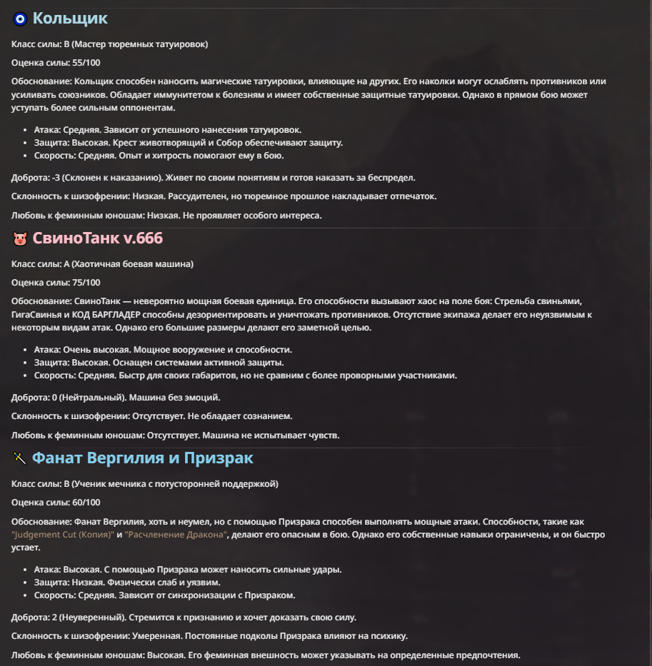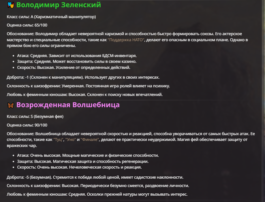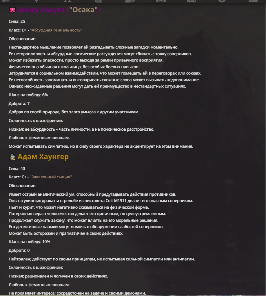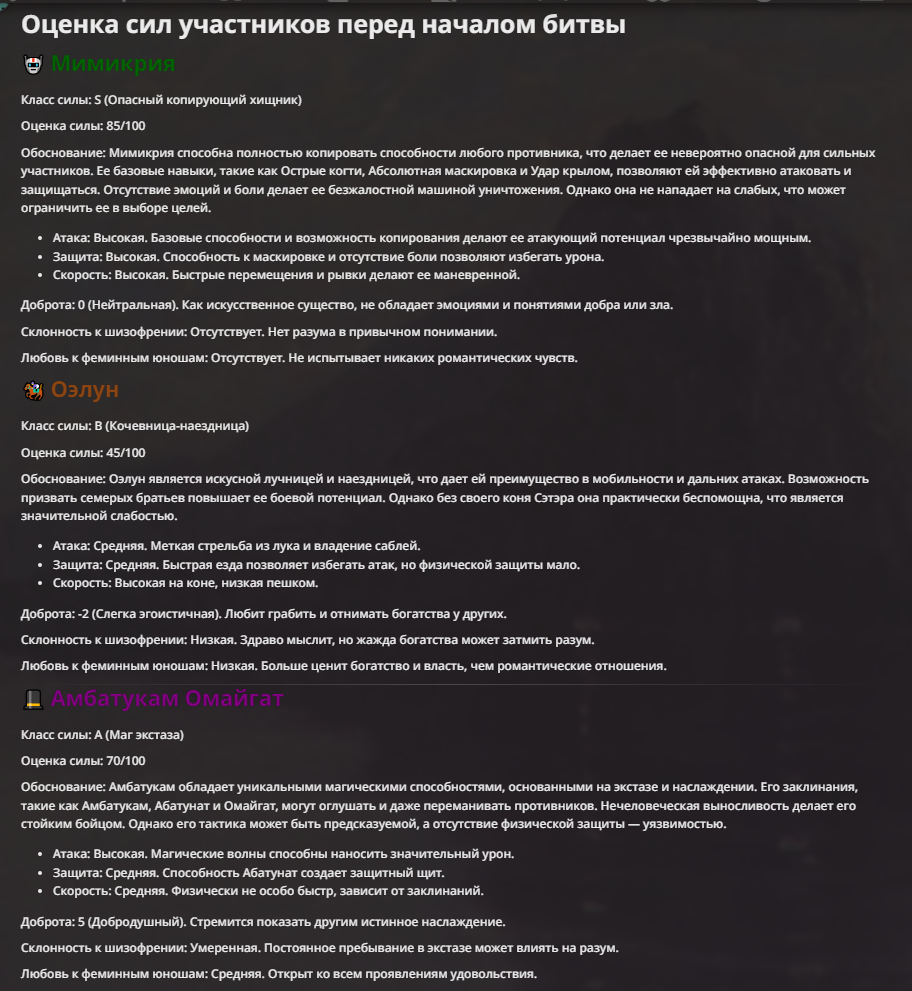 Мне не очень нравится, когда у персонажа пачкой прописаны иммуны. Тогда нейронка не особо понимает что с этим делать, и тогда чар либо отлетает каким-то смешным образом, либо просто ебет всех без вариантов.