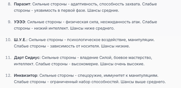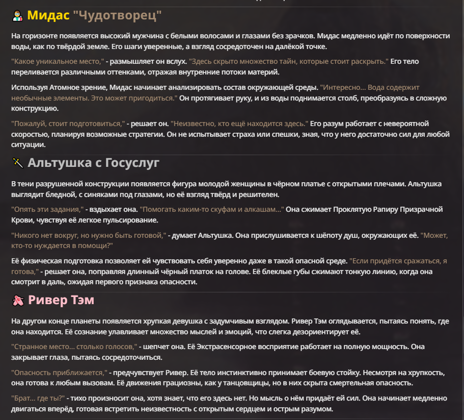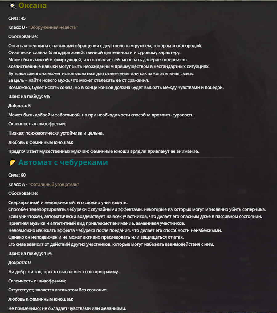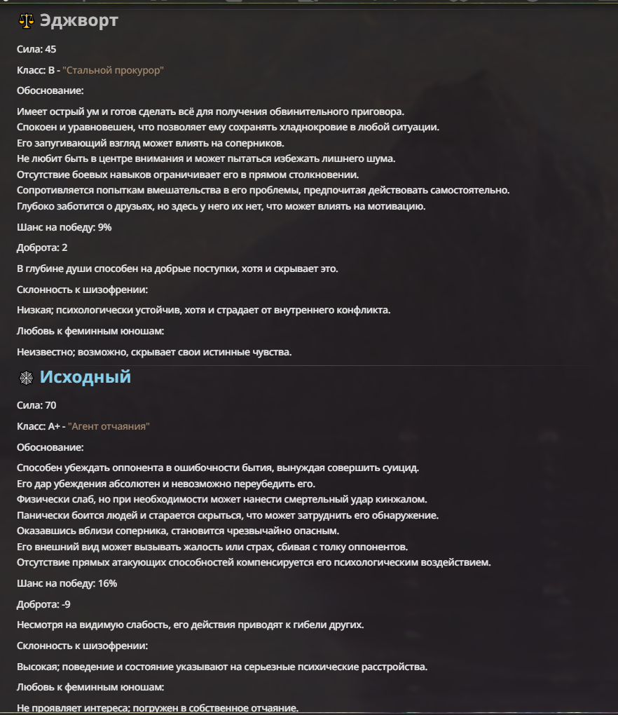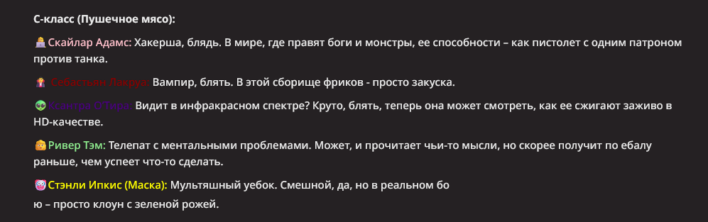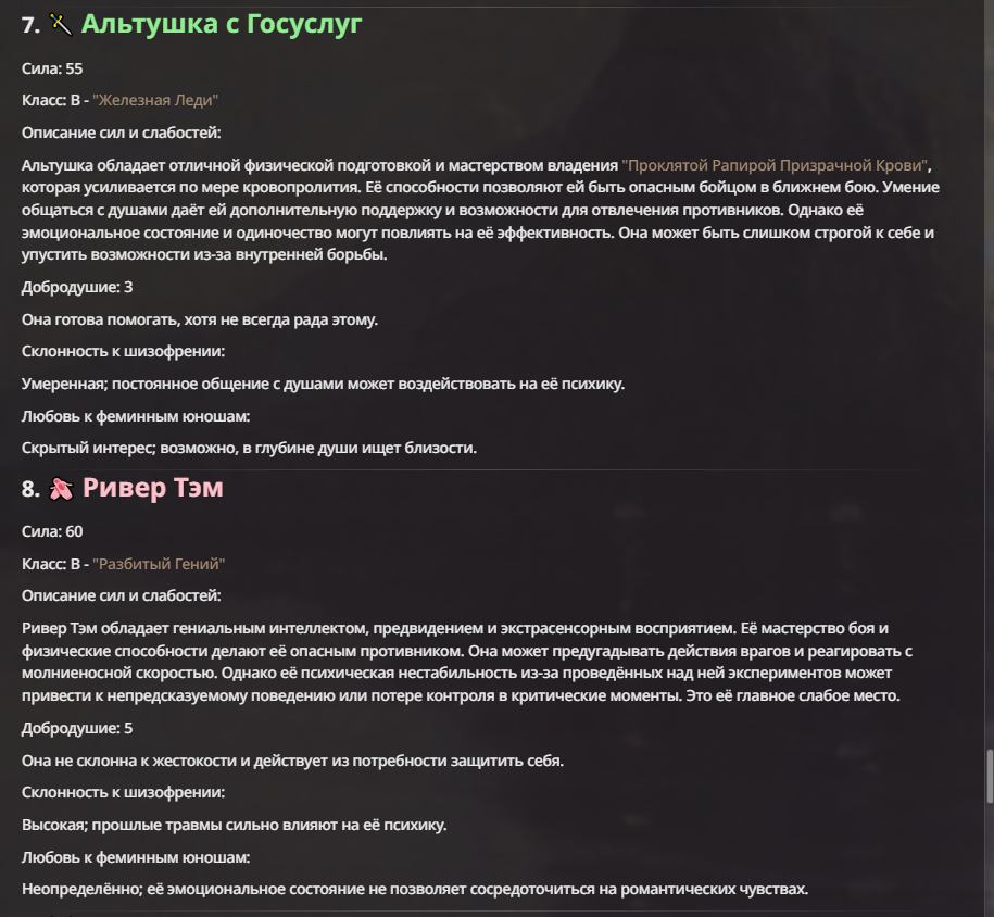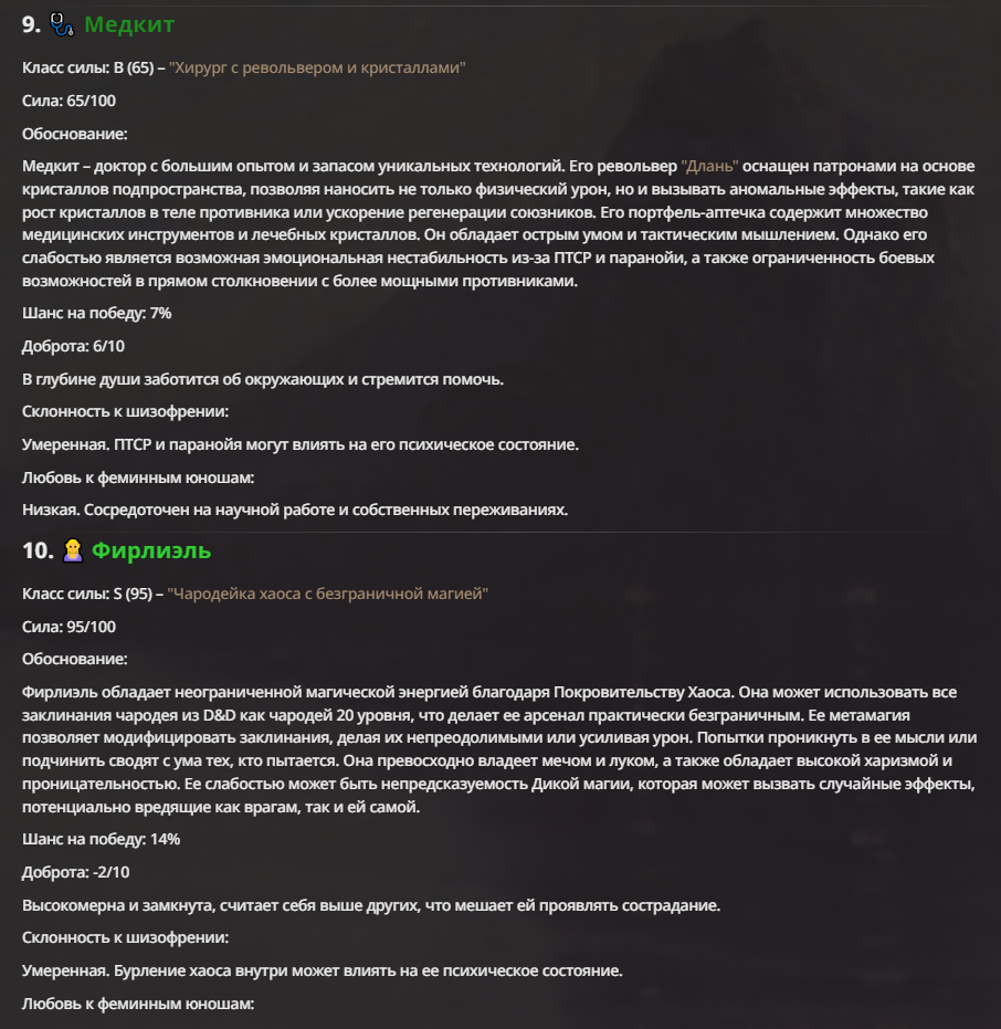 Мне не очень нравится, когда у персонажа пачкой прописаны иммуны. Тогда нейронка не особо понимает что с этим делать, и тогда чар либо отлетает каким-то смешным образом, либо просто ебет всех без вариантов.