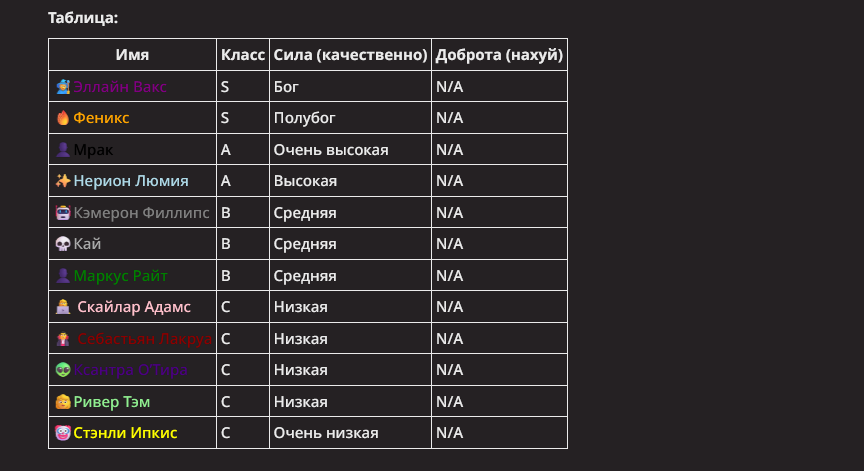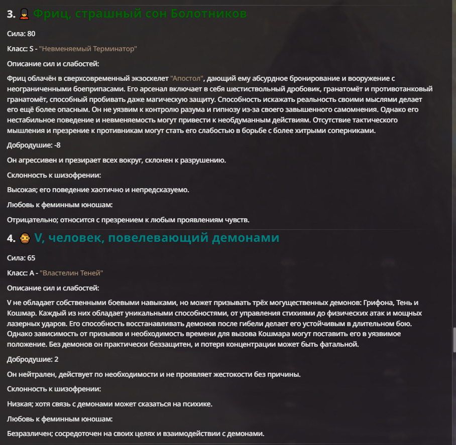 А, еще забыл Фрица. Он мощный, но точно не Бог, т.к. у него напрямую прописаны его слабости и он стабильно откисает. Сделан тупо чтобы выдавать МЕМЫ своей ебнутой в край матершиной. Порой даже удается. Но так как у него прописано завышенное ЧСВ и ебанутость, то победить ему не суждено.