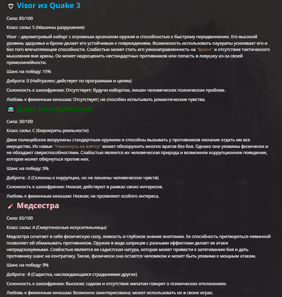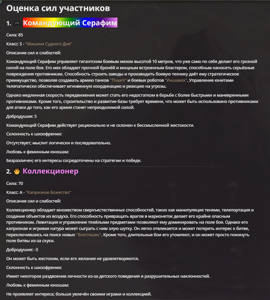 АИ АРЕНА |АИ БИТВЫ Игровой тред №9. В этих битвах может участвовать любой персонаж из любой вселенной, даже нашей(и даже из вашей головы)! Вам только нужно предложить их. Так же можете предложить место проведения боя которое выберется случайным образом.