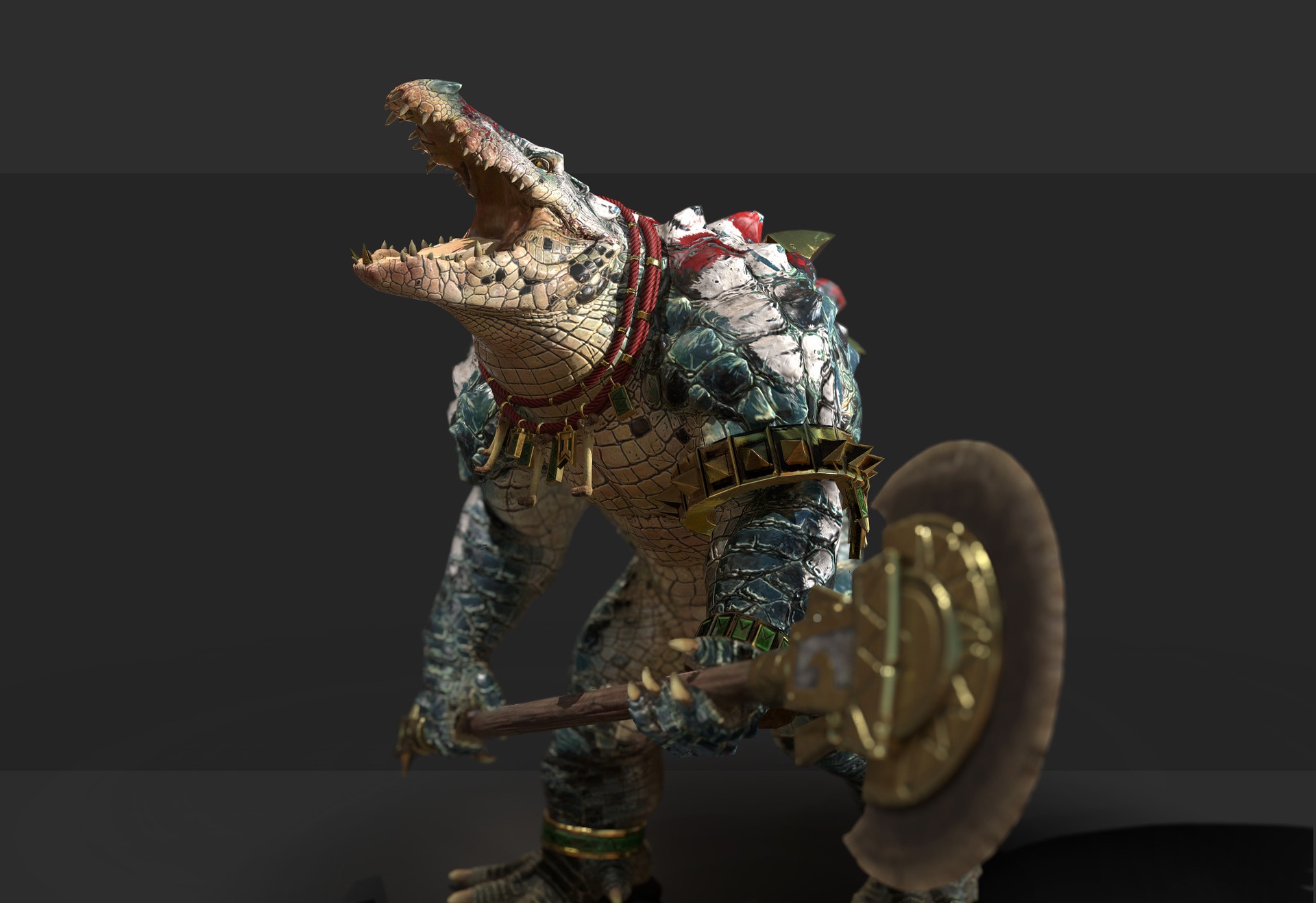 Кроксигор "Гена" Старый воин, один из немногих выживших в геноциде Цивилизации Ящеров, был захвачен Русами и заключён в зоопарк, из которого смог сбежать спустя много лет. Огромный 5 метровый крокодил-гуманоид. Шкура его прочна как сталь, морда страшна и зубаста, но под этими видом душа его полна добра и справедливости, и иногда первобытной ярости тоже... Из-за размера довольно неуклюж и часто всё ломает. Говорит только по-крокодильи, то-есть издаёт страшные звуки, тем не менее разумен и смышлён. Любит цитрусы и никогда не откажется их съесть. Орудует древней огромной лопатой с острыми краями. Любит милых девочек и мальчиков (НЕТ НЕ ЕСТЬ!!!). Может проводить атаки: "Укус" - мощный крокодилий укус может сломать кости, наносит много урона. "Удар с разворота" - бьёт вокруг себя своей лопатой, увернуться можно только прыжком или приседанием. "Вертикальный удар" - Бьёт своей лопатой сверху вниз, наносит огромный урон и может разрубить врага. Способности: "Блок" - встаёт в защитную позу и принимает удар на себя, благодаря прочной шкуре и горе мышц урона получает совсем чуть-чуть. "Плавание" - Умеет хорошо и быстро плавать, на своей могучей спине может перевозить небольшой груз и друзей поменьше. "Засада" - Занимает удобную позицию и становится неподвижен как статуя. Используя "Укус" моментально захватывает врагов меньше себя и держит в пасти. "Инстинкты"- Гена имеет инстинкты хищника что позволяют ему легко находить прячущихся и маскирующихся противников и самому передвигаться в дикой местности незамеченным, но если его сильно ранят из-за инстинктов он может впасть в буйство на время, атакуя всех вокруг. "Подводный монстр" - может погрузиться под воду, где всё прекрасно видит и чувствует. "Трапеза" (только после нахождения трупа/куска мяса) - Съедает и начинает очень медленно исцелятся. "Сочный плод" (только после нахождения цитрусового плода) - Съедает фрукт и быстро исцеляется. Ловкостью не наделён. Гена добрый кросигор и как правило спокоен и покладист, но если видит как кто-то обижает слабых и невинных впадает в ярость и гнев, желая разорвать негодяя.