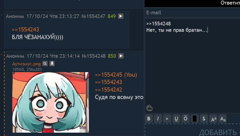 >>1553465 ТОЛЯН также известный как Linkin Simpson Ютубер и профессиональный хиккан. Живет за шкафом. Любит играть в компьютерные игры. Физически слаб и не имеет выдающегося интеллекта. Снимает обзоры на еду. Может материализовать случайную еду, попробовать и оценить от 1 до 10 баллов. Чем выше оценка тем сильней воздействие. Разная еда способна давать разные бонусы. Вплоть до божественной силы, если это 10 баллов. В случае опасности может прятаться за шкаф, где его невозможно отыскать. В прямом эфире снимает происходящие события и выкладывает их на Ютуб. Его речь изобилует словами-паразитами, самое частое из которых это "Вот", которое он повторяет после каждого предложения. Его мечта это получить себе тяночку. Желательно известную певицу или актрису.