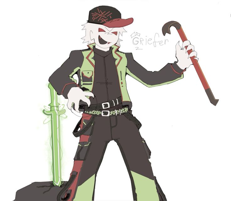 "Одежда, оружие и его способности" Одежда Грифера хоть и кажется максимально обычной, из-за сил меча обеспечивает прекрасную защиту от ударов, порезов, и атак связанных с ядом. Одет же он в зелёно-неоновую кожаную куртку, чёрно-красную кепку, и джинсы с кедами такого же цвета. Так же можно отметить имеющиеся у него длинны и достаточно острые клыки.