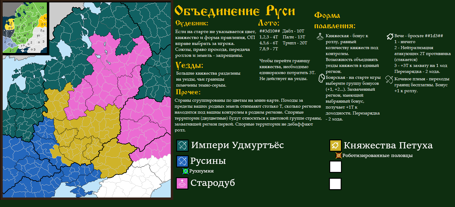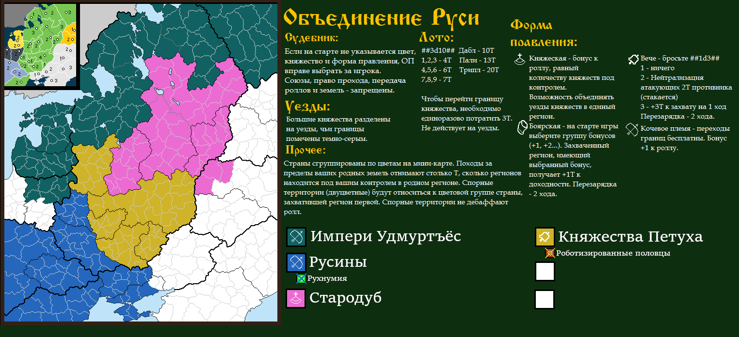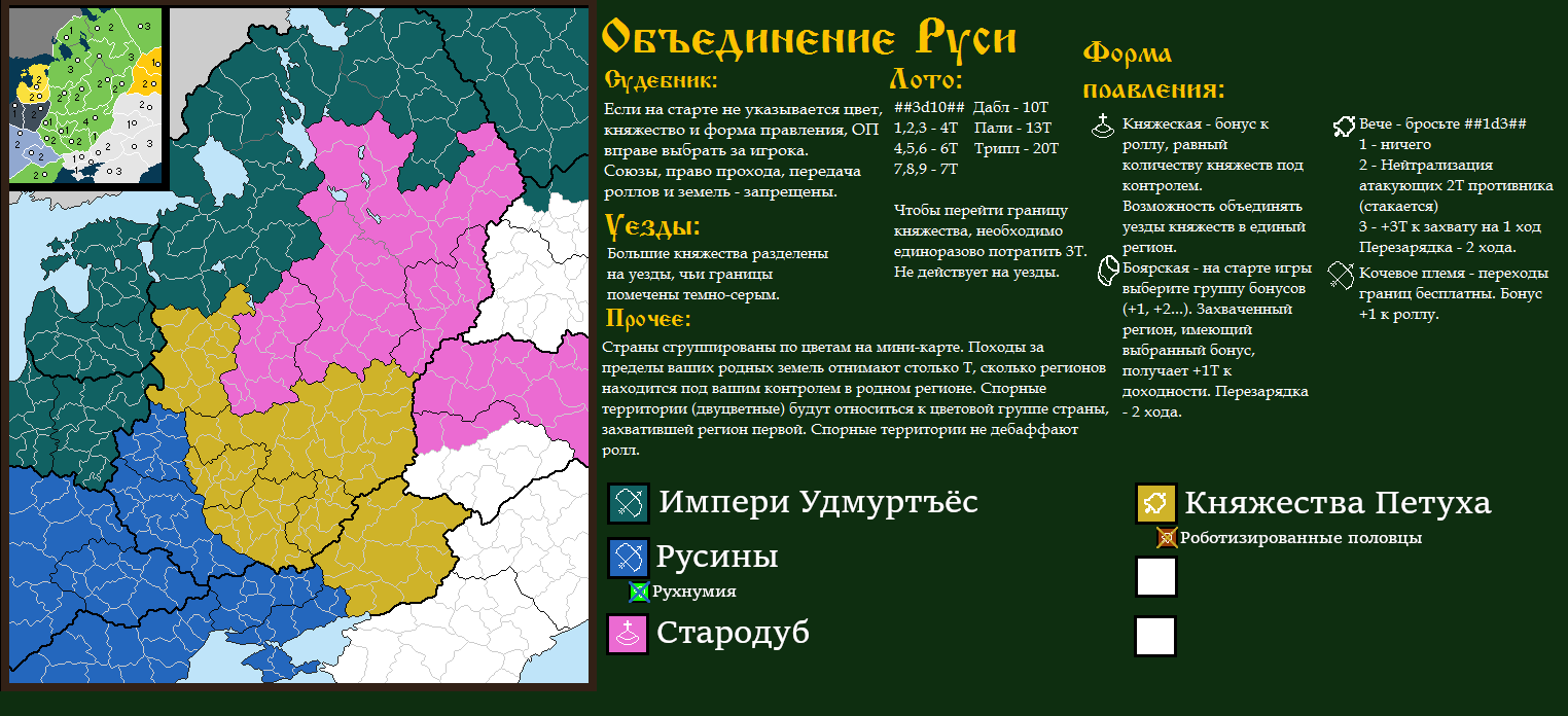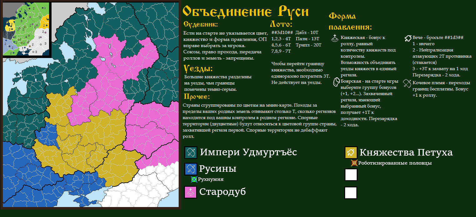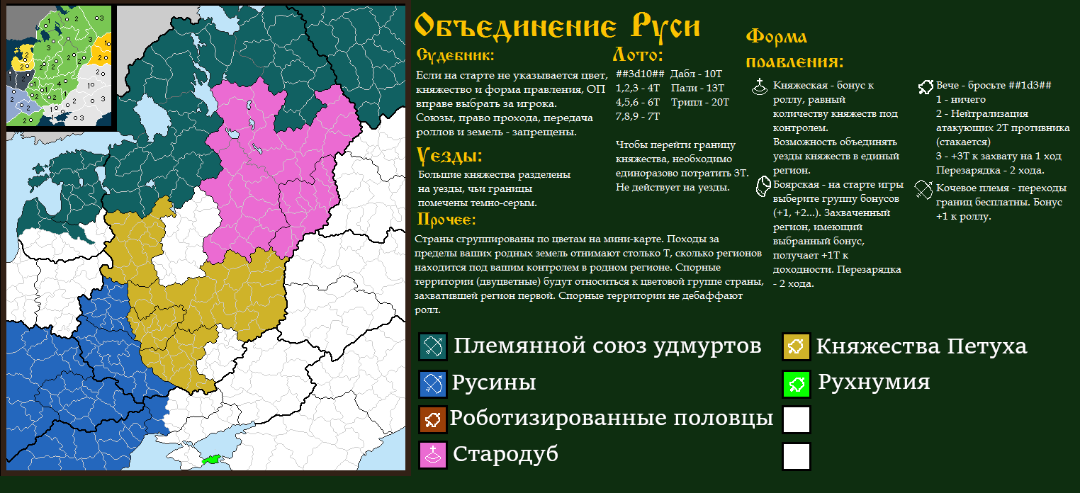 Прочие бонусы: Русины: -2Т к походам. Племенной союз удмуртов: -2Т к походам. Стародуб: -3Т к походам. +3 от княжества, +9 от территорий Княжества Петуха: -5Т к походам.