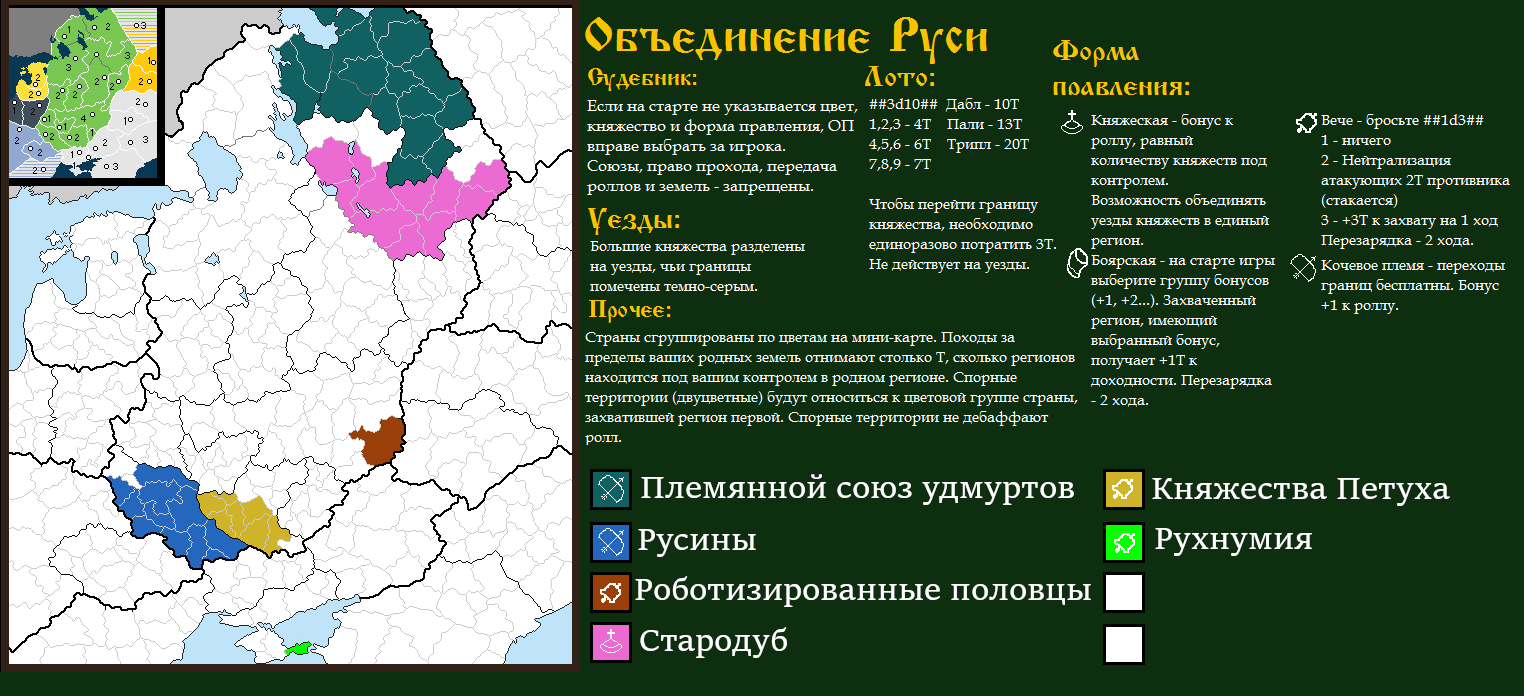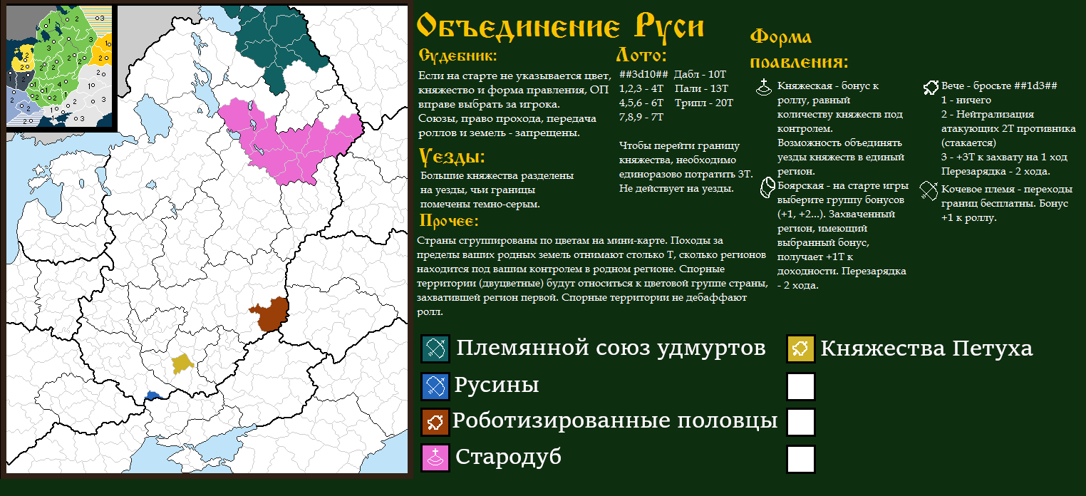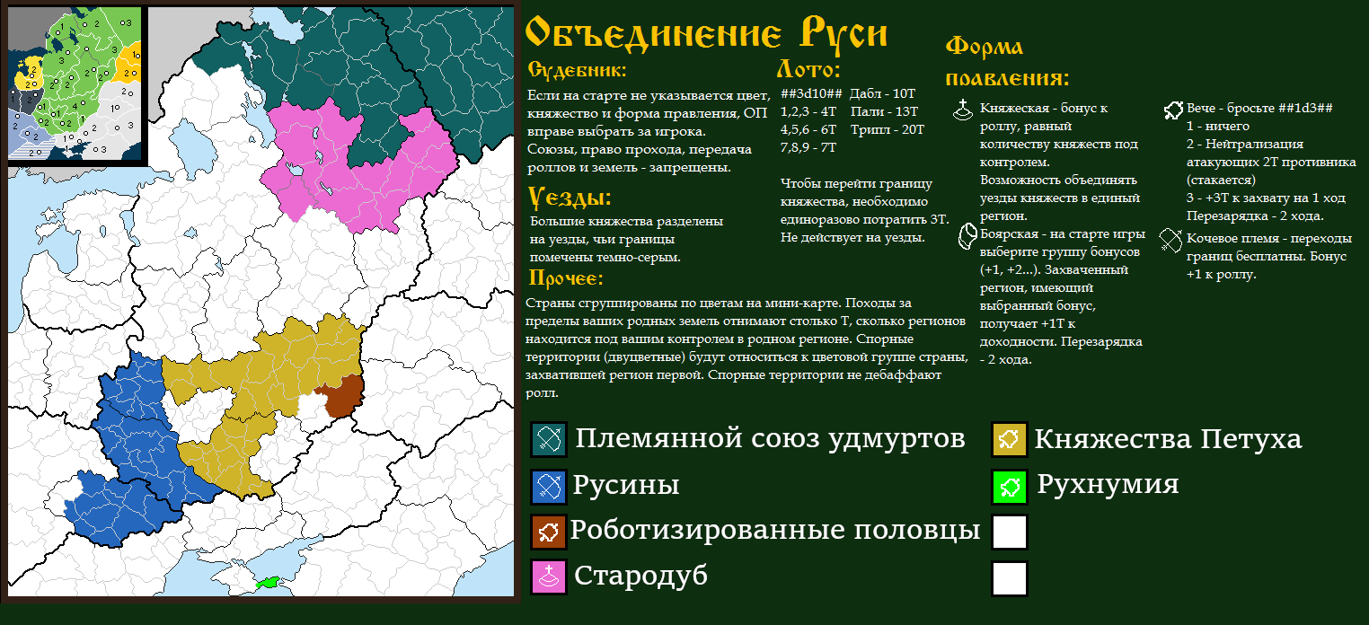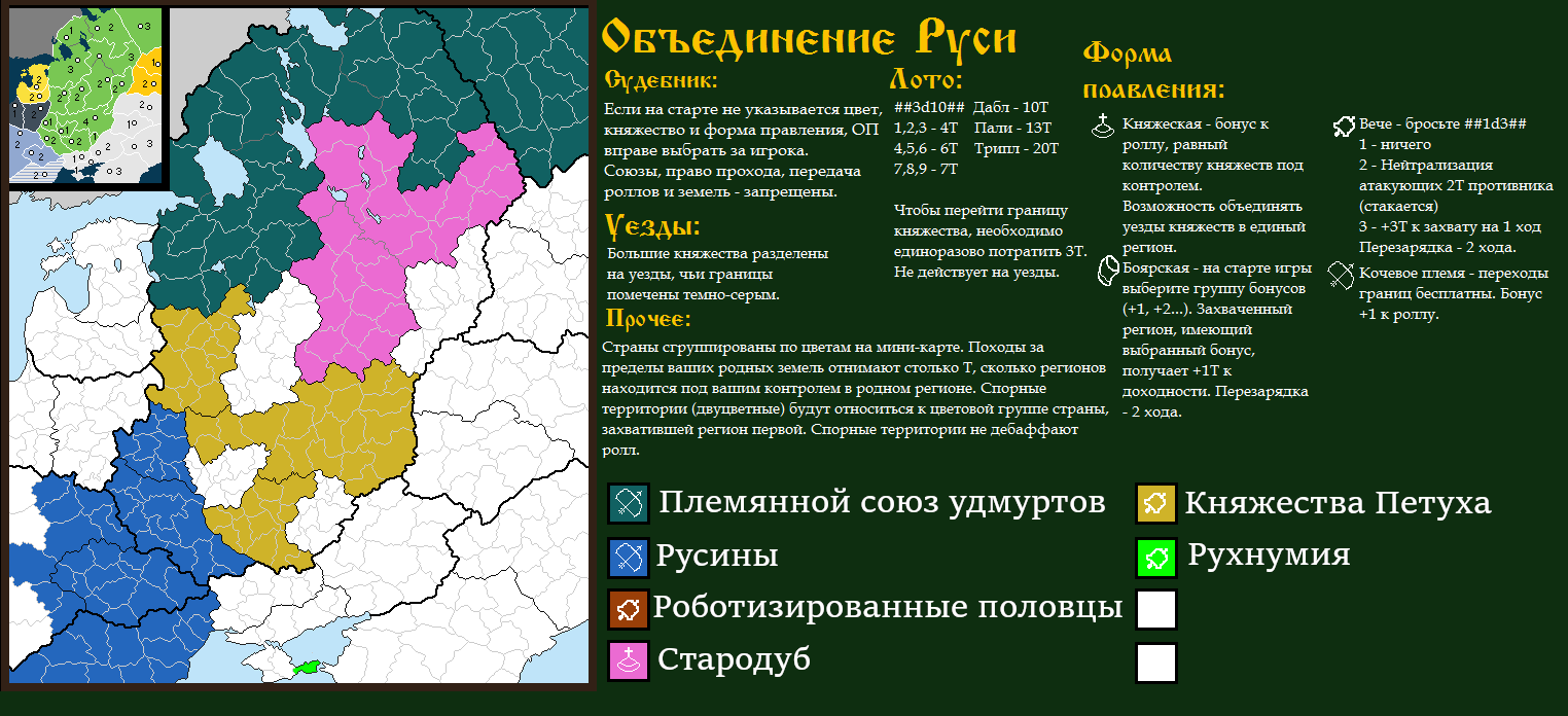 Прочие бонусы: Русины: -2Т к походам. Племенной союз удмуртов: -2Т к походам. Стародуб: -3Т к походам. +3 от княжества, +9 от территорий Княжества Петуха: -5Т к походам.