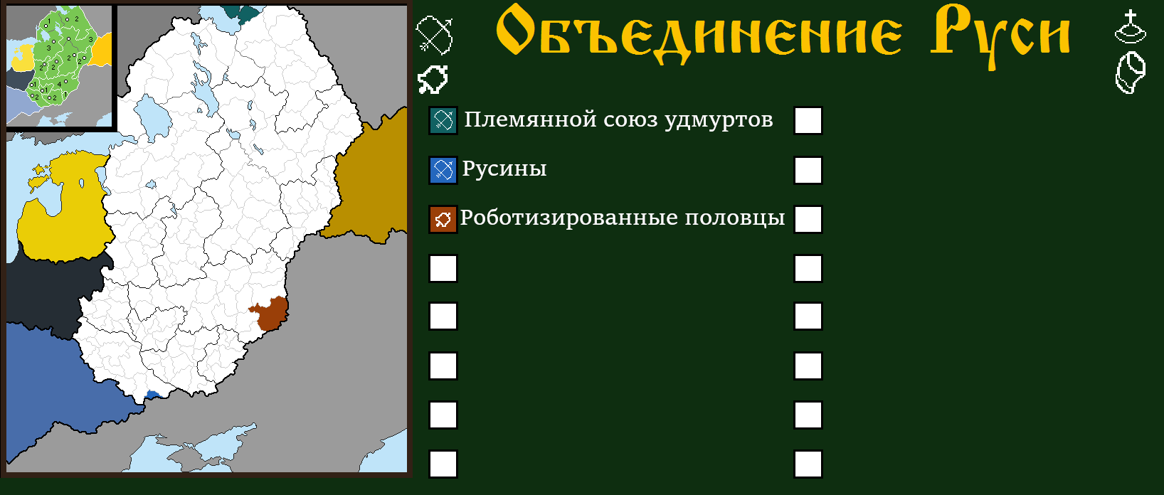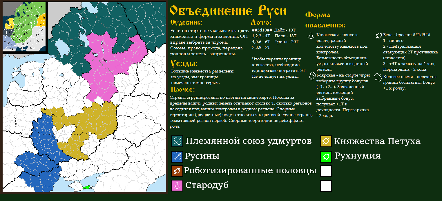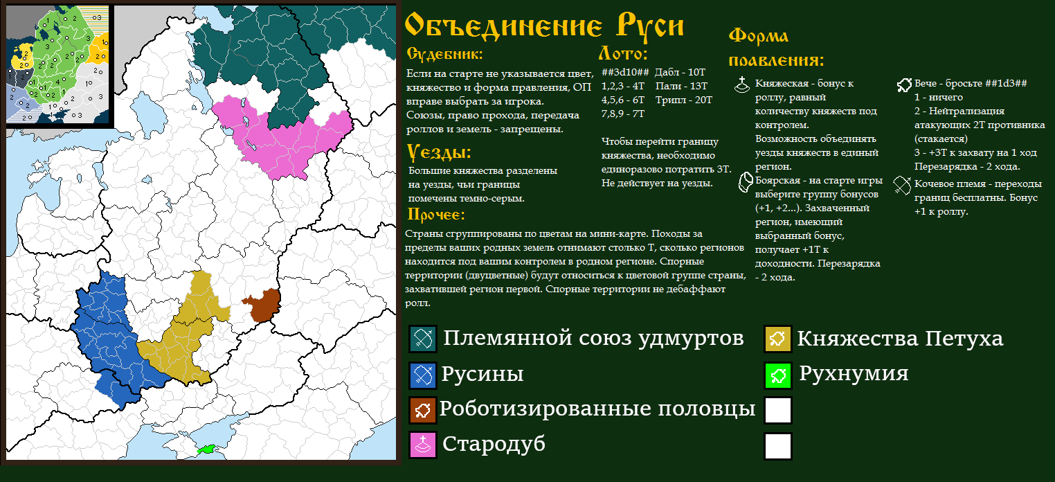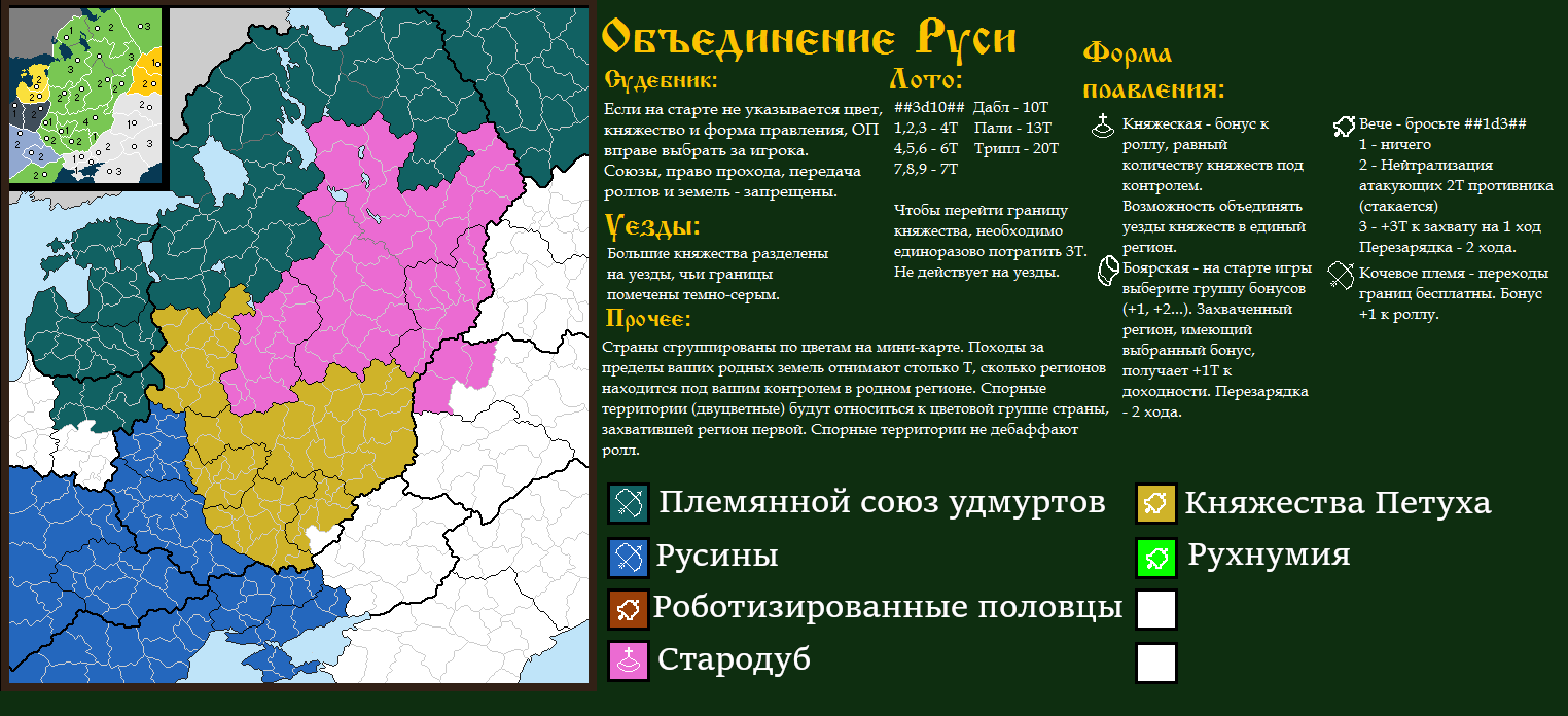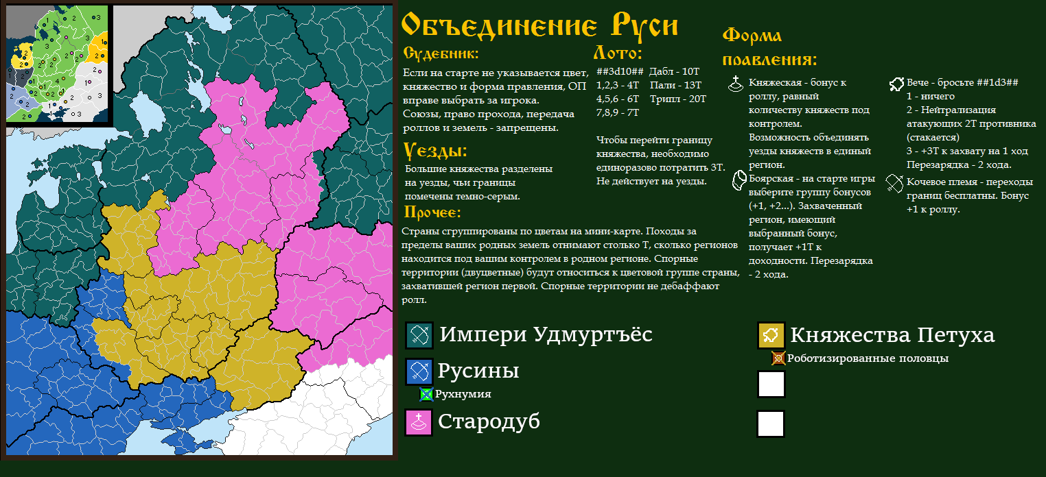 Прочие бонусы: Русины: -2Т к походам. Племенной союз удмуртов: -2Т к походам. Стародуб: -3Т к походам. +3 от княжества, +9 от территорий Княжества Петуха: -5Т к походам.