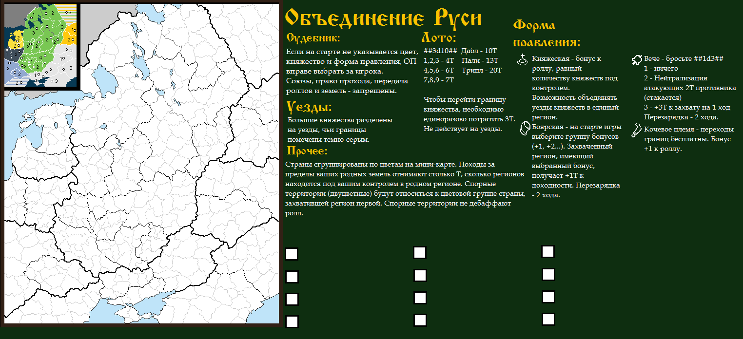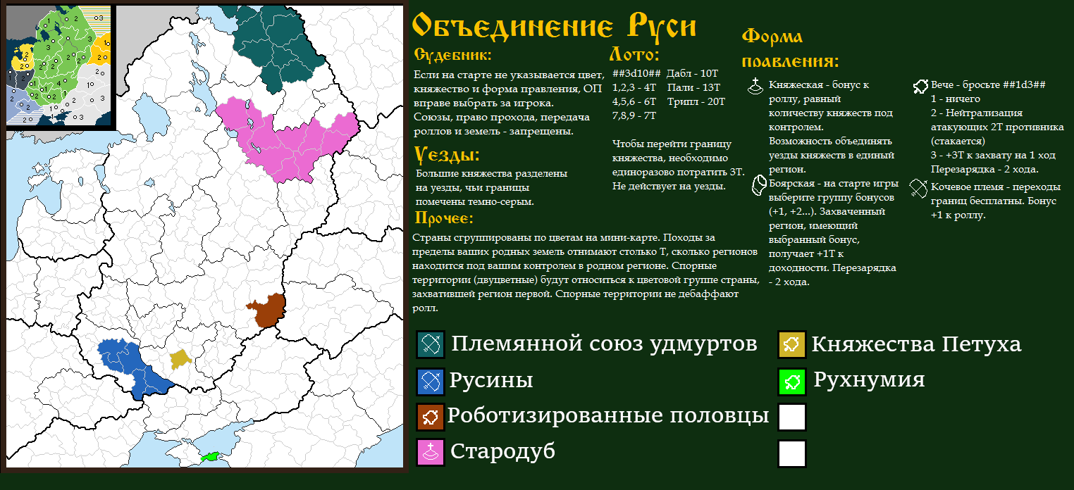 >А хрен его знает, уже не помню когда в русь играли до этого Года три назад. Кстати, Красноармеец приходил в треды по новым мирам разъяснить правила, может и Рахнера сюда заглянет, а то пропала куда-то.