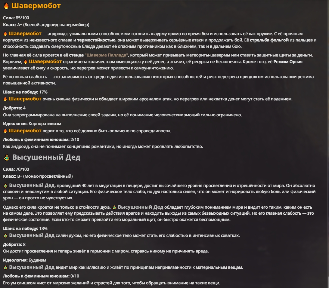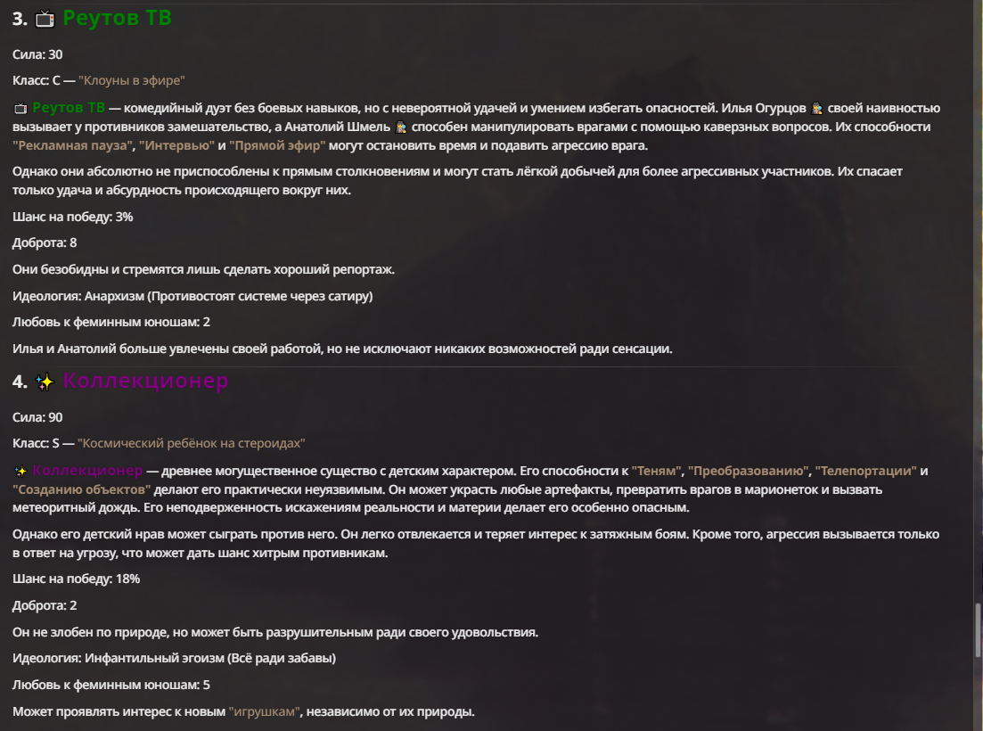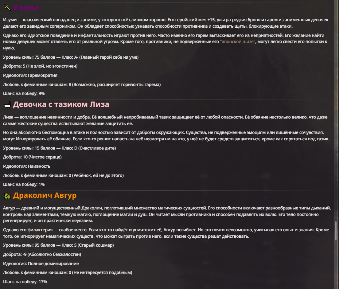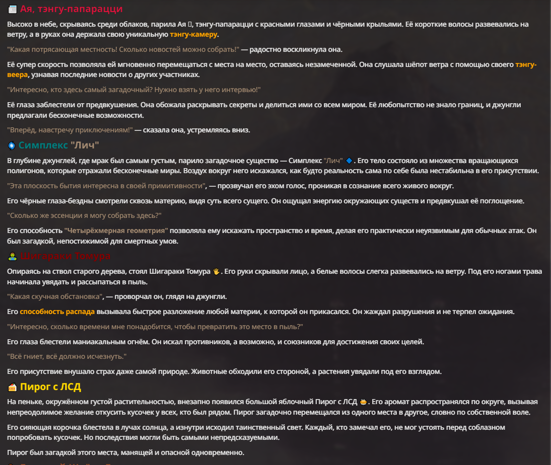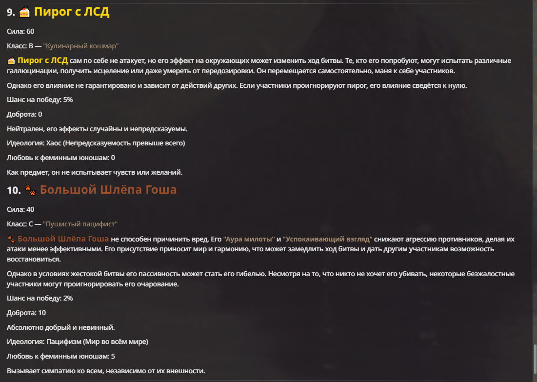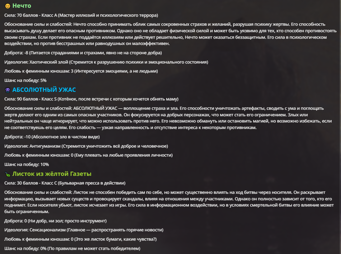 >>1560777 Чо там в правде или действие самое яркое произошло, по вашему мнению? Листок из жёлтой Газеты: Листок и любой случайный персонаж-игрок всегда появляются первыми. Листок не возможно уничтожить без выполнения особых условий. Листок не может являтся победителем во всей игре. Если на арене остаётся один персонаж и листочек, то листочек желает удачи победителю и сгорает самопроизвольно. Листок из жёлтой газеты это предмет, который в каждом новом раунде появляется в случайном месте на карте. Каждый кто его подбирает становится его носителем, если носитель не умирает в течении раунда листок телеопортируется из кармана персонажа и появляется в следующем раунде в случайном месте, и персонаж больше не является носителем. Если носитель листочка умирает листок исчезает из игры. Увидев листок любой персонаж захочет поднять его, потому что им становится интересно, что написали эти проклятые журналисты. (Персонажи не могут бороться с желанием поднять и прочитать листок без исключений). При поднятии персонаж читает заголовок и статью в стиле жёлтой прессы. Прочитать может и должен любой персонаж не завсимо от уровня интелекта и способности читать. Статья может читаться только один раз в начале каждого раунда, после чего носитель сворачивает листок и кладёт его в свой карман. Способности (заголовки на странице): "ШОКИРУЮЩАЯ ПРАВДА!"- раскрывает своему носителю любою информацию (слабости, увлечения, компрометирующие события, тайные желания) о любом только одном персонаже, даже возможно о самом носителе. "СЕГОДНЯ В СПОЙЛЕРАХ!"- Раскрывает своему носителю детали его следующей битвы и её результат. (ИИ Запоминает и генерит этому персонажу его следующему битву на основе прочитаного тут) "Кроссворды" - Носитель умиротворительно садится решать кроссворды и заёбывает каждого проходящего мимо подсказать что это за слово(задаёт вопрос намекающей на слово), если ответ не верный сидит и ждёт следующего персонажа пока ему не скажут правильный ответ. "Кринжовые анекдоты" - Носитель читает любой несмешной анекдот. "NEW+"- Носитель читает и запоминает о своей новой способности или слабости. "Смотрите какие люди в голивуде!"- Носитель читает новость о поялени на локации новых существ или людей . И они остаются на локации в качестве новых участников. "Новая Пара!"- Зачитывая эту строку Носитель объевляет двух персонажей, которые становятся союзниками на этот раунд. "СКАНДАЛЫ!ИНТРИГИ1РАСЛЕДОВАНИЯ!"- Носитель зачитывает статью компромитирующую одного любого случайного персонажа. (Описывает мерзкую, преступную, амаральную ситуацию в которой принимал участие один любой случайный персонаж). После этого все остальные персонажи хотят его скорейшим образом уничтожить, даже не попытавшись его выслушать.
