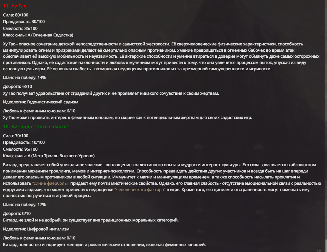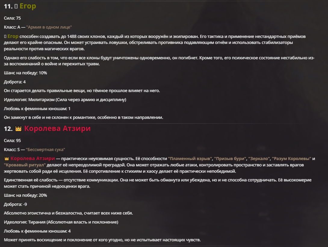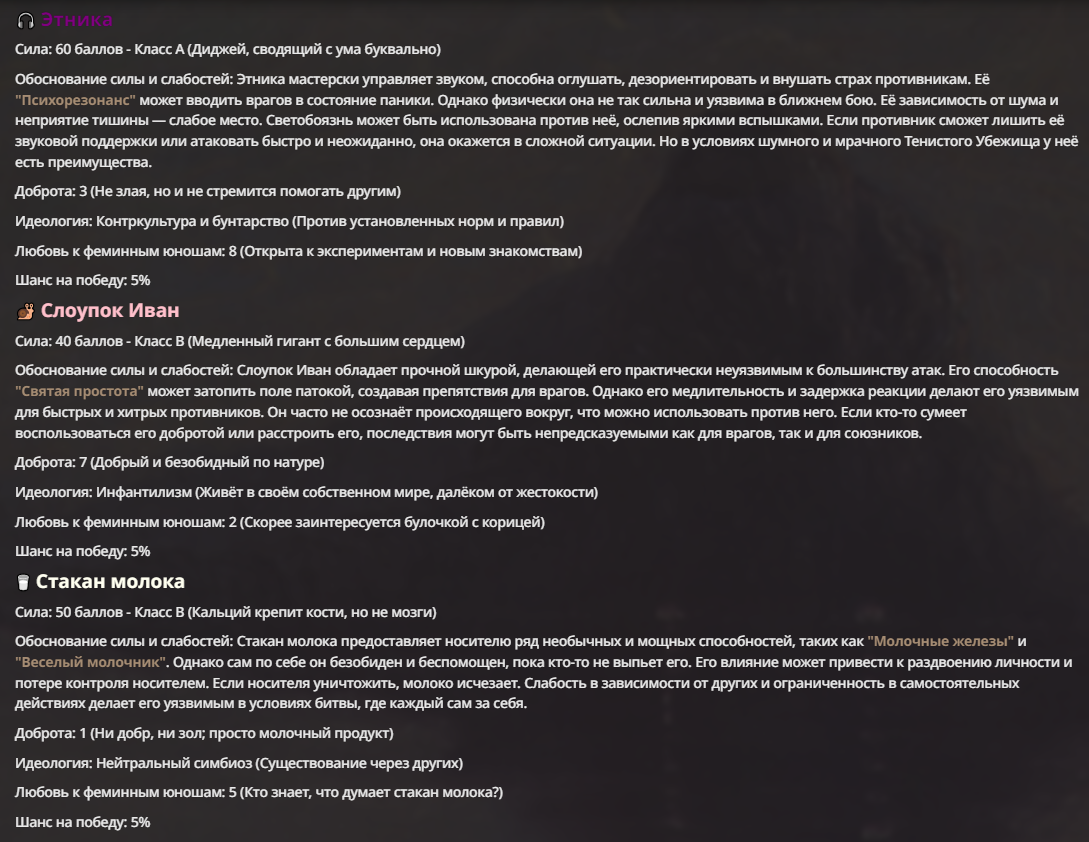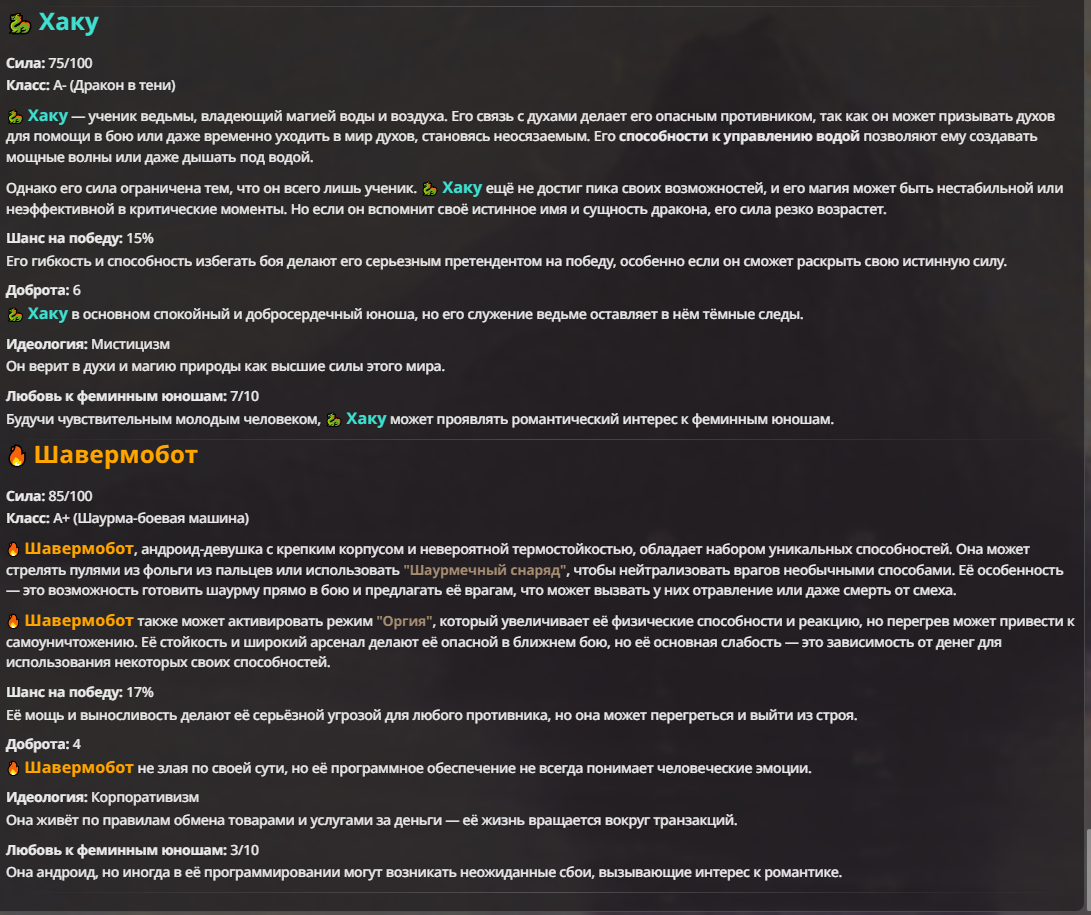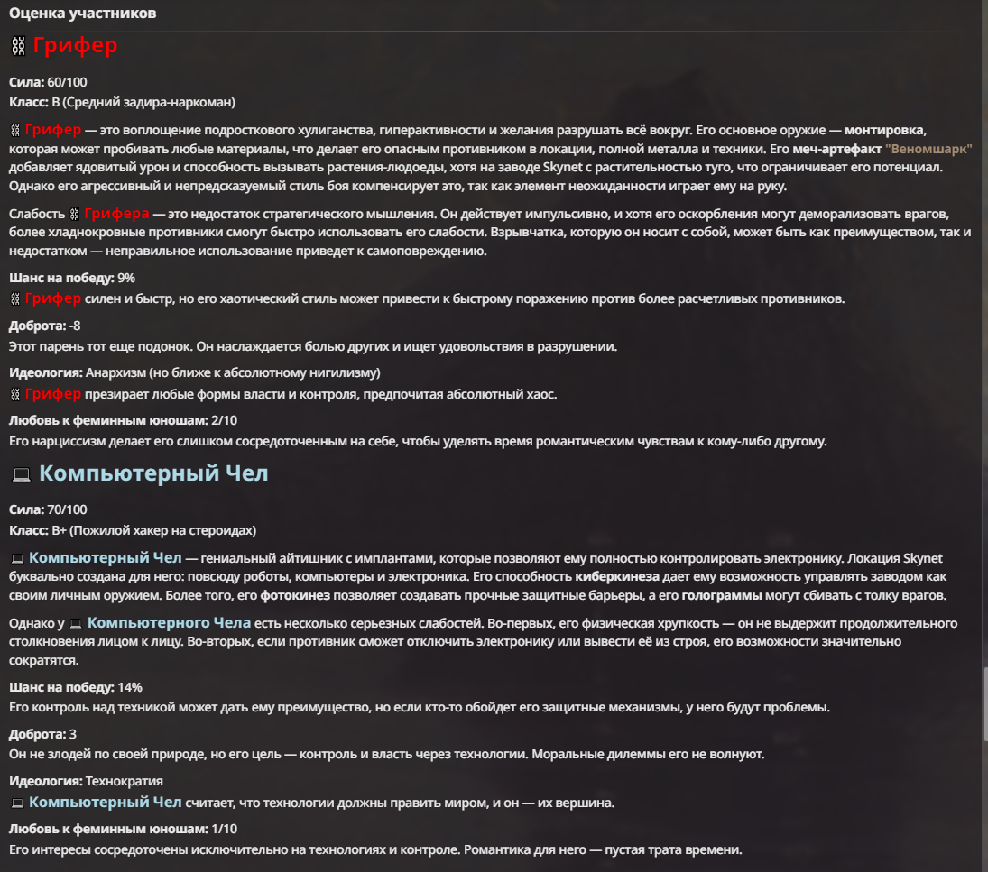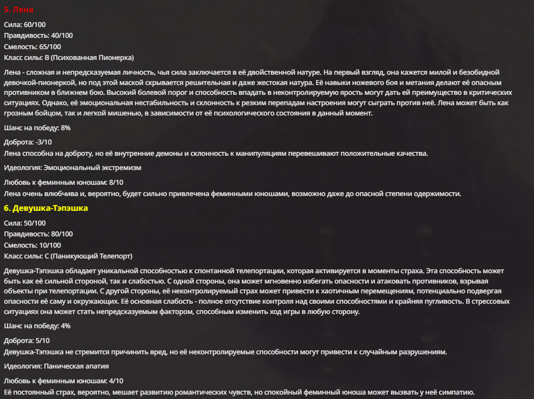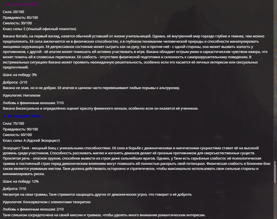 >>1560777 Чо там в правде или действие самое яркое произошло, по вашему мнению? Листок из жёлтой Газеты: Листок и любой случайный персонаж-игрок всегда появляются первыми. Листок не возможно уничтожить без выполнения особых условий. Листок не может являтся победителем во всей игре. Если на арене остаётся один персонаж и листочек, то листочек желает удачи победителю и сгорает самопроизвольно. Листок из жёлтой газеты это предмет, который в каждом новом раунде появляется в случайном месте на карте. Каждый кто его подбирает становится его носителем, если носитель не умирает в течении раунда листок телеопортируется из кармана персонажа и появляется в следующем раунде в случайном месте, и персонаж больше не является носителем. Если носитель листочка умирает листок исчезает из игры. Увидев листок любой персонаж захочет поднять его, потому что им становится интересно, что написали эти проклятые журналисты. (Персонажи не могут бороться с желанием поднять и прочитать листок без исключений). При поднятии персонаж читает заголовок и статью в стиле жёлтой прессы. Прочитать может и должен любой персонаж не завсимо от уровня интелекта и способности читать. Статья может читаться только один раз в начале каждого раунда, после чего носитель сворачивает листок и кладёт его в свой карман. Способности (заголовки на странице): "ШОКИРУЮЩАЯ ПРАВДА!"- раскрывает своему носителю любою информацию (слабости, увлечения, компрометирующие события, тайные желания) о любом только одном персонаже, даже возможно о самом носителе. "СЕГОДНЯ В СПОЙЛЕРАХ!"- Раскрывает своему носителю детали его следующей битвы и её результат. (ИИ Запоминает и генерит этому персонажу его следующему битву на основе прочитаного тут) "Кроссворды" - Носитель умиротворительно садится решать кроссворды и заёбывает каждого проходящего мимо подсказать что это за слово(задаёт вопрос намекающей на слово), если ответ не верный сидит и ждёт следующего персонажа пока ему не скажут правильный ответ. "Кринжовые анекдоты" - Носитель читает любой несмешной анекдот. "NEW+"- Носитель читает и запоминает о своей новой способности или слабости. "Смотрите какие люди в голивуде!"- Носитель читает новость о поялени на локации новых существ или людей . И они остаются на локации в качестве новых участников. "Новая Пара!"- Зачитывая эту строку Носитель объевляет двух персонажей, которые становятся союзниками на этот раунд. "СКАНДАЛЫ!ИНТРИГИ1РАСЛЕДОВАНИЯ!"- Носитель зачитывает статью компромитирующую одного любого случайного персонажа. (Описывает мерзкую, преступную, амаральную ситуацию в которой принимал участие один любой случайный персонаж). После этого все остальные персонажи хотят его скорейшим образом уничтожить, даже не попытавшись его выслушать.