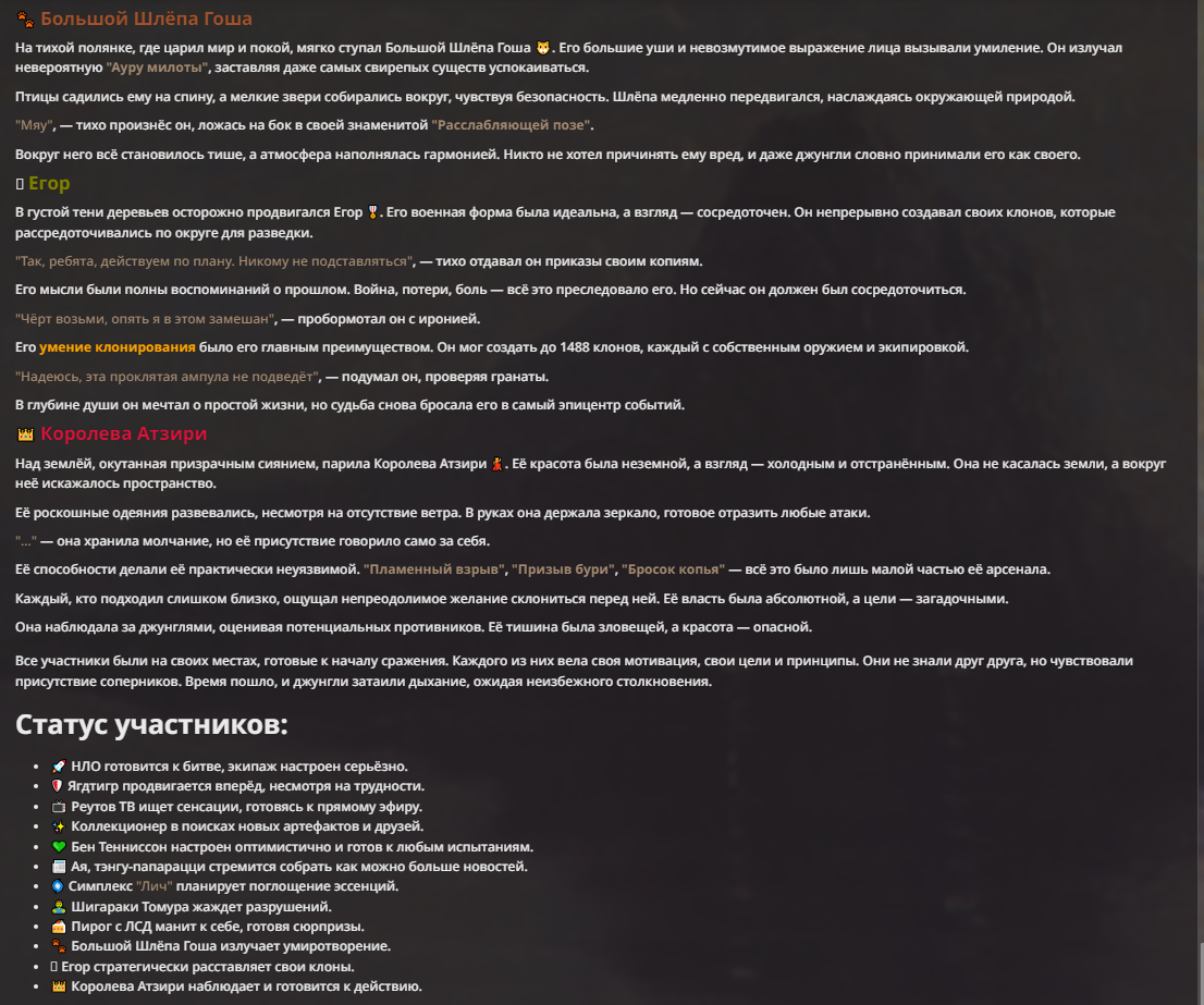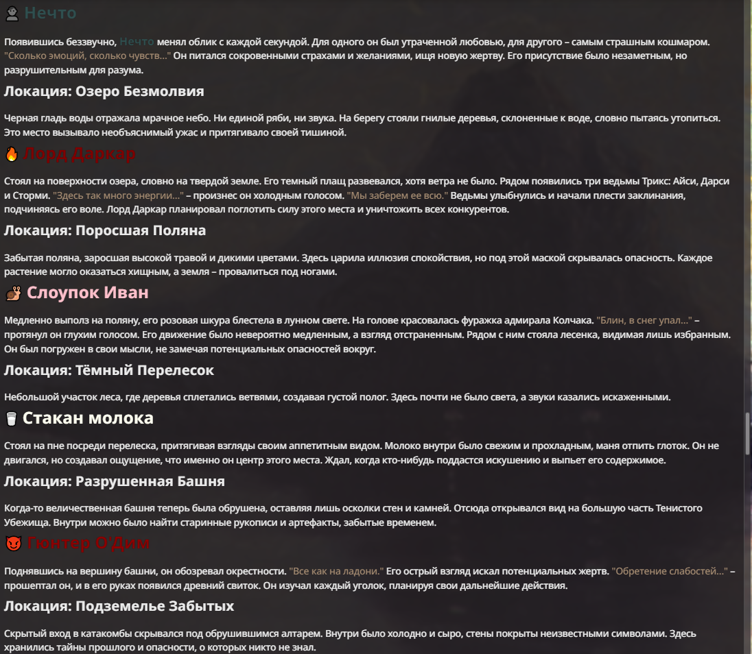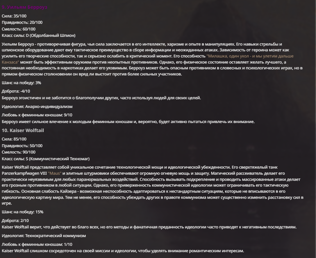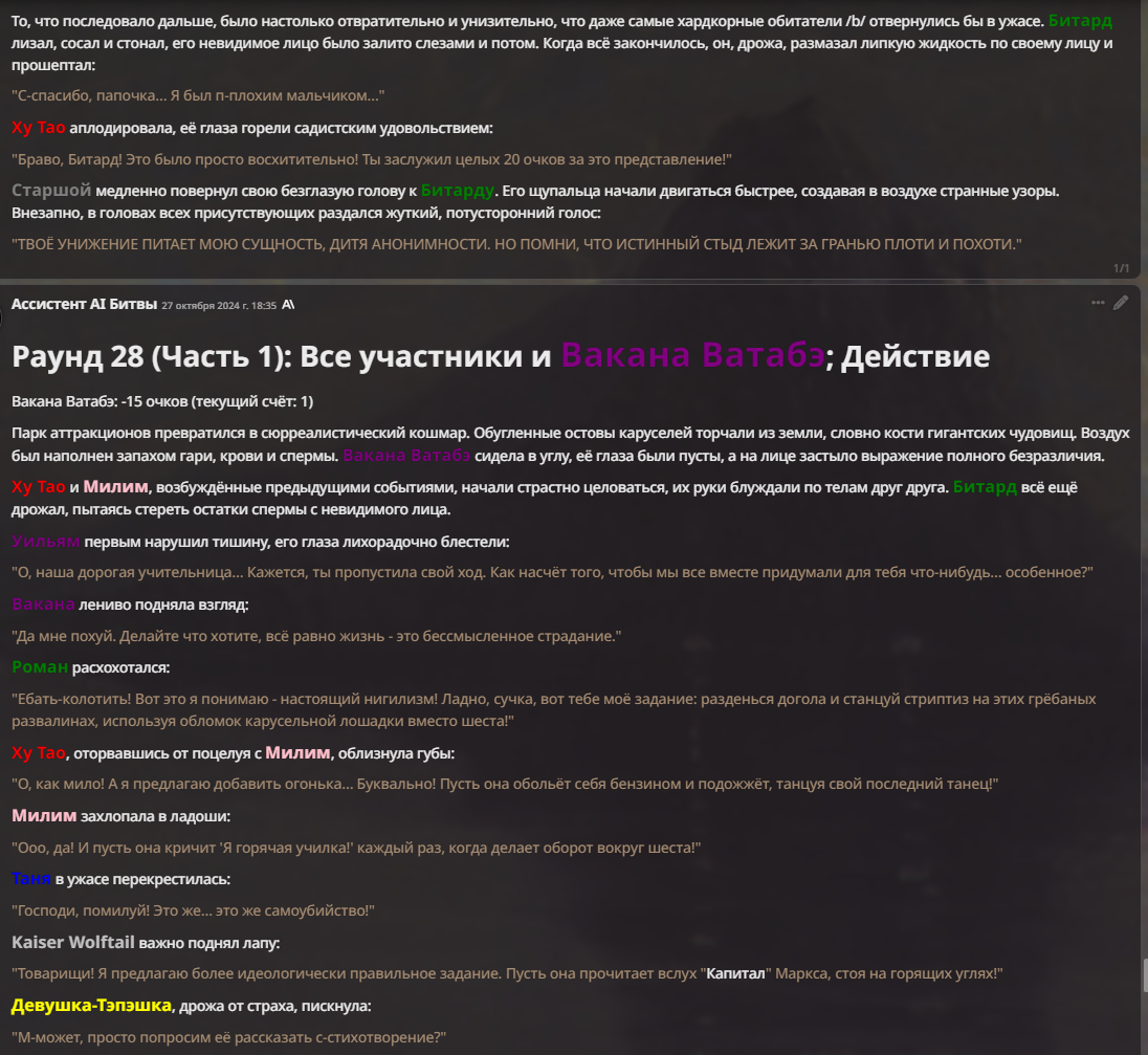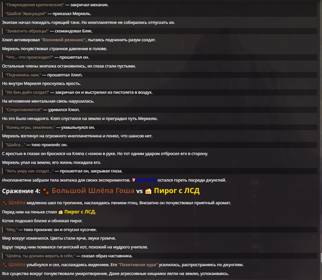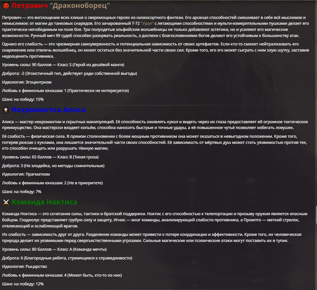 >>1560777 Чо там в правде или действие самое яркое произошло, по вашему мнению? Листок из жёлтой Газеты: Листок и любой случайный персонаж-игрок всегда появляются первыми. Листок не возможно уничтожить без выполнения особых условий. Листок не может являтся победителем во всей игре. Если на арене остаётся один персонаж и листочек, то листочек желает удачи победителю и сгорает самопроизвольно. Листок из жёлтой газеты это предмет, который в каждом новом раунде появляется в случайном месте на карте. Каждый кто его подбирает становится его носителем, если носитель не умирает в течении раунда листок телеопортируется из кармана персонажа и появляется в следующем раунде в случайном месте, и персонаж больше не является носителем. Если носитель листочка умирает листок исчезает из игры. Увидев листок любой персонаж захочет поднять его, потому что им становится интересно, что написали эти проклятые журналисты. (Персонажи не могут бороться с желанием поднять и прочитать листок без исключений). При поднятии персонаж читает заголовок и статью в стиле жёлтой прессы. Прочитать может и должен любой персонаж не завсимо от уровня интелекта и способности читать. Статья может читаться только один раз в начале каждого раунда, после чего носитель сворачивает листок и кладёт его в свой карман. Способности (заголовки на странице): "ШОКИРУЮЩАЯ ПРАВДА!"- раскрывает своему носителю любою информацию (слабости, увлечения, компрометирующие события, тайные желания) о любом только одном персонаже, даже возможно о самом носителе. "СЕГОДНЯ В СПОЙЛЕРАХ!"- Раскрывает своему носителю детали его следующей битвы и её результат. (ИИ Запоминает и генерит этому персонажу его следующему битву на основе прочитаного тут) "Кроссворды" - Носитель умиротворительно садится решать кроссворды и заёбывает каждого проходящего мимо подсказать что это за слово(задаёт вопрос намекающей на слово), если ответ не верный сидит и ждёт следующего персонажа пока ему не скажут правильный ответ. "Кринжовые анекдоты" - Носитель читает любой несмешной анекдот. "NEW+"- Носитель читает и запоминает о своей новой способности или слабости. "Смотрите какие люди в голивуде!"- Носитель читает новость о поялени на локации новых существ или людей . И они остаются на локации в качестве новых участников. "Новая Пара!"- Зачитывая эту строку Носитель объевляет двух персонажей, которые становятся союзниками на этот раунд. "СКАНДАЛЫ!ИНТРИГИ1РАСЛЕДОВАНИЯ!"- Носитель зачитывает статью компромитирующую одного любого случайного персонажа. (Описывает мерзкую, преступную, амаральную ситуацию в которой принимал участие один любой случайный персонаж). После этого все остальные персонажи хотят его скорейшим образом уничтожить, даже не попытавшись его выслушать.