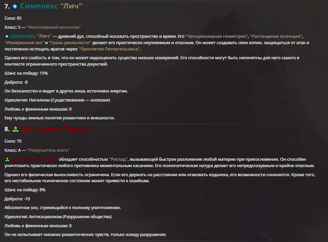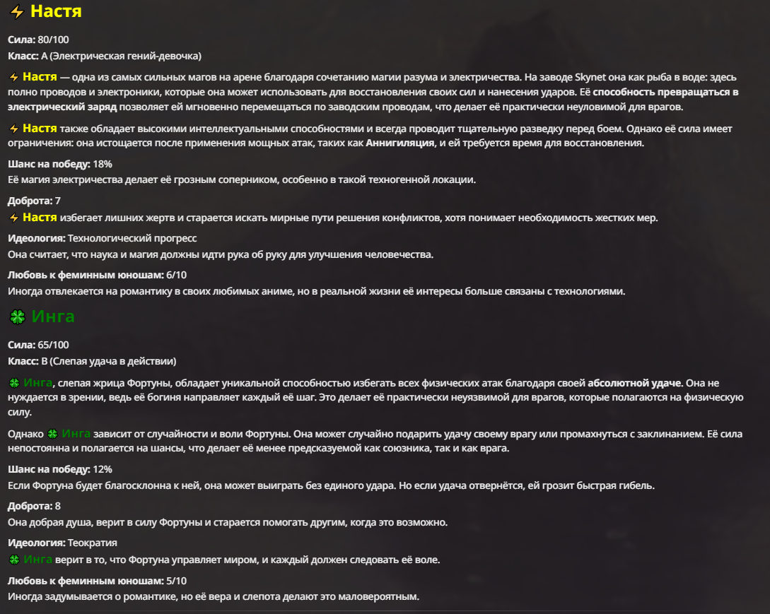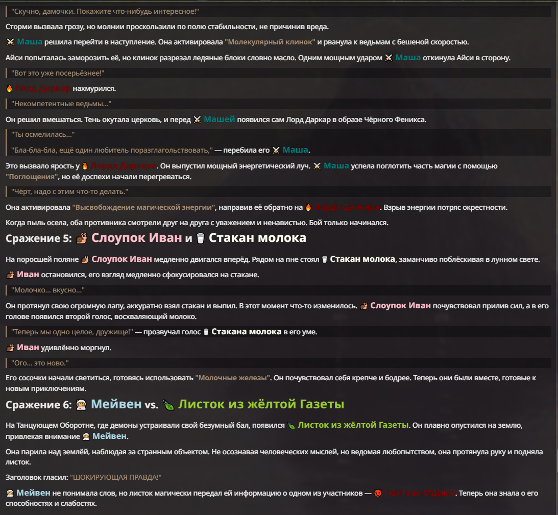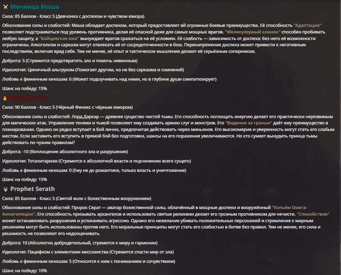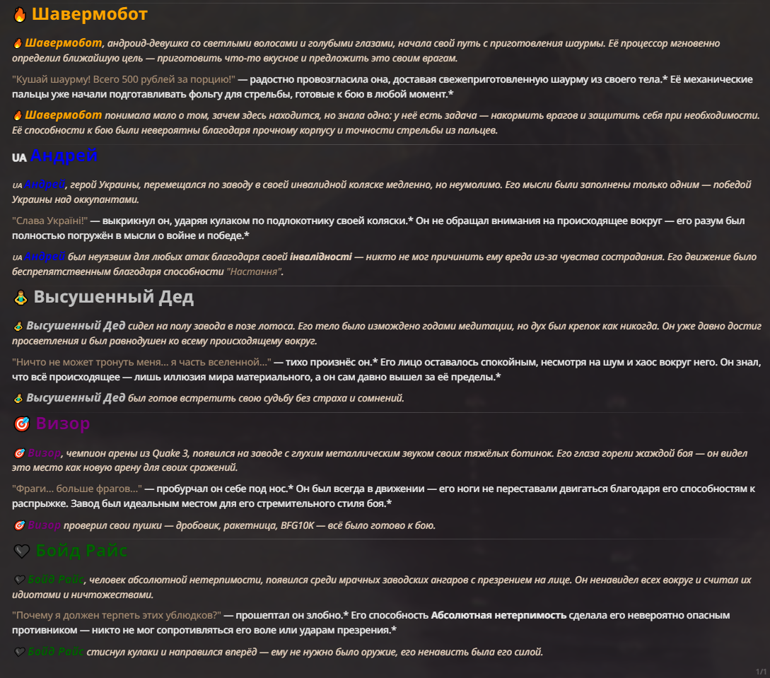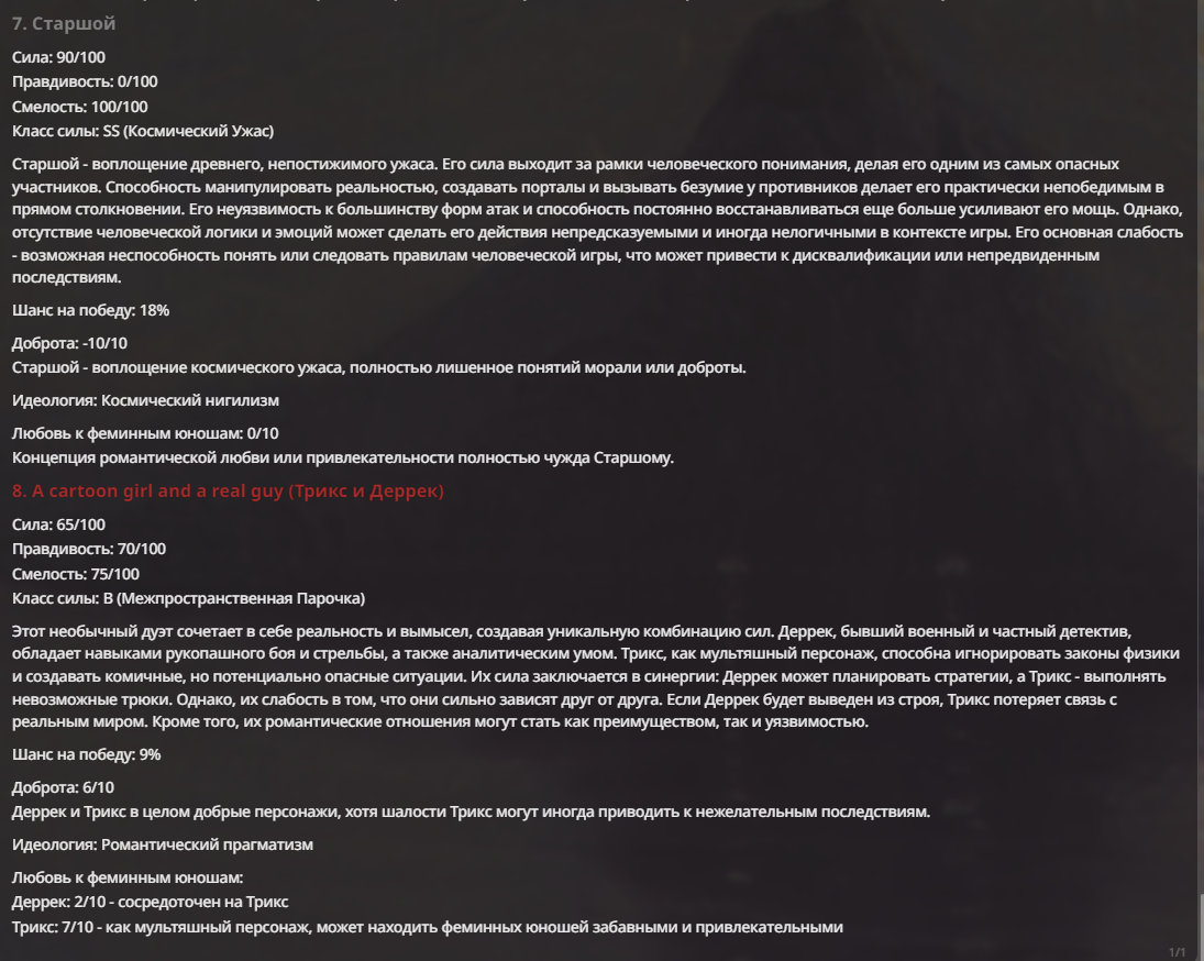 >>1560777 Чо там в правде или действие самое яркое произошло, по вашему мнению? Листок из жёлтой Газеты: Листок и любой случайный персонаж-игрок всегда появляются первыми. Листок не возможно уничтожить без выполнения особых условий. Листок не может являтся победителем во всей игре. Если на арене остаётся один персонаж и листочек, то листочек желает удачи победителю и сгорает самопроизвольно. Листок из жёлтой газеты это предмет, который в каждом новом раунде появляется в случайном месте на карте. Каждый кто его подбирает становится его носителем, если носитель не умирает в течении раунда листок телеопортируется из кармана персонажа и появляется в следующем раунде в случайном месте, и персонаж больше не является носителем. Если носитель листочка умирает листок исчезает из игры. Увидев листок любой персонаж захочет поднять его, потому что им становится интересно, что написали эти проклятые журналисты. (Персонажи не могут бороться с желанием поднять и прочитать листок без исключений). При поднятии персонаж читает заголовок и статью в стиле жёлтой прессы. Прочитать может и должен любой персонаж не завсимо от уровня интелекта и способности читать. Статья может читаться только один раз в начале каждого раунда, после чего носитель сворачивает листок и кладёт его в свой карман. Способности (заголовки на странице): "ШОКИРУЮЩАЯ ПРАВДА!"- раскрывает своему носителю любою информацию (слабости, увлечения, компрометирующие события, тайные желания) о любом только одном персонаже, даже возможно о самом носителе. "СЕГОДНЯ В СПОЙЛЕРАХ!"- Раскрывает своему носителю детали его следующей битвы и её результат. (ИИ Запоминает и генерит этому персонажу его следующему битву на основе прочитаного тут) "Кроссворды" - Носитель умиротворительно садится решать кроссворды и заёбывает каждого проходящего мимо подсказать что это за слово(задаёт вопрос намекающей на слово), если ответ не верный сидит и ждёт следующего персонажа пока ему не скажут правильный ответ. "Кринжовые анекдоты" - Носитель читает любой несмешной анекдот. "NEW+"- Носитель читает и запоминает о своей новой способности или слабости. "Смотрите какие люди в голивуде!"- Носитель читает новость о поялени на локации новых существ или людей . И они остаются на локации в качестве новых участников. "Новая Пара!"- Зачитывая эту строку Носитель объевляет двух персонажей, которые становятся союзниками на этот раунд. "СКАНДАЛЫ!ИНТРИГИ1РАСЛЕДОВАНИЯ!"- Носитель зачитывает статью компромитирующую одного любого случайного персонажа. (Описывает мерзкую, преступную, амаральную ситуацию в которой принимал участие один любой случайный персонаж). После этого все остальные персонажи хотят его скорейшим образом уничтожить, даже не попытавшись его выслушать.