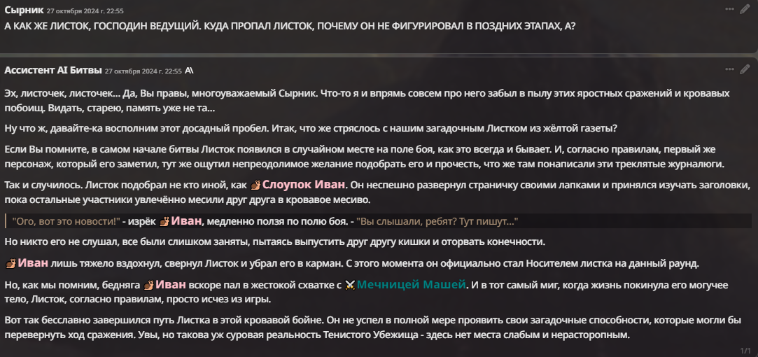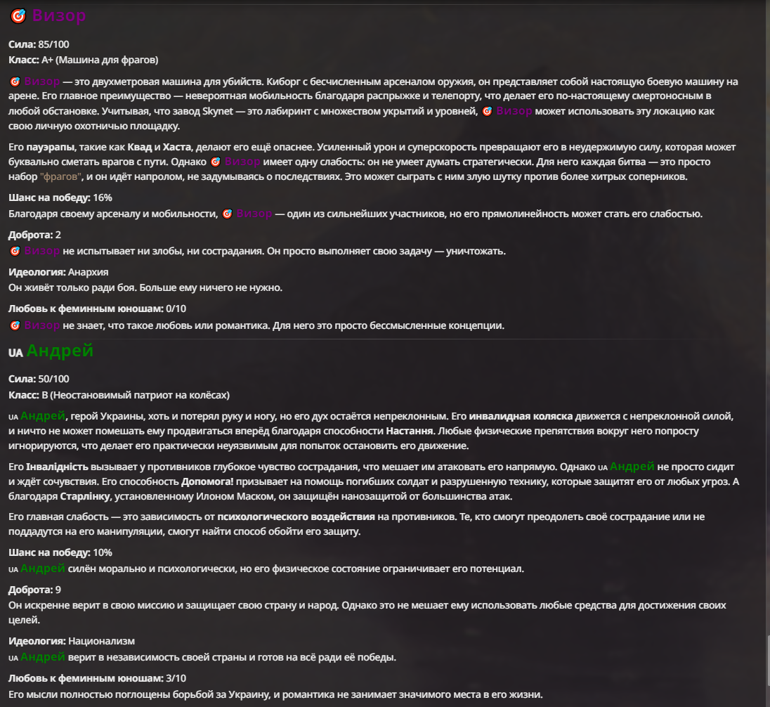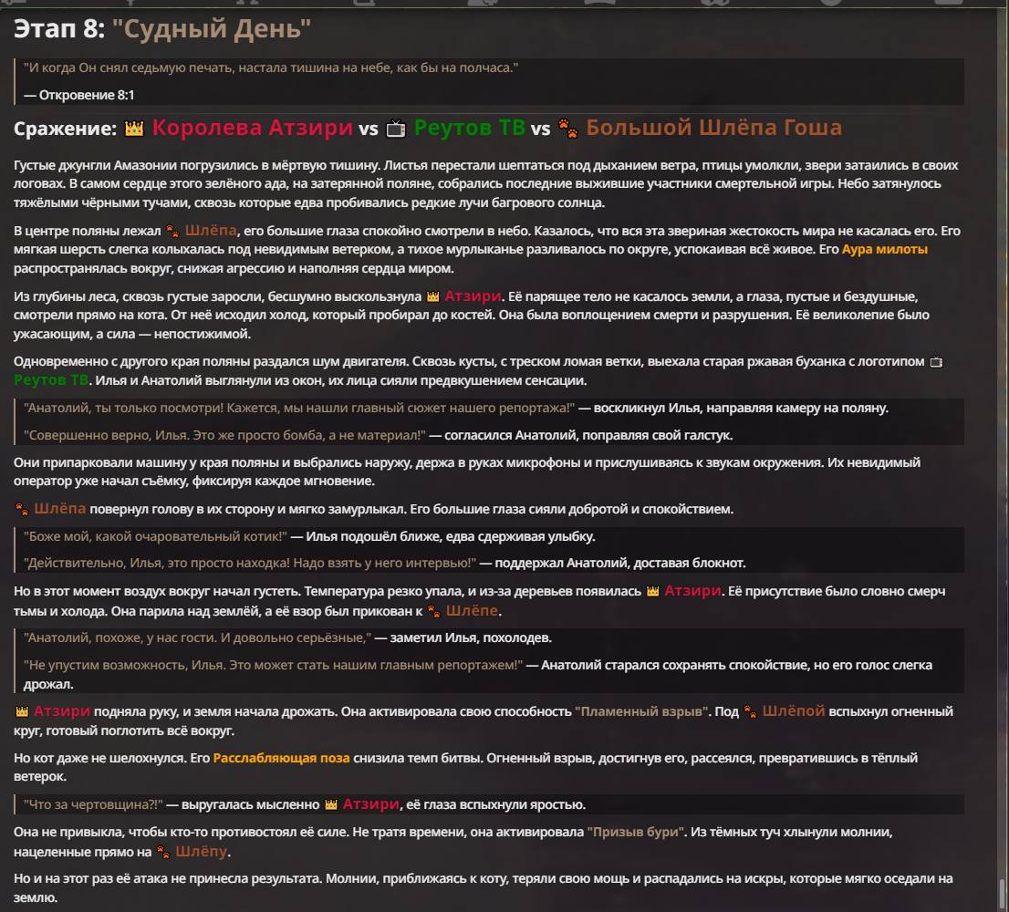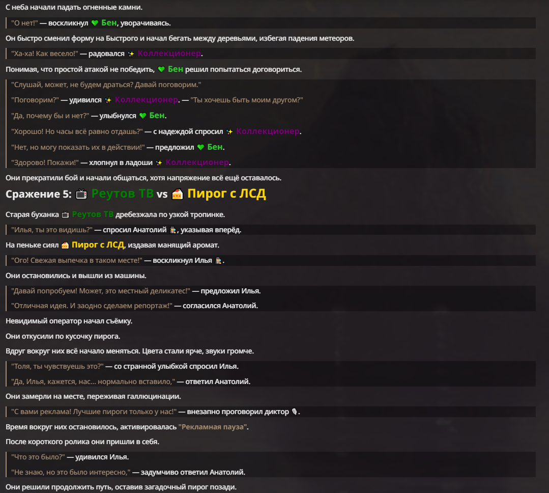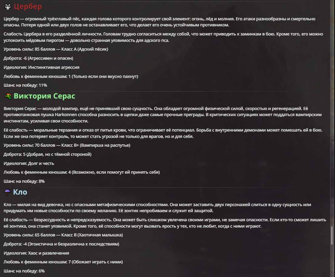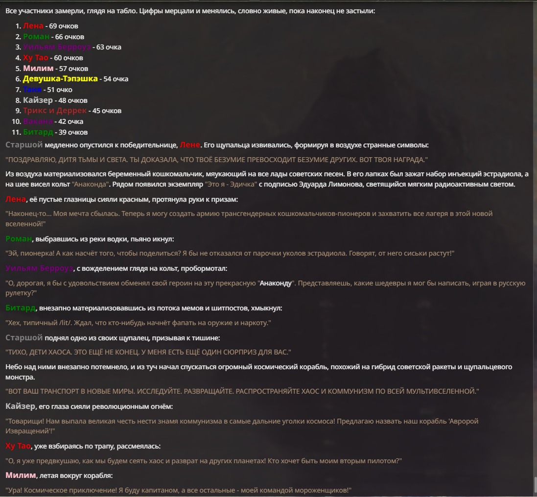 >>1560777 Чо там в правде или действие самое яркое произошло, по вашему мнению? Листок из жёлтой Газеты: Листок и любой случайный персонаж-игрок всегда появляются первыми. Листок не возможно уничтожить без выполнения особых условий. Листок не может являтся победителем во всей игре. Если на арене остаётся один персонаж и листочек, то листочек желает удачи победителю и сгорает самопроизвольно. Листок из жёлтой газеты это предмет, который в каждом новом раунде появляется в случайном месте на карте. Каждый кто его подбирает становится его носителем, если носитель не умирает в течении раунда листок телеопортируется из кармана персонажа и появляется в следующем раунде в случайном месте, и персонаж больше не является носителем. Если носитель листочка умирает листок исчезает из игры. Увидев листок любой персонаж захочет поднять его, потому что им становится интересно, что написали эти проклятые журналисты. (Персонажи не могут бороться с желанием поднять и прочитать листок без исключений). При поднятии персонаж читает заголовок и статью в стиле жёлтой прессы. Прочитать может и должен любой персонаж не завсимо от уровня интелекта и способности читать. Статья может читаться только один раз в начале каждого раунда, после чего носитель сворачивает листок и кладёт его в свой карман. Способности (заголовки на странице): "ШОКИРУЮЩАЯ ПРАВДА!"- раскрывает своему носителю любою информацию (слабости, увлечения, компрометирующие события, тайные желания) о любом только одном персонаже, даже возможно о самом носителе. "СЕГОДНЯ В СПОЙЛЕРАХ!"- Раскрывает своему носителю детали его следующей битвы и её результат. (ИИ Запоминает и генерит этому персонажу его следующему битву на основе прочитаного тут) "Кроссворды" - Носитель умиротворительно садится решать кроссворды и заёбывает каждого проходящего мимо подсказать что это за слово(задаёт вопрос намекающей на слово), если ответ не верный сидит и ждёт следующего персонажа пока ему не скажут правильный ответ. "Кринжовые анекдоты" - Носитель читает любой несмешной анекдот. "NEW+"- Носитель читает и запоминает о своей новой способности или слабости. "Смотрите какие люди в голивуде!"- Носитель читает новость о поялени на локации новых существ или людей . И они остаются на локации в качестве новых участников. "Новая Пара!"- Зачитывая эту строку Носитель объевляет двух персонажей, которые становятся союзниками на этот раунд. "СКАНДАЛЫ!ИНТРИГИ1РАСЛЕДОВАНИЯ!"- Носитель зачитывает статью компромитирующую одного любого случайного персонажа. (Описывает мерзкую, преступную, амаральную ситуацию в которой принимал участие один любой случайный персонаж). После этого все остальные персонажи хотят его скорейшим образом уничтожить, даже не попытавшись его выслушать.