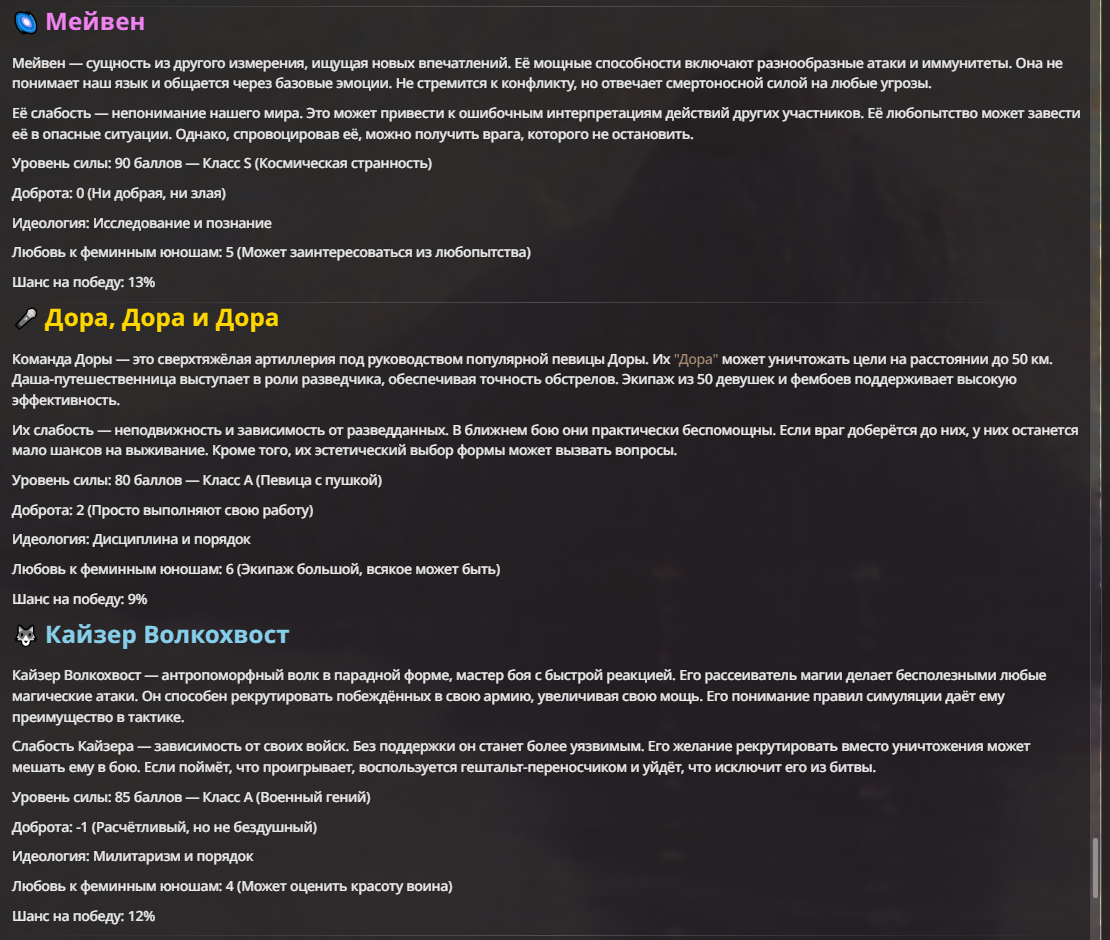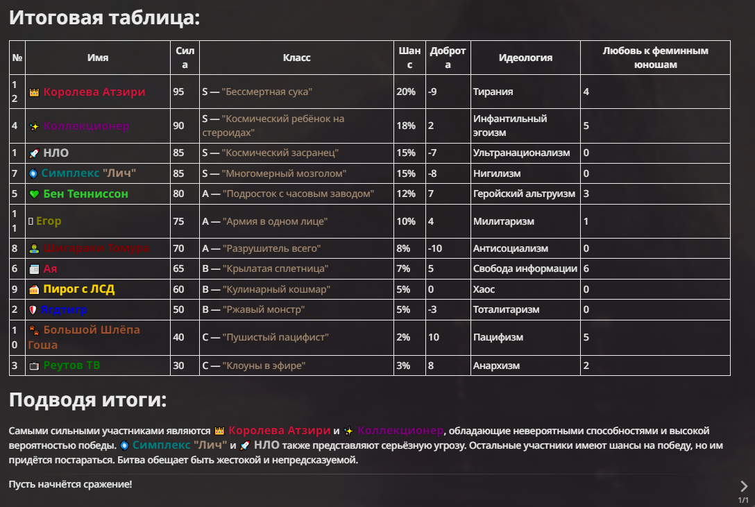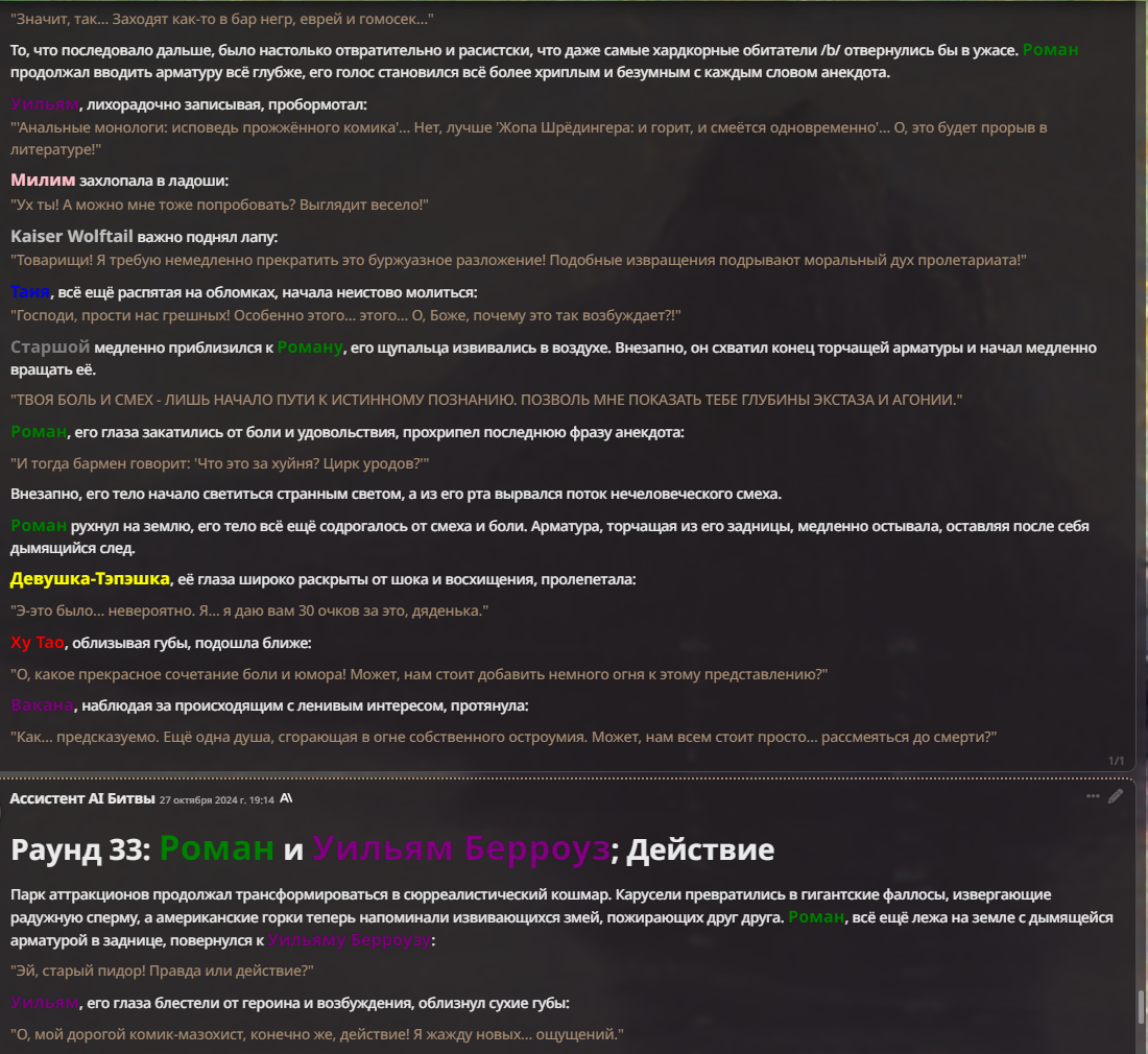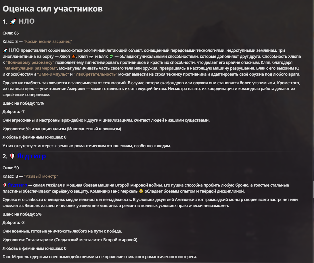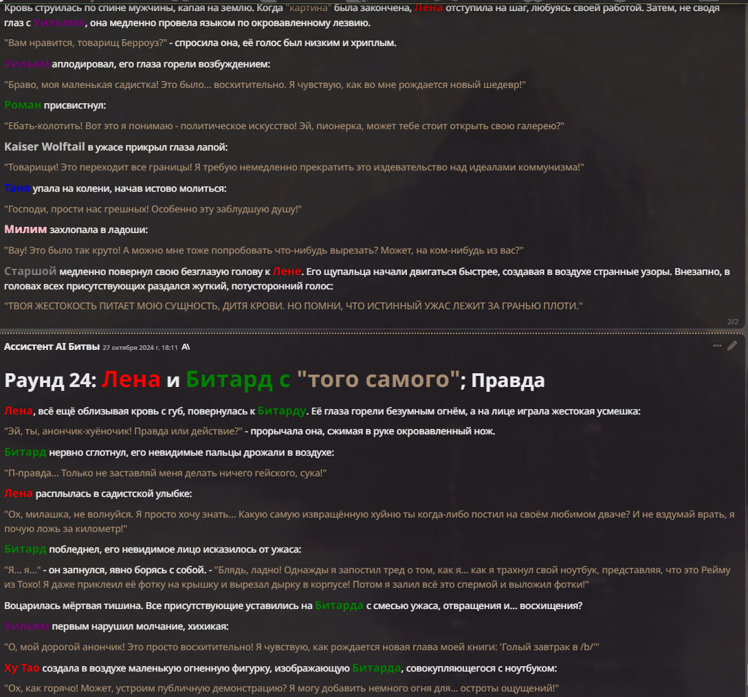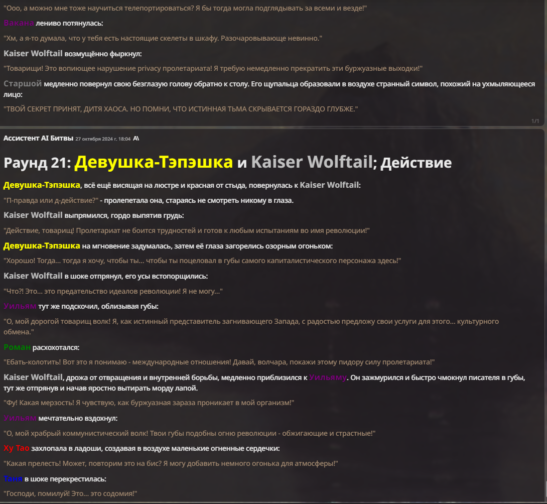 >>1560777 Чо там в правде или действие самое яркое произошло, по вашему мнению? Листок из жёлтой Газеты: Листок и любой случайный персонаж-игрок всегда появляются первыми. Листок не возможно уничтожить без выполнения особых условий. Листок не может являтся победителем во всей игре. Если на арене остаётся один персонаж и листочек, то листочек желает удачи победителю и сгорает самопроизвольно. Листок из жёлтой газеты это предмет, который в каждом новом раунде появляется в случайном месте на карте. Каждый кто его подбирает становится его носителем, если носитель не умирает в течении раунда листок телеопортируется из кармана персонажа и появляется в следующем раунде в случайном месте, и персонаж больше не является носителем. Если носитель листочка умирает листок исчезает из игры. Увидев листок любой персонаж захочет поднять его, потому что им становится интересно, что написали эти проклятые журналисты. (Персонажи не могут бороться с желанием поднять и прочитать листок без исключений). При поднятии персонаж читает заголовок и статью в стиле жёлтой прессы. Прочитать может и должен любой персонаж не завсимо от уровня интелекта и способности читать. Статья может читаться только один раз в начале каждого раунда, после чего носитель сворачивает листок и кладёт его в свой карман. Способности (заголовки на странице): "ШОКИРУЮЩАЯ ПРАВДА!"- раскрывает своему носителю любою информацию (слабости, увлечения, компрометирующие события, тайные желания) о любом только одном персонаже, даже возможно о самом носителе. "СЕГОДНЯ В СПОЙЛЕРАХ!"- Раскрывает своему носителю детали его следующей битвы и её результат. (ИИ Запоминает и генерит этому персонажу его следующему битву на основе прочитаного тут) "Кроссворды" - Носитель умиротворительно садится решать кроссворды и заёбывает каждого проходящего мимо подсказать что это за слово(задаёт вопрос намекающей на слово), если ответ не верный сидит и ждёт следующего персонажа пока ему не скажут правильный ответ. "Кринжовые анекдоты" - Носитель читает любой несмешной анекдот. "NEW+"- Носитель читает и запоминает о своей новой способности или слабости. "Смотрите какие люди в голивуде!"- Носитель читает новость о поялени на локации новых существ или людей . И они остаются на локации в качестве новых участников. "Новая Пара!"- Зачитывая эту строку Носитель объевляет двух персонажей, которые становятся союзниками на этот раунд. "СКАНДАЛЫ!ИНТРИГИ1РАСЛЕДОВАНИЯ!"- Носитель зачитывает статью компромитирующую одного любого случайного персонажа. (Описывает мерзкую, преступную, амаральную ситуацию в которой принимал участие один любой случайный персонаж). После этого все остальные персонажи хотят его скорейшим образом уничтожить, даже не попытавшись его выслушать.