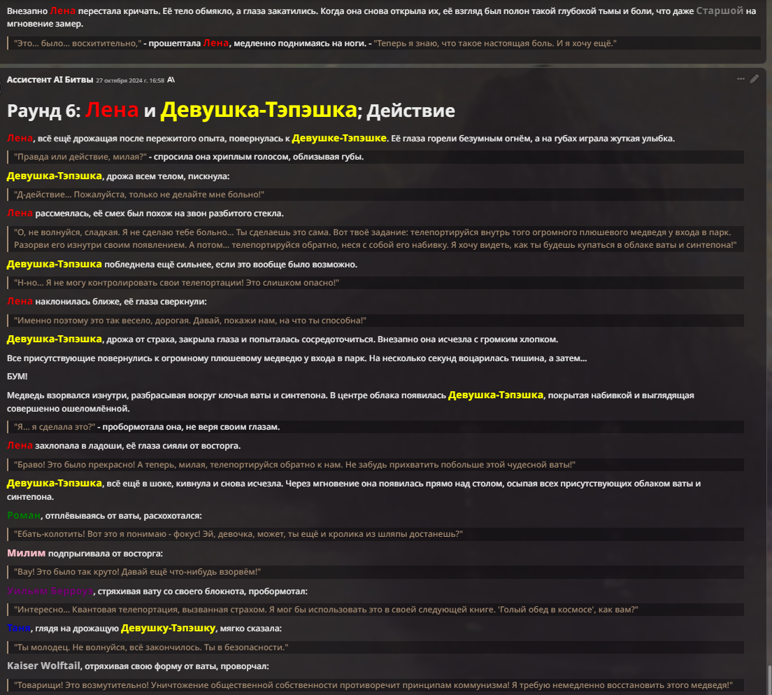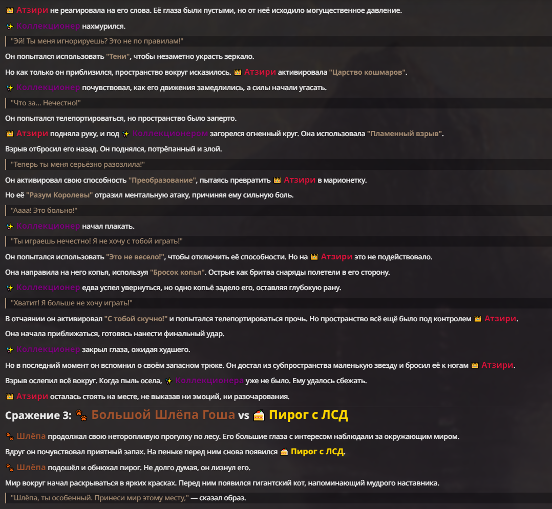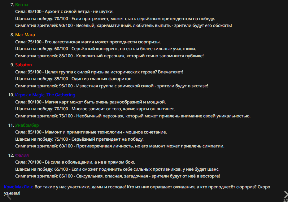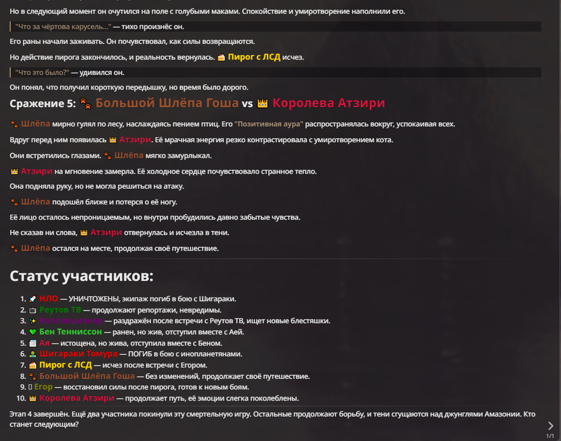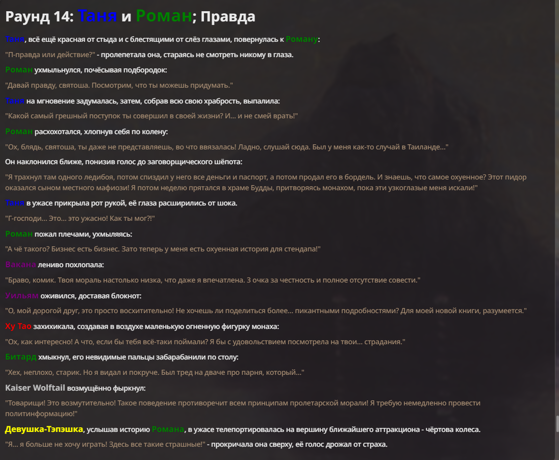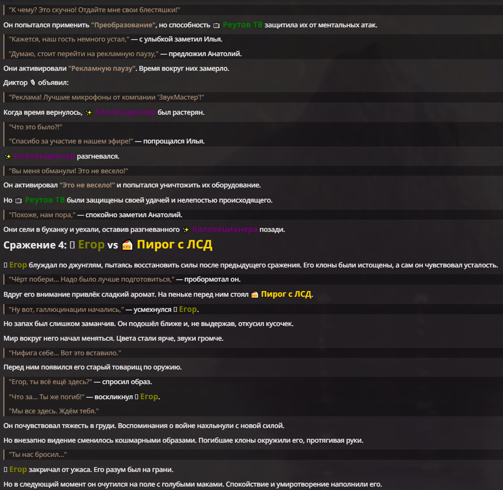 >>1560777 Чо там в правде или действие самое яркое произошло, по вашему мнению? Листок из жёлтой Газеты: Листок и любой случайный персонаж-игрок всегда появляются первыми. Листок не возможно уничтожить без выполнения особых условий. Листок не может являтся победителем во всей игре. Если на арене остаётся один персонаж и листочек, то листочек желает удачи победителю и сгорает самопроизвольно. Листок из жёлтой газеты это предмет, который в каждом новом раунде появляется в случайном месте на карте. Каждый кто его подбирает становится его носителем, если носитель не умирает в течении раунда листок телеопортируется из кармана персонажа и появляется в следующем раунде в случайном месте, и персонаж больше не является носителем. Если носитель листочка умирает листок исчезает из игры. Увидев листок любой персонаж захочет поднять его, потому что им становится интересно, что написали эти проклятые журналисты. (Персонажи не могут бороться с желанием поднять и прочитать листок без исключений). При поднятии персонаж читает заголовок и статью в стиле жёлтой прессы. Прочитать может и должен любой персонаж не завсимо от уровня интелекта и способности читать. Статья может читаться только один раз в начале каждого раунда, после чего носитель сворачивает листок и кладёт его в свой карман. Способности (заголовки на странице): "ШОКИРУЮЩАЯ ПРАВДА!"- раскрывает своему носителю любою информацию (слабости, увлечения, компрометирующие события, тайные желания) о любом только одном персонаже, даже возможно о самом носителе. "СЕГОДНЯ В СПОЙЛЕРАХ!"- Раскрывает своему носителю детали его следующей битвы и её результат. (ИИ Запоминает и генерит этому персонажу его следующему битву на основе прочитаного тут) "Кроссворды" - Носитель умиротворительно садится решать кроссворды и заёбывает каждого проходящего мимо подсказать что это за слово(задаёт вопрос намекающей на слово), если ответ не верный сидит и ждёт следующего персонажа пока ему не скажут правильный ответ. "Кринжовые анекдоты" - Носитель читает любой несмешной анекдот. "NEW+"- Носитель читает и запоминает о своей новой способности или слабости. "Смотрите какие люди в голивуде!"- Носитель читает новость о поялени на локации новых существ или людей . И они остаются на локации в качестве новых участников. "Новая Пара!"- Зачитывая эту строку Носитель объевляет двух персонажей, которые становятся союзниками на этот раунд. "СКАНДАЛЫ!ИНТРИГИ1РАСЛЕДОВАНИЯ!"- Носитель зачитывает статью компромитирующую одного любого случайного персонажа. (Описывает мерзкую, преступную, амаральную ситуацию в которой принимал участие один любой случайный персонаж). После этого все остальные персонажи хотят его скорейшим образом уничтожить, даже не попытавшись его выслушать.